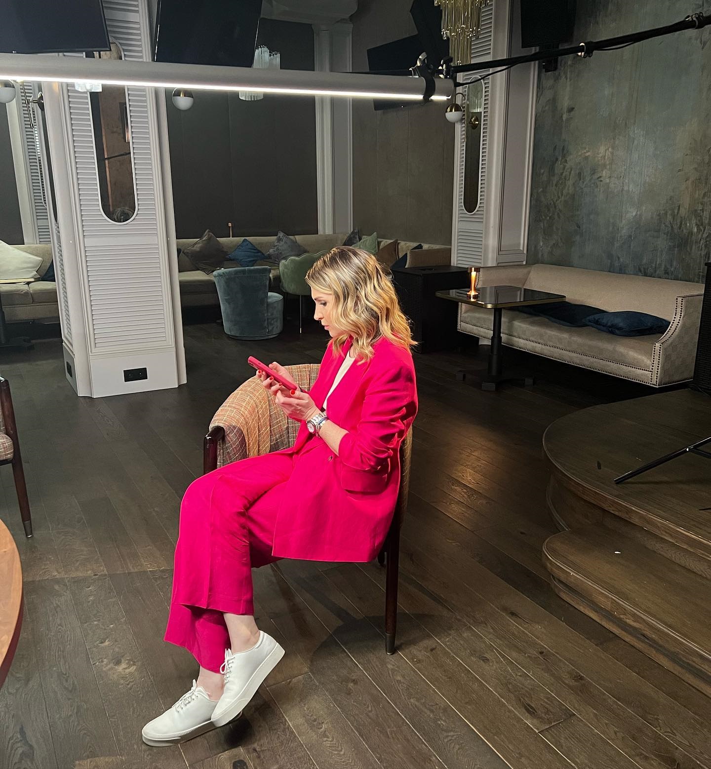 Телеведущая Елена Летучая в костюме насыщенного цвета фуксия