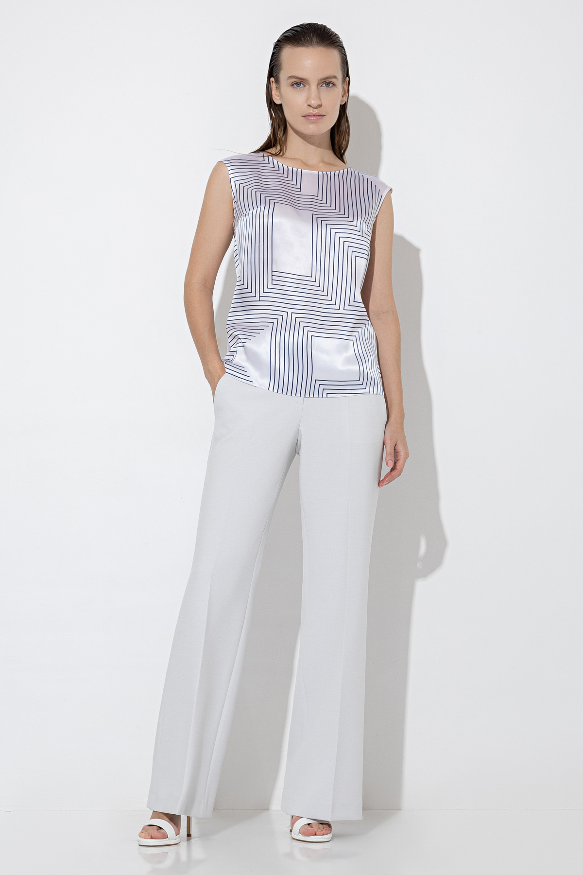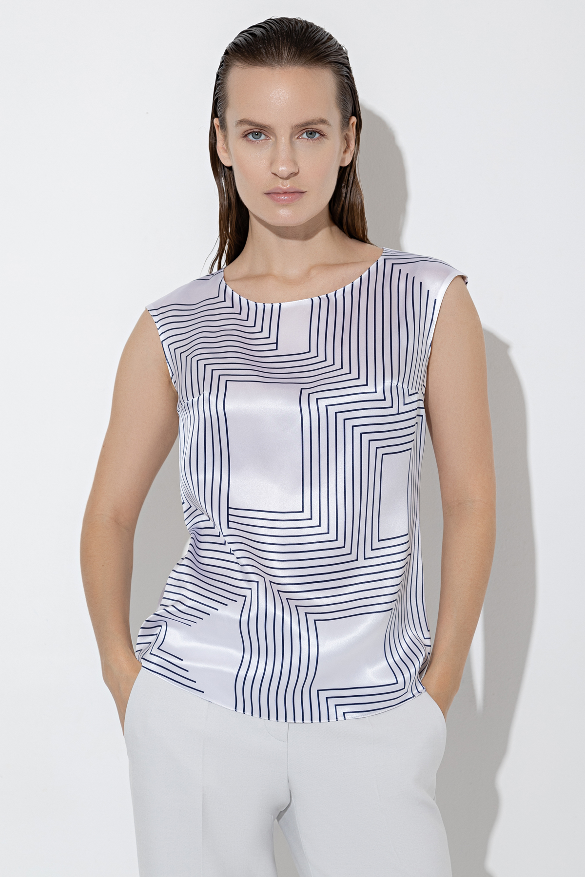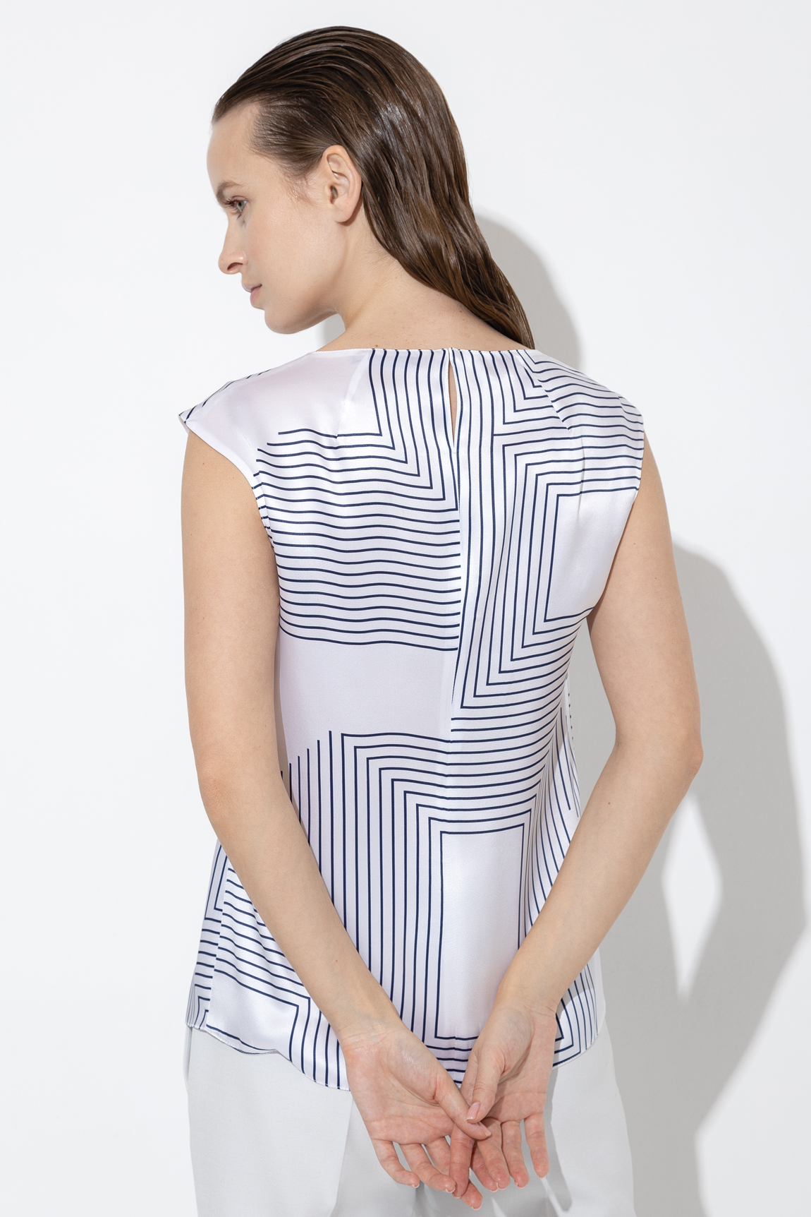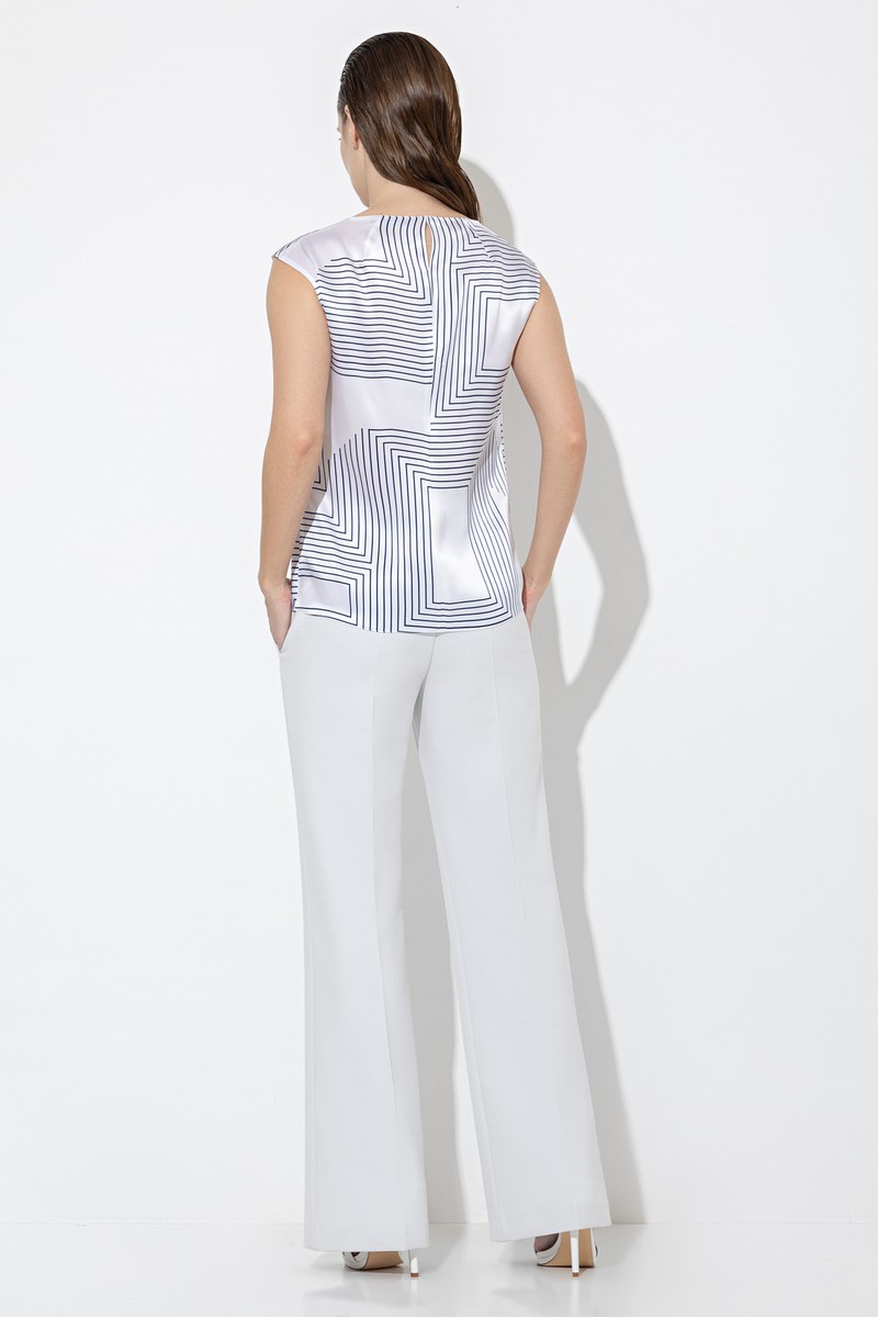 Базовая блузка прямого кроя из 100% шелка с дизайнерским принтом. Струящаяся ткань формирует лаконичный силуэт. Детали: круглый вырез, застежка на металлический крючок.
