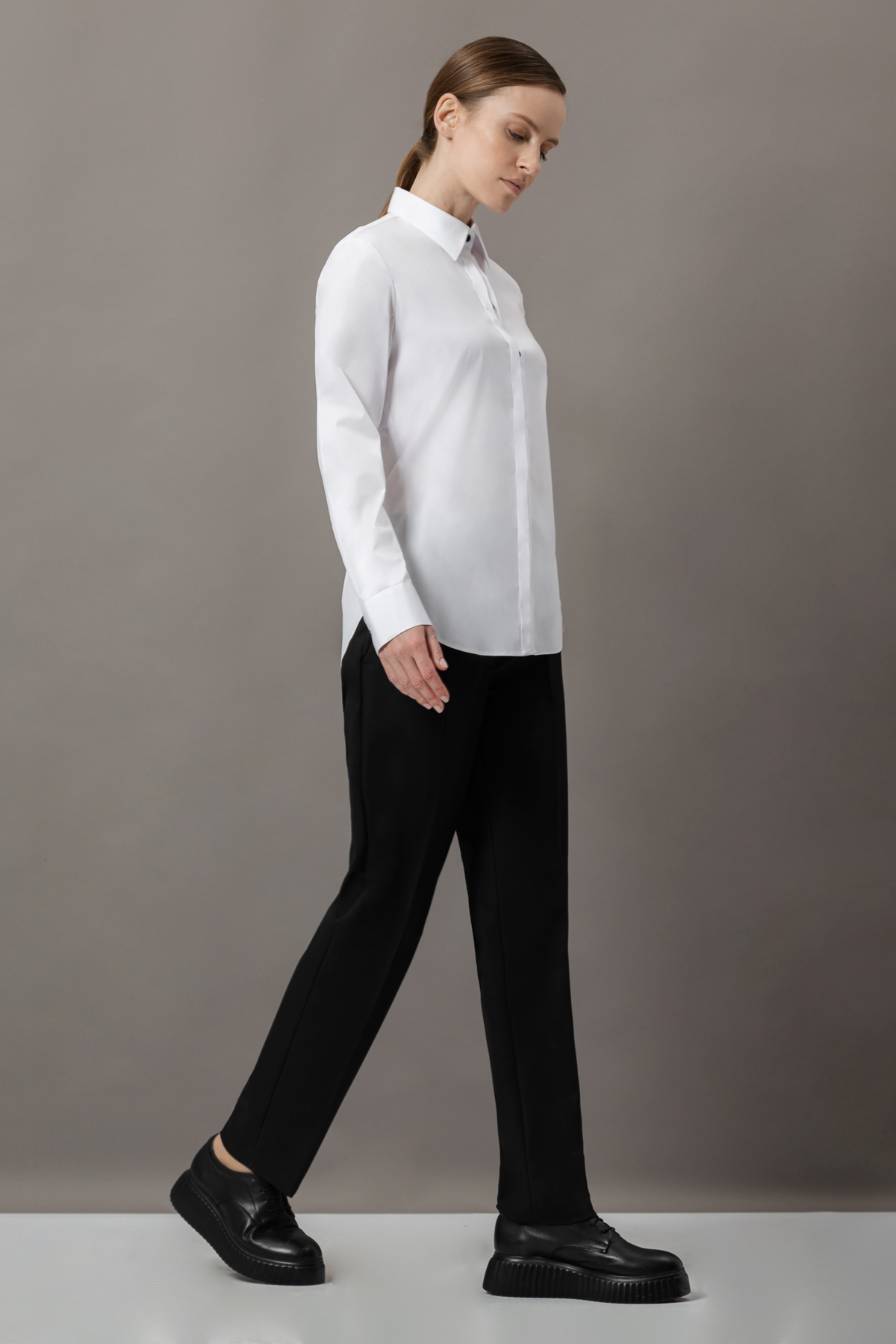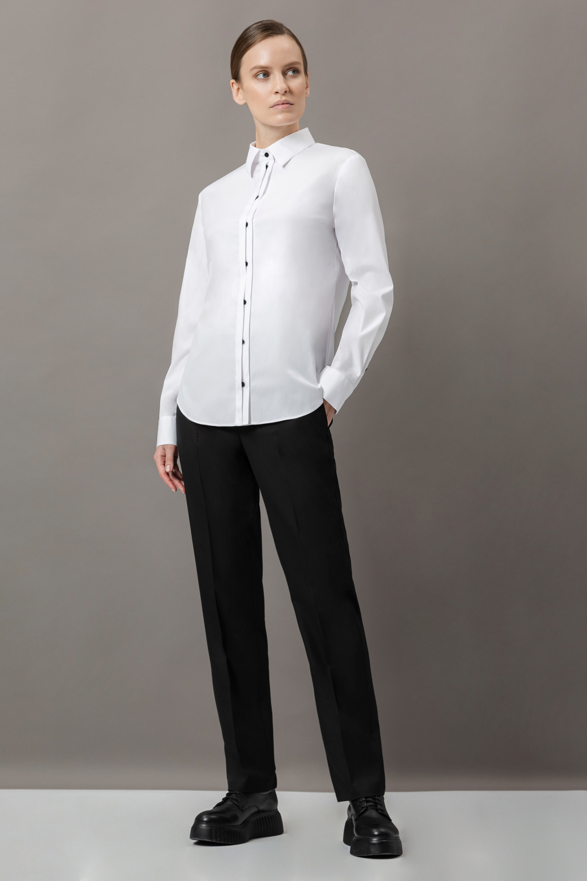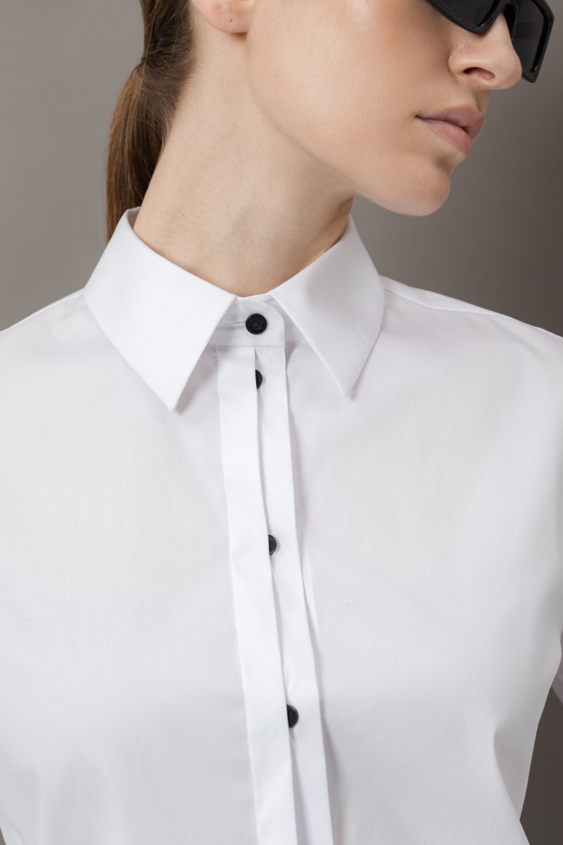 Классическая блузка с добавлением хлопка. Модель прямого кроя дополнена манжетами и рубашечным отложным воротником на стойке. Контрастные пуговицы частично скрыты под дополнительной планкой.