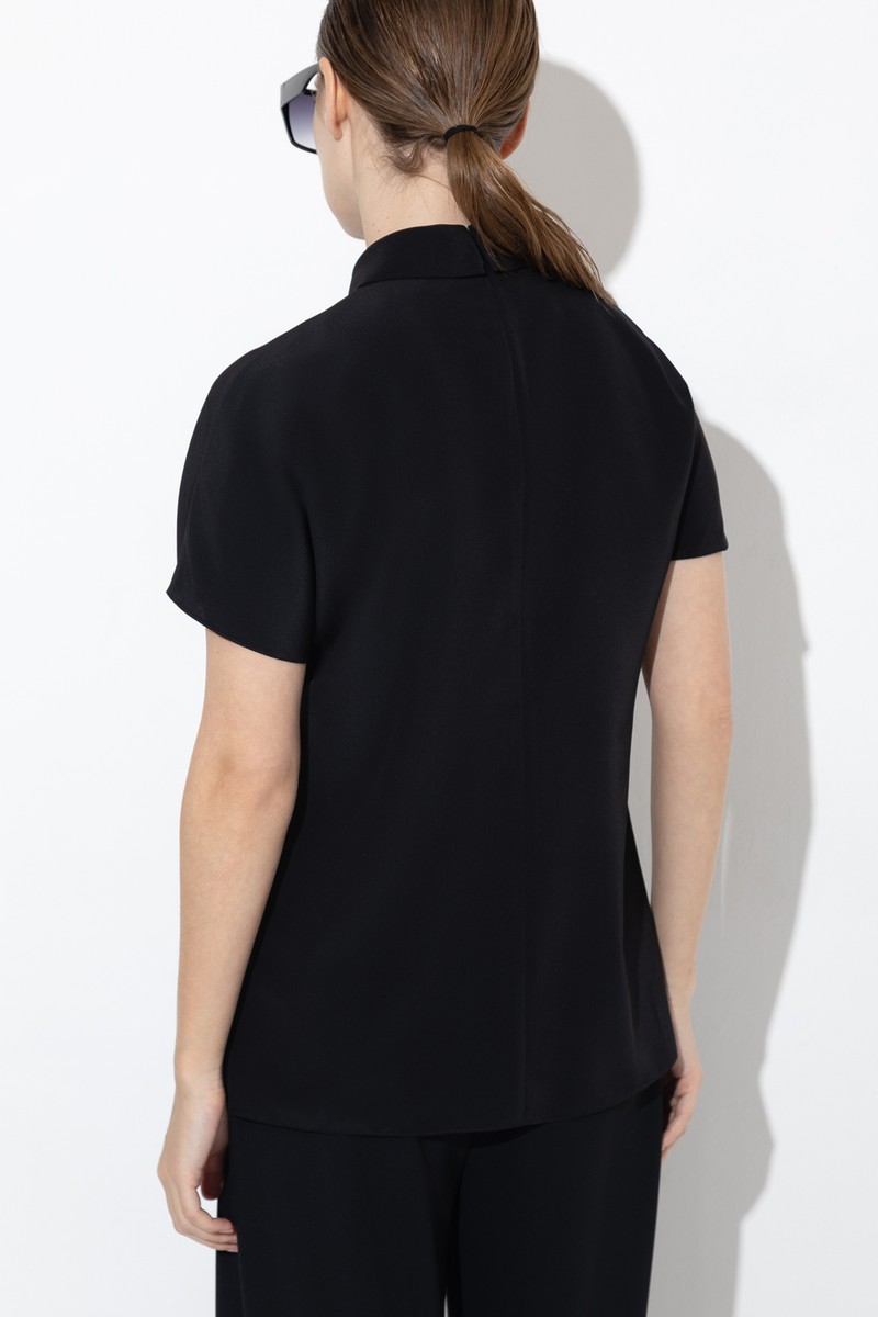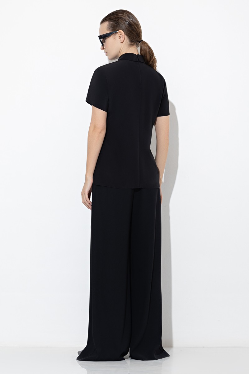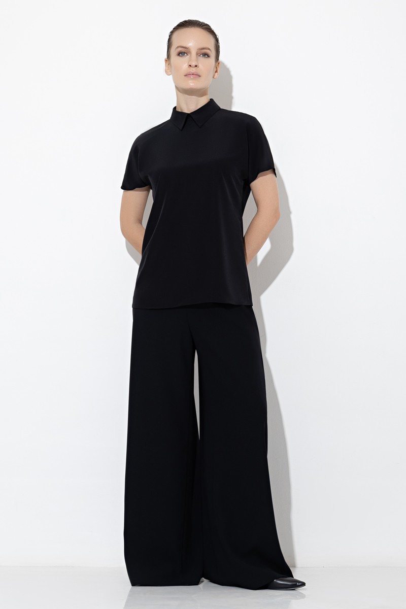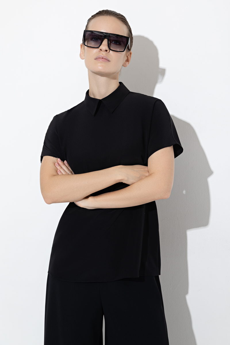 Базовая блузка с коротким рукавом из струящейся ткани. Модель прямого кроя с рубашечным воротником и застежкой на потайную молнию.