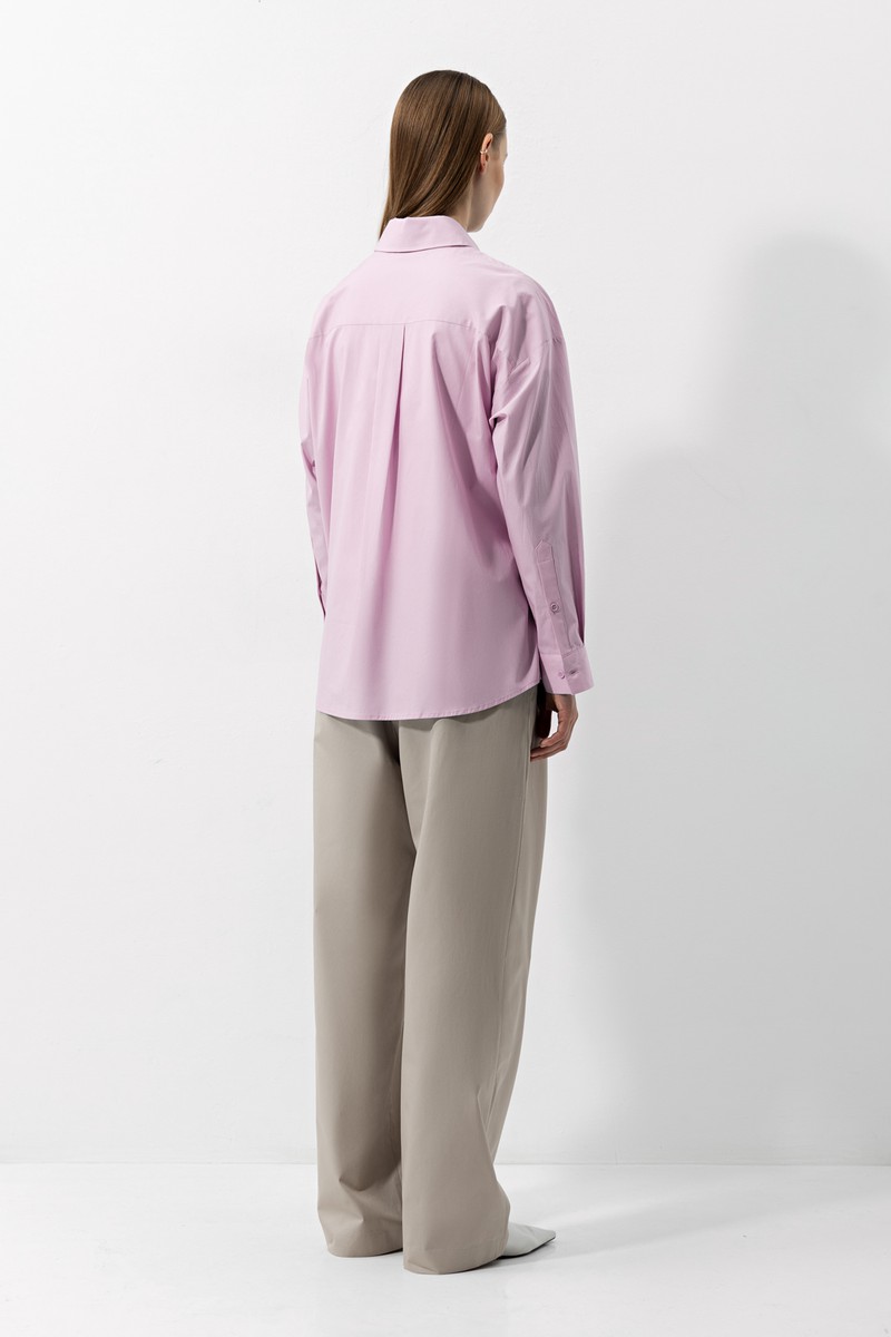 Розовая рубашка свободного кроя из натурального хлопка. Детали: широкие манжеты, рубашечный отложной воротник на стойке и накладной карман. Пуговицы скрыты под дополнительной планкой. Модель отлично дополнит образы с прямыми брюками, классическими юбками и джинсами.