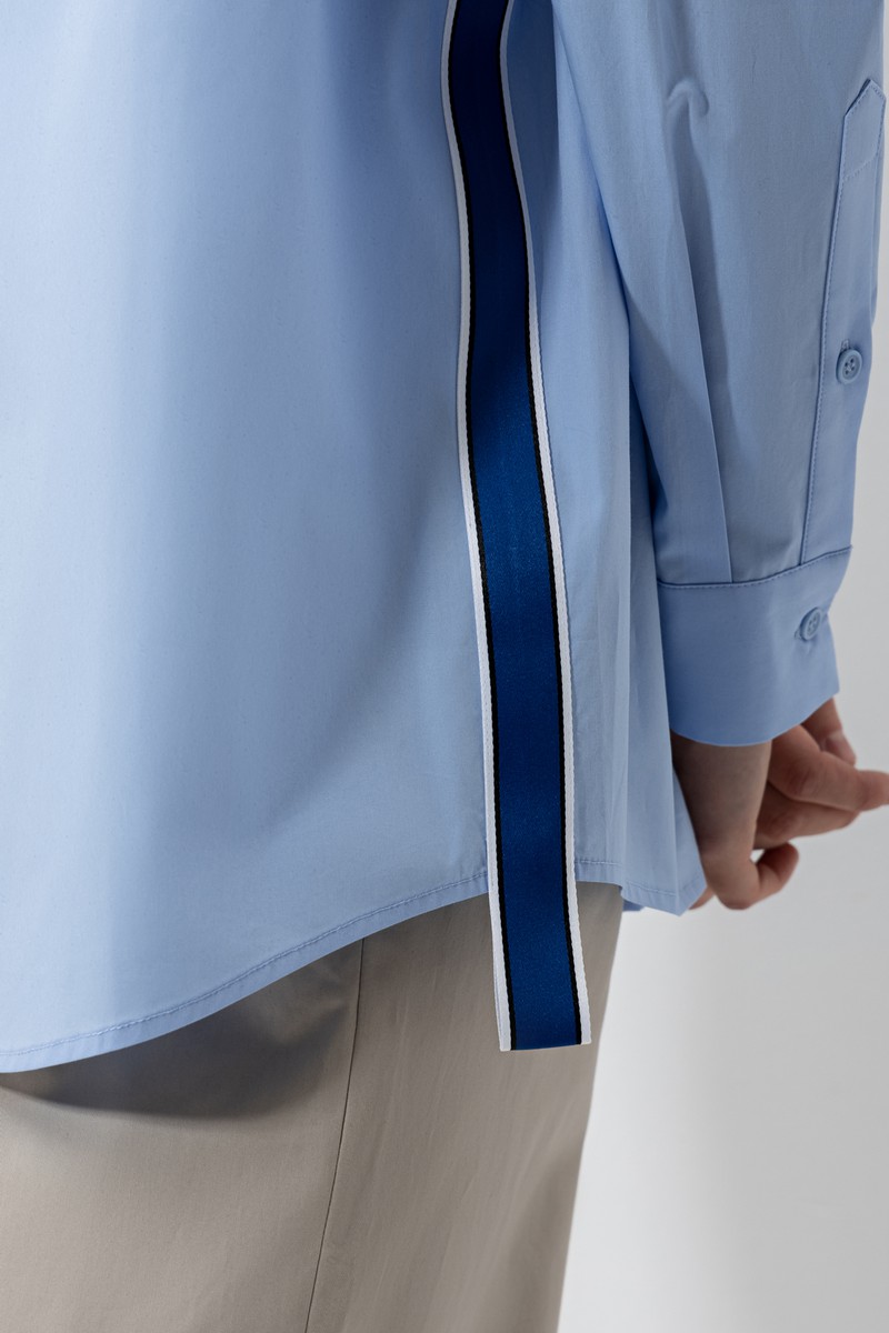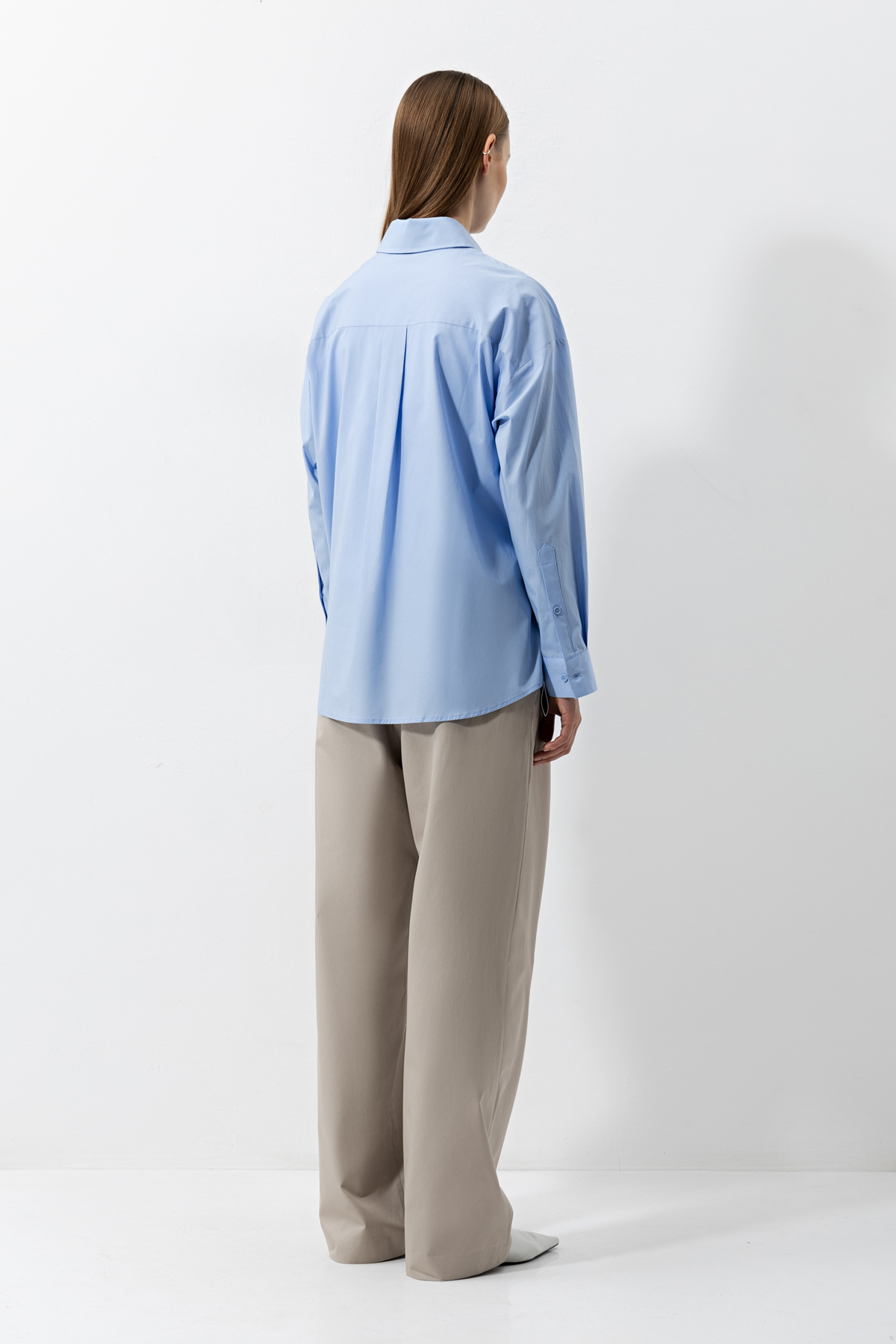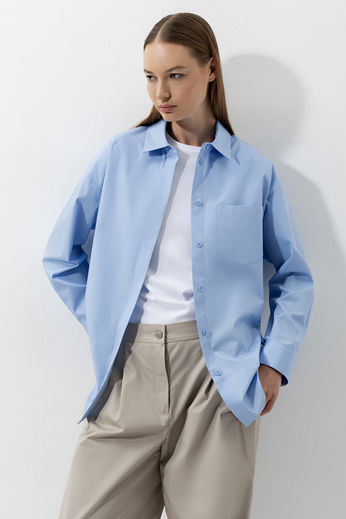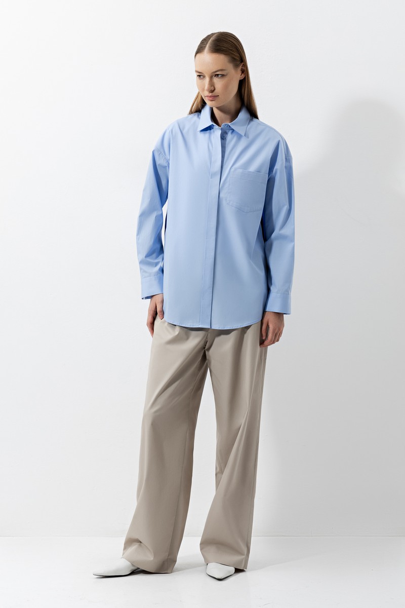 Рубашка с длинными рукавами. Детали: отложный воротник, накладные карманы, контрастная тесьма по бокам. Пуговицы в тон спрятаны под дополнительной планкой. Изделие подходит для стильных повседневных образов. Рубашка представлена в двух оттенках.