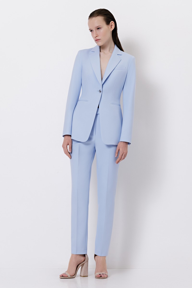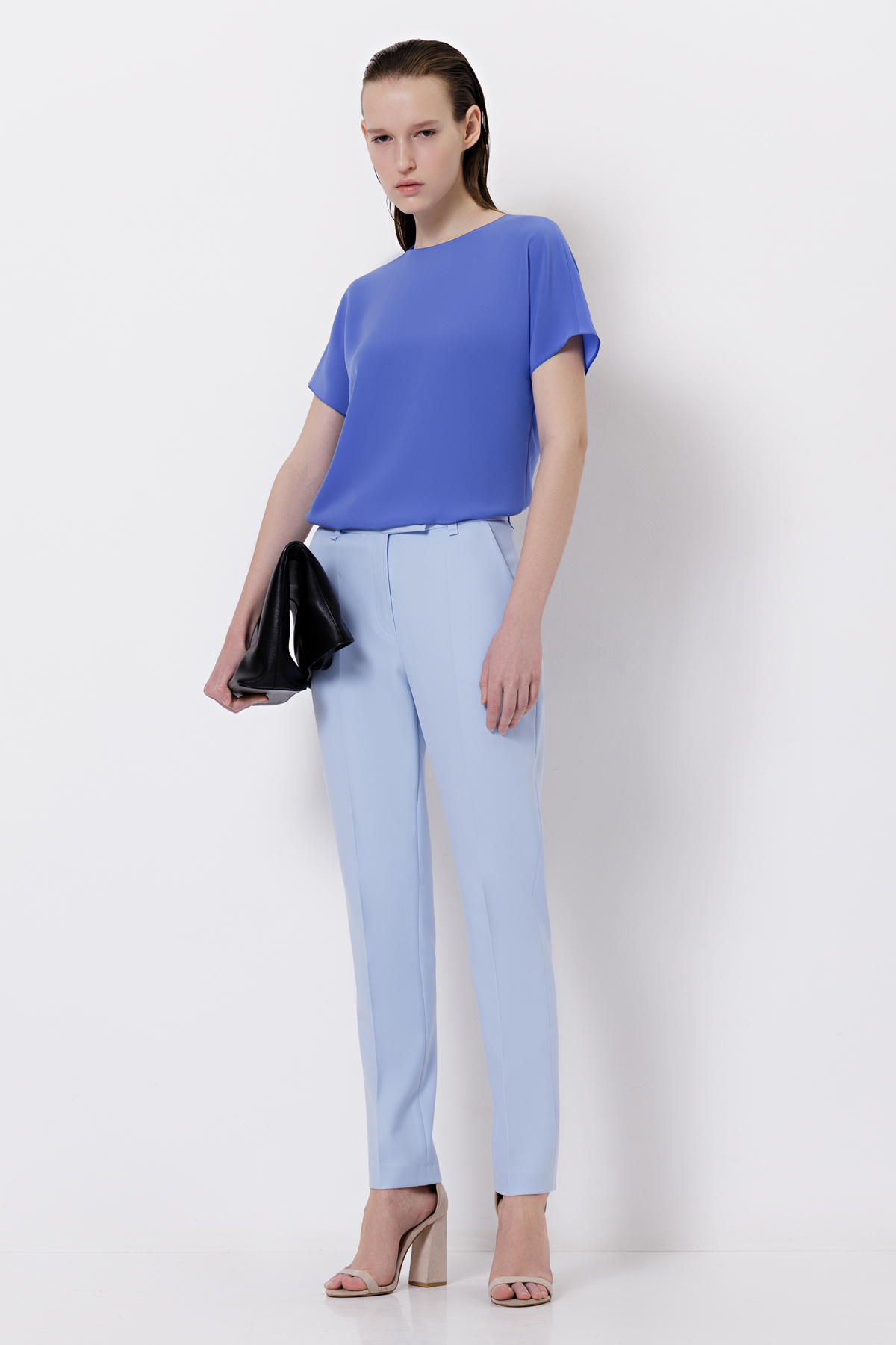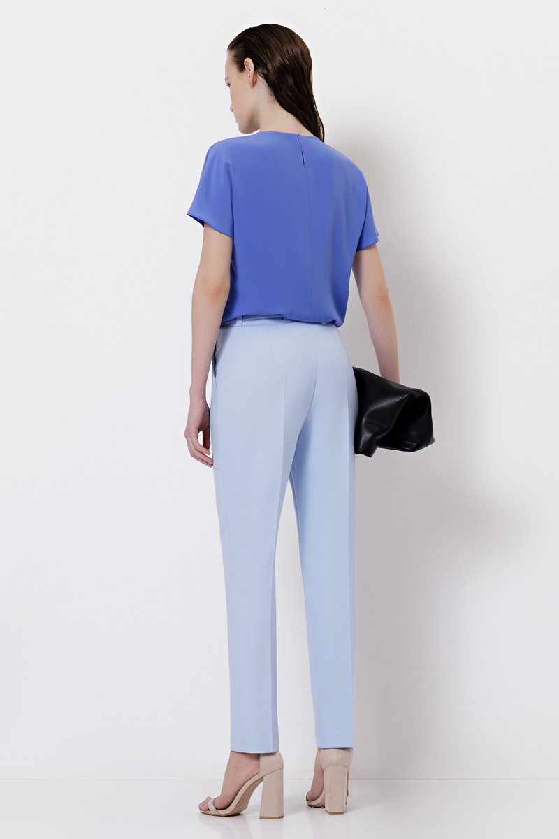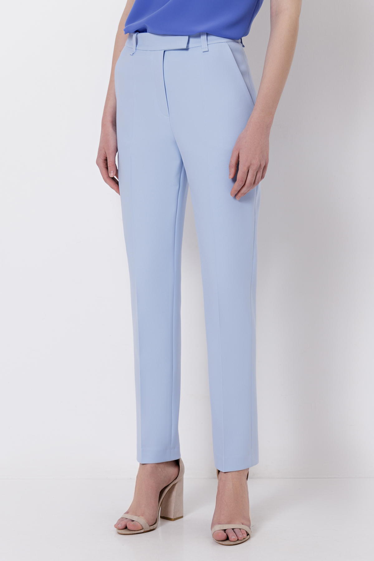 Светло-голубые классические брюки из смесовой ткани с добавлением вискозы и хлопка. Модель дополнена мягким поясом со шлевками, что позволяет носить брюки с ремнем. Создайте идеальный комплект, сочетая брюки с приталенным жакетом из нашей коллекции.