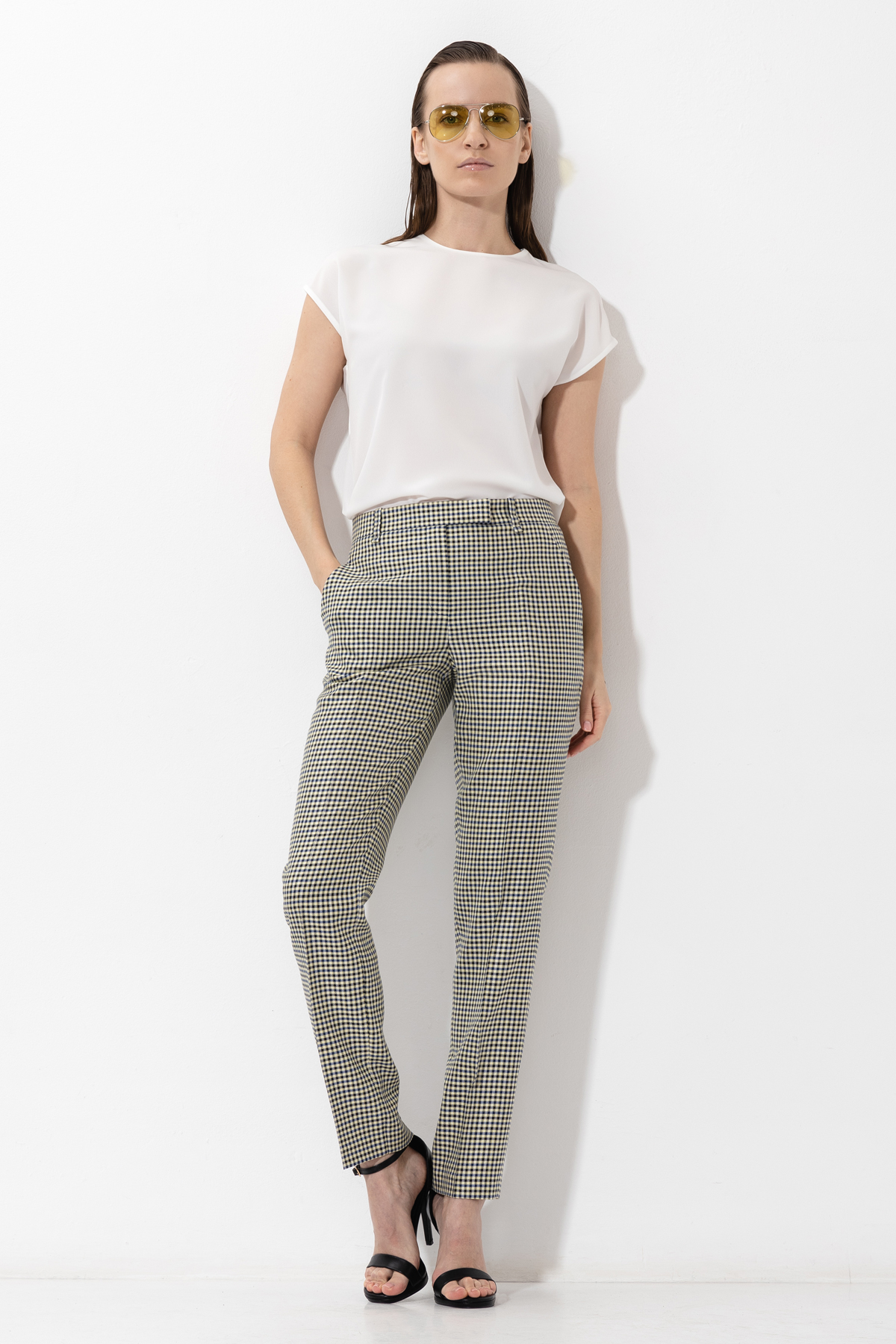 Базовые зауженные брюки в клетку. Детали: стрелки, боковые карманы, застежка на молнию и металлический крючок. Пояс со шлевками позволяет дополнить образ ремнем. В паре с жакетом в тон брюки образуют деловой сет.