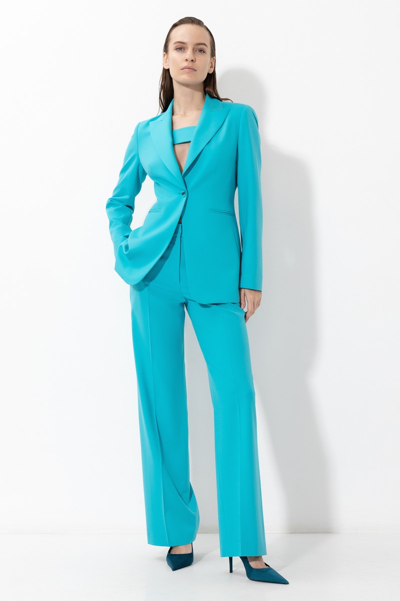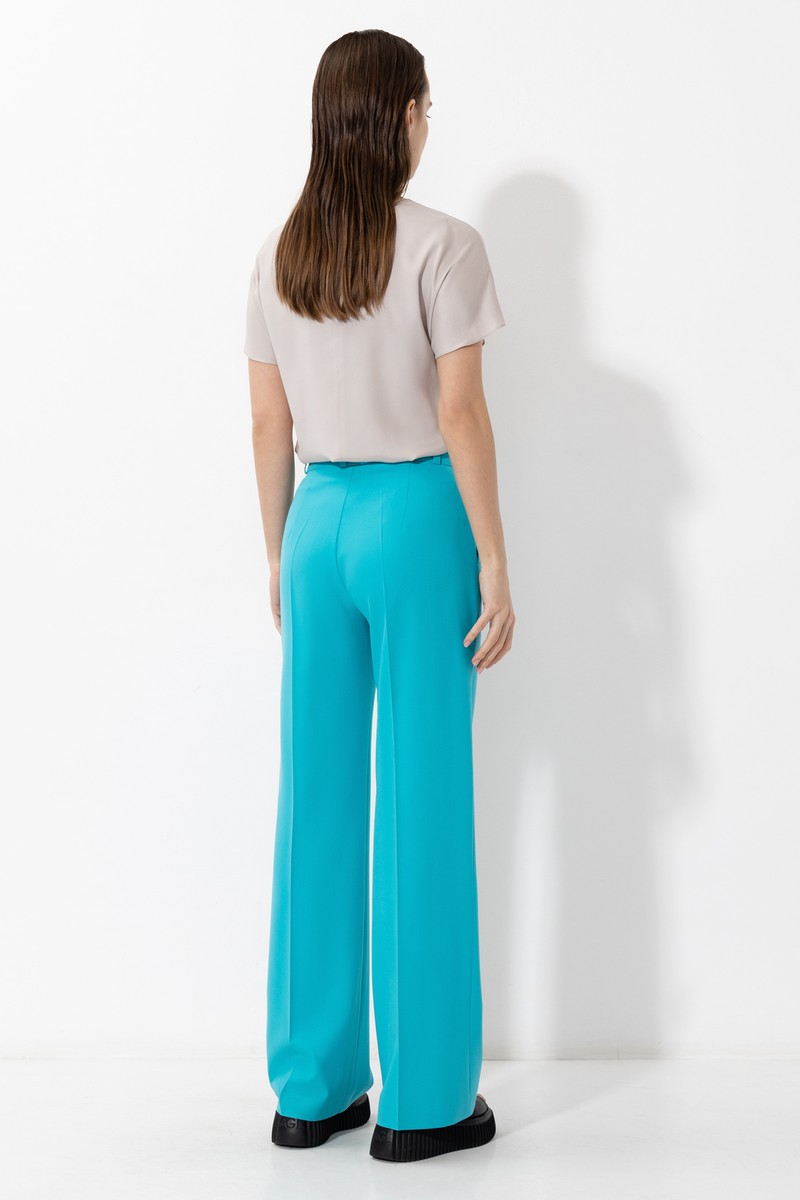 Широкие брюки из смесовой ткани с добавлением вискозы. Модель дополнена стрелками, боковыми карманами и мягким поясом со шлевками, что позволяет носить брюки с ремнем. В коллекции так же представлен жакет, который в паре с брюками формирует классический сет.