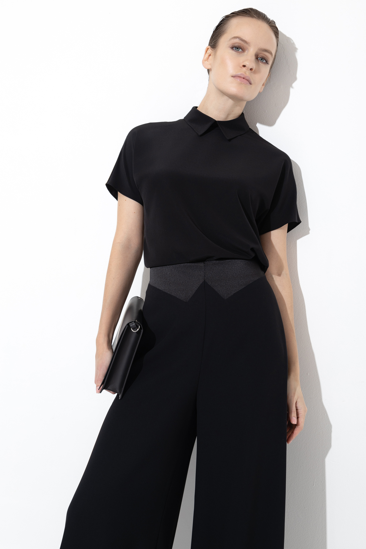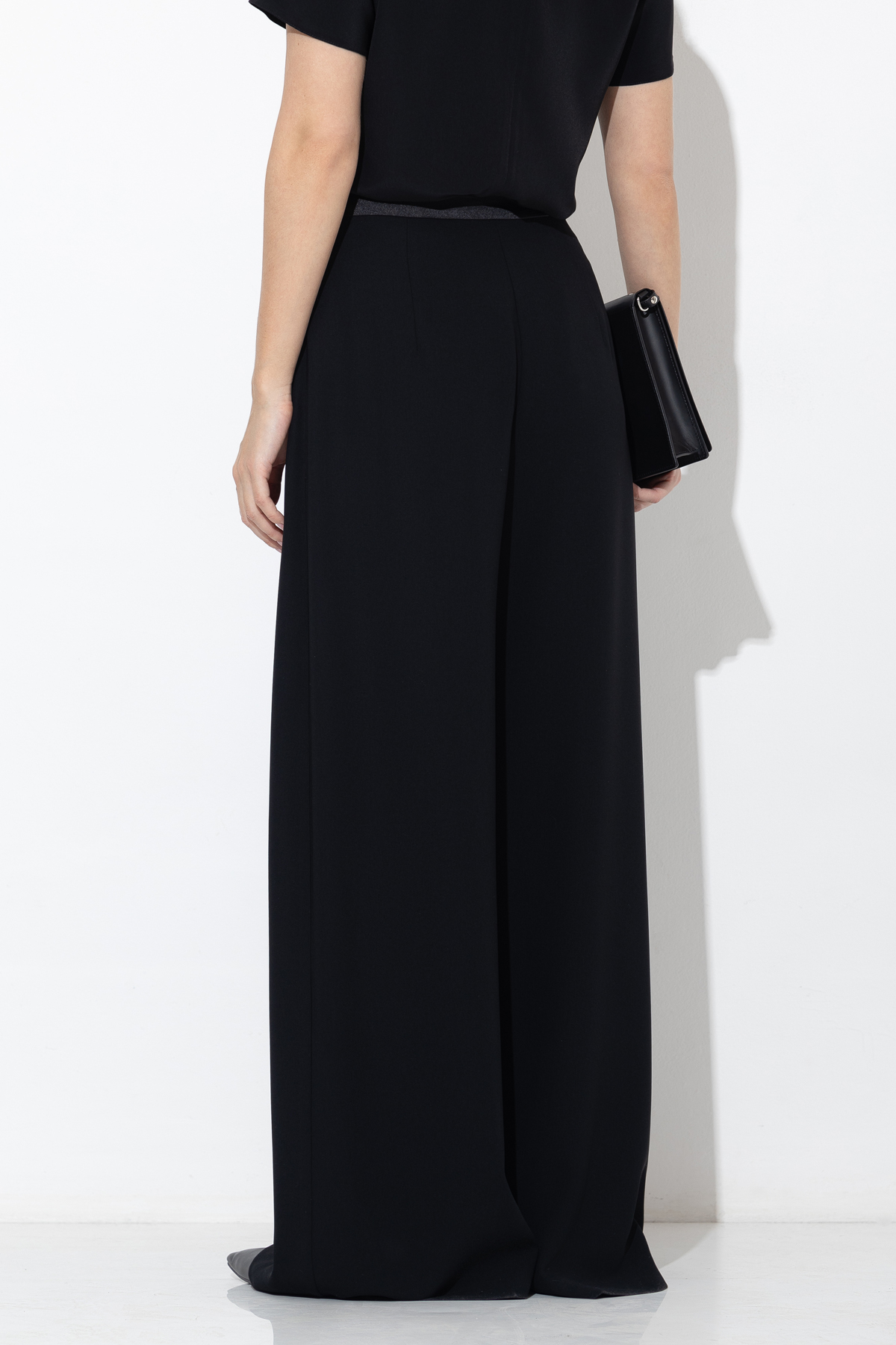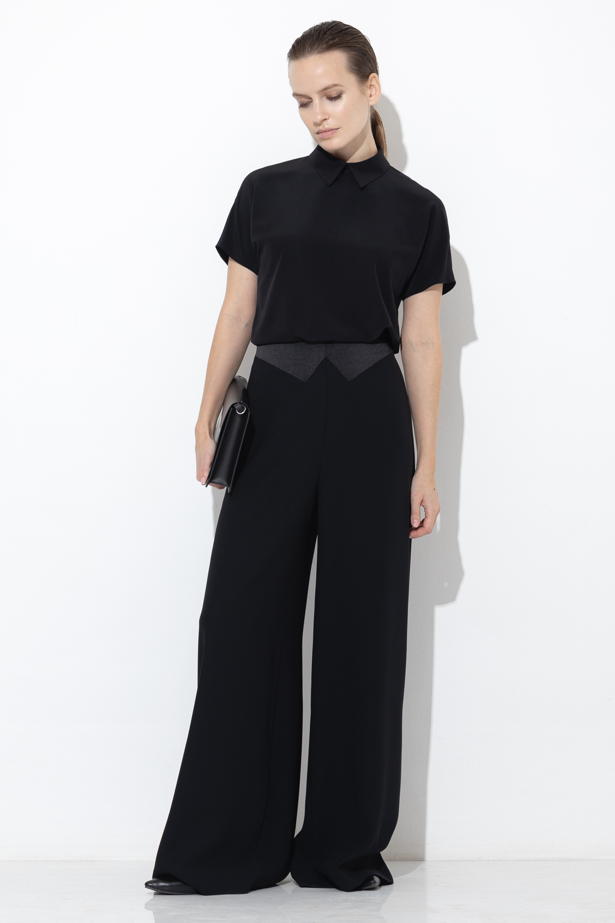 Широкие брюки из струящейся ткани. Детали: боковые карманы и застежка на потайную молнию. Модель с высокой посадкой дополнена кокеткой с легким блеском.