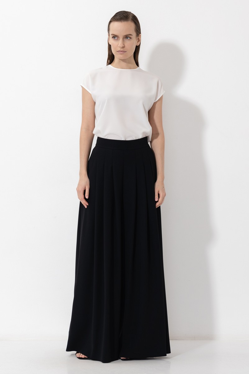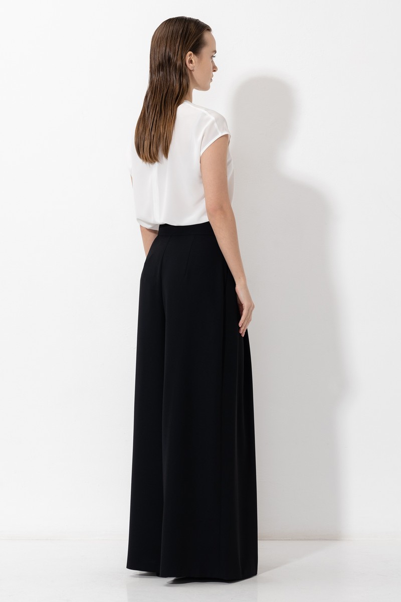 Черные брюки-палаццо, расклешенные от бедра. Модель подходит всем типам фигуры и скрывает несовершенства силуэта. Детали: карманы с отрезным бочком, защипы на передней части изделия и застежка на потайную молнию. Сочетайте брюки с футболками, рубашками и топами.