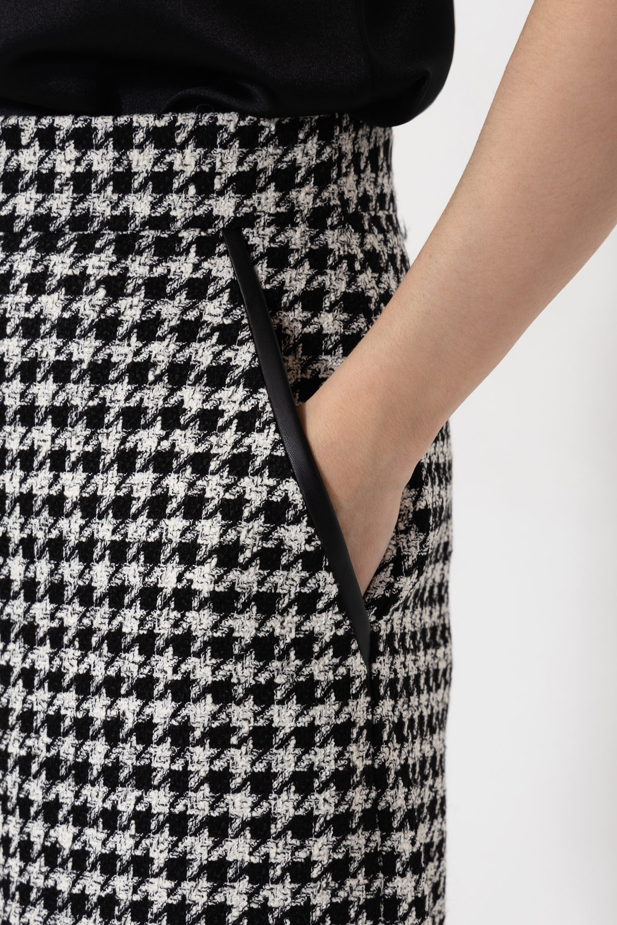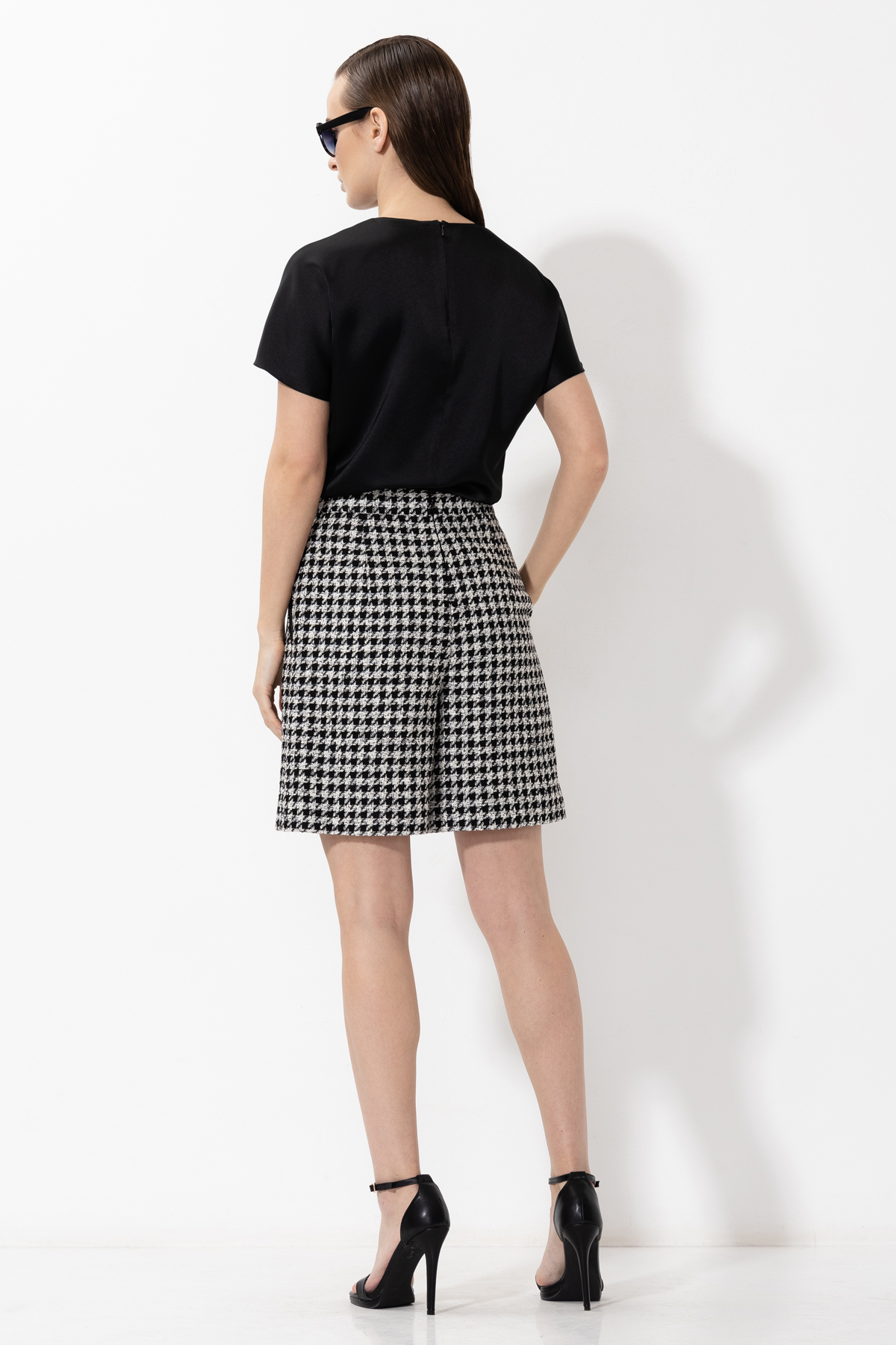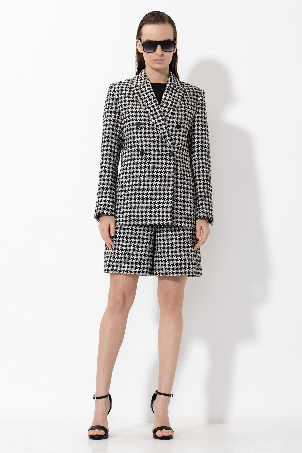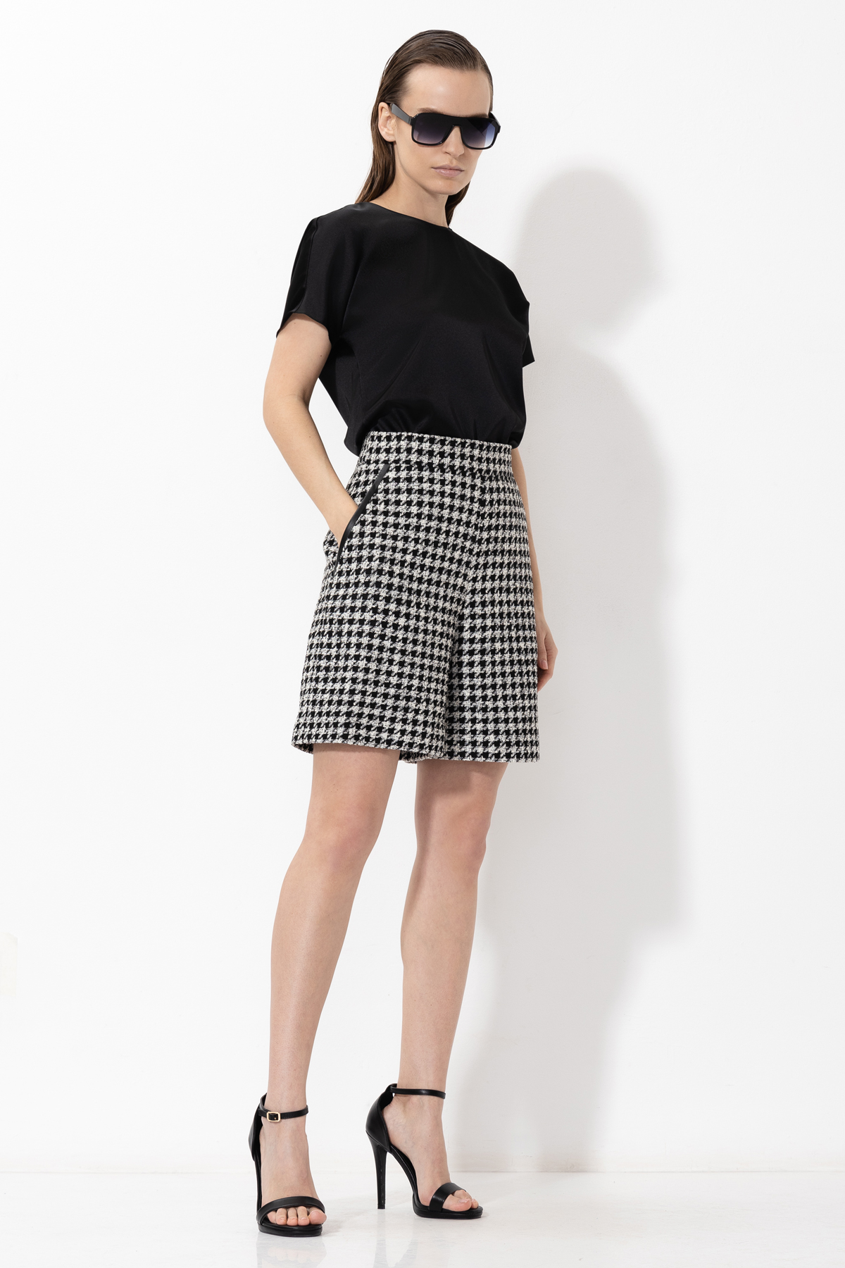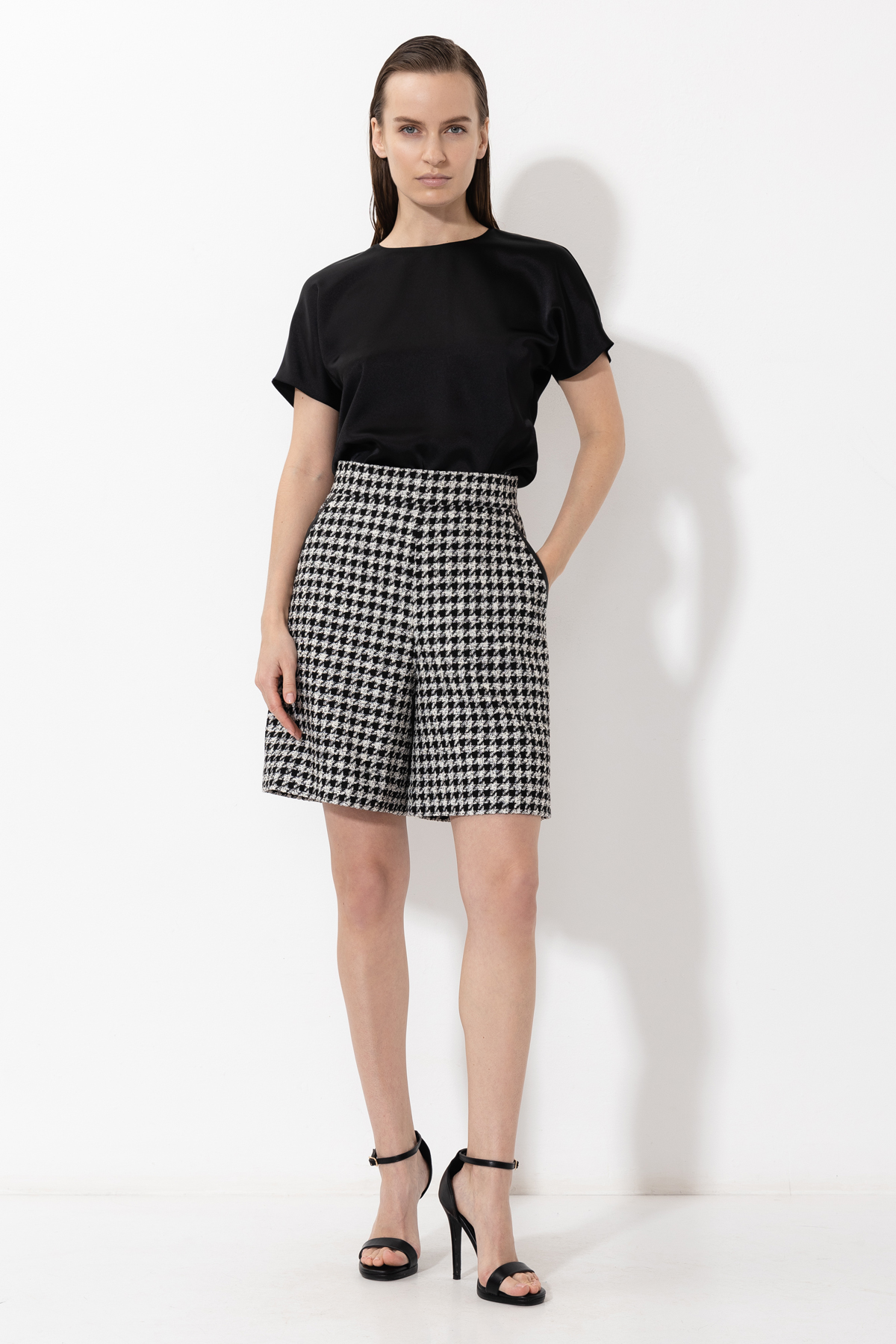 Шорты в гусиную лапку из костюмной ткани с высокой посадкой. Край бокового кармана выделен акцентной кожаной полоской. Детали: широкий мягкий пояс и застежка на потайную молнию. Сочетайте шорты с жакетом из нашей коллекции, чтобы создать актуальный комплект.