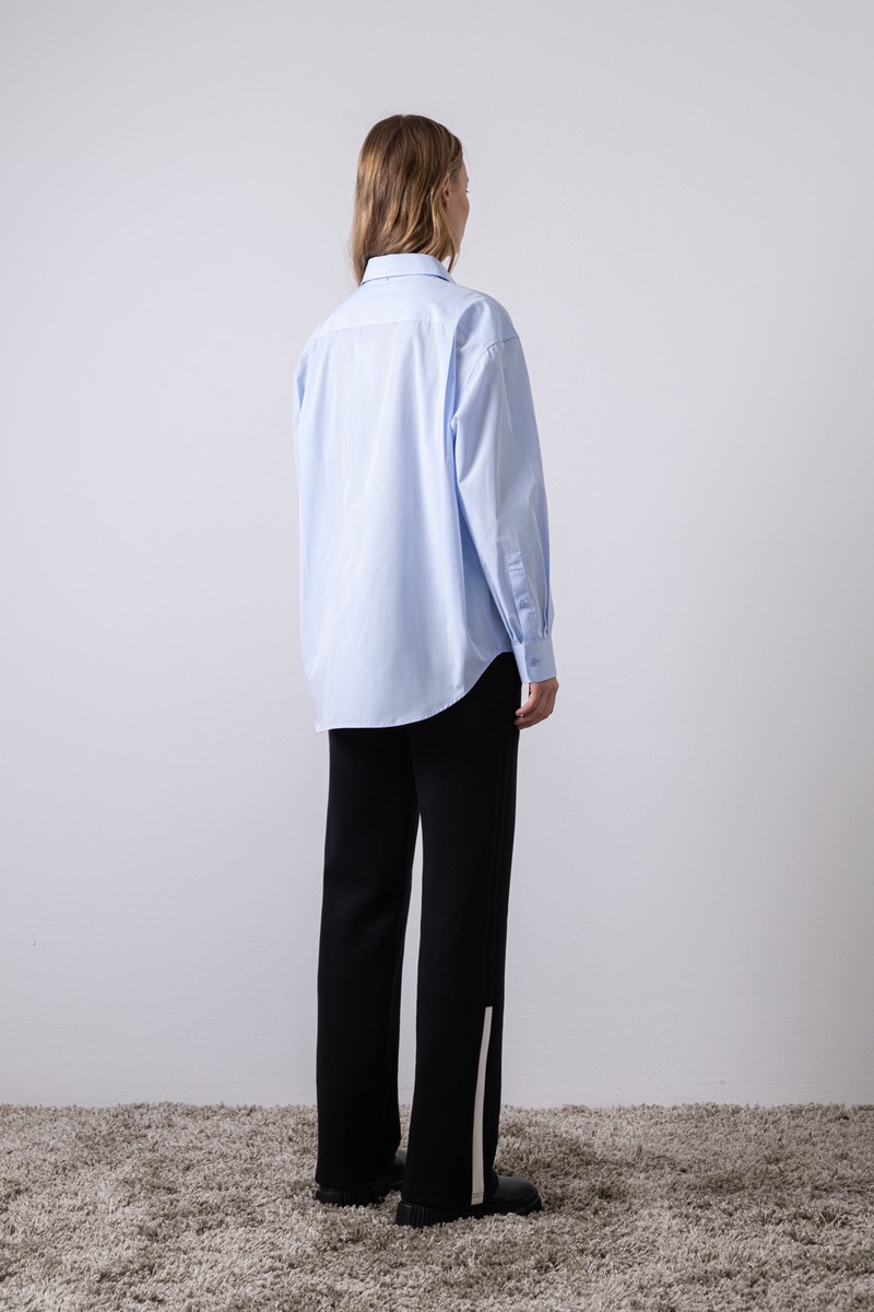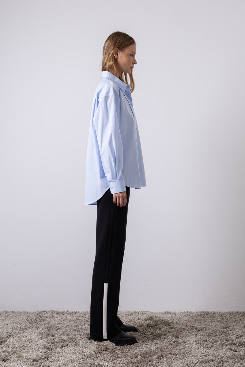 Базовые брюки прямого кроя из смесовой ткани с добавлением хлопка. Модель дополнена контрастными вставками на брючинах.