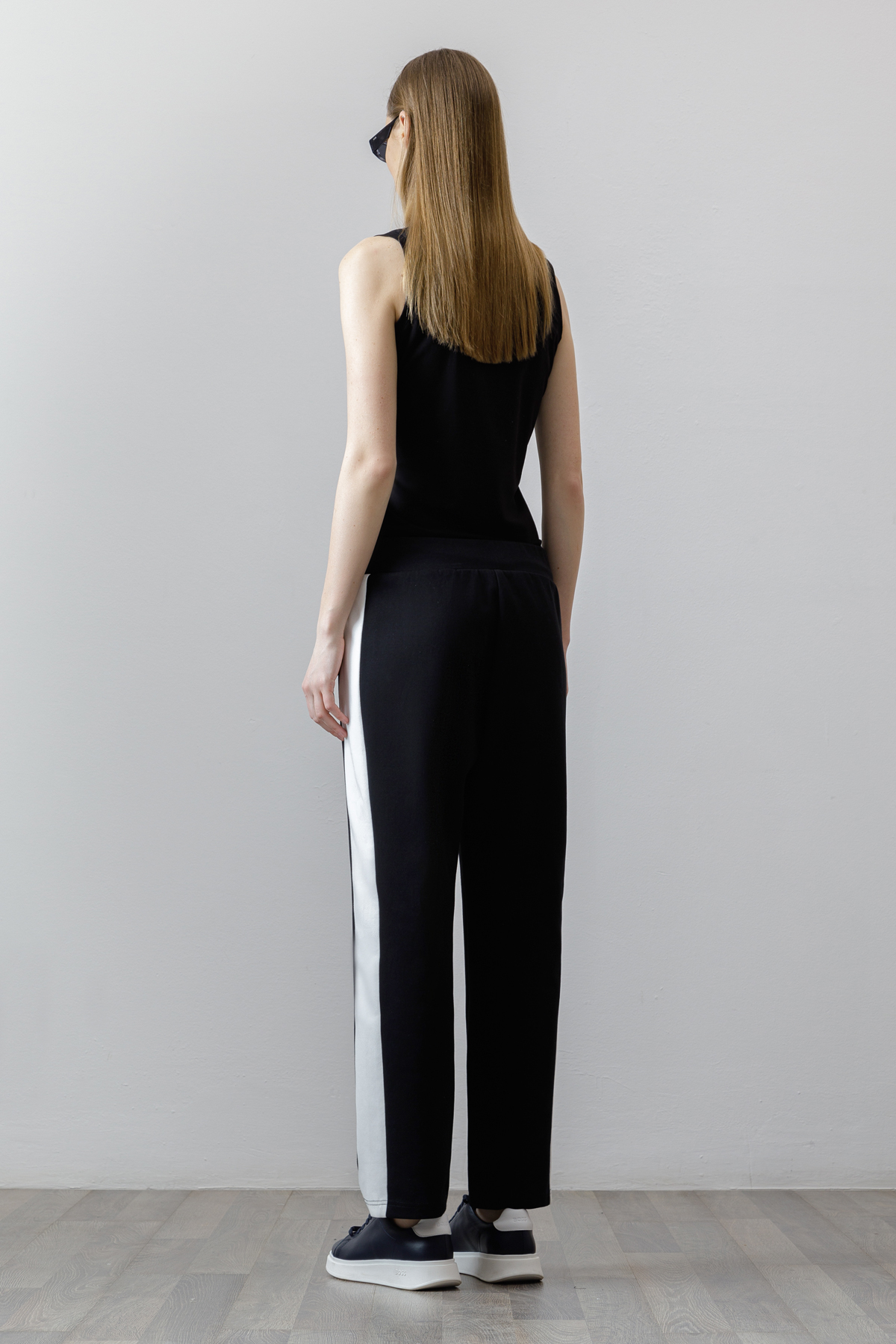 Базовые трикотажные брюки в черном цвете с широкими контрастными лампасами. Выполнены из микса хлопка и полиэстера с мягкой и гладкой фактурой. Материал отличается воздухопроницаемостью и прочностью, хорошо держит форму и практически не мнется. Модель прямого кроя со средней посадкой выполнена в актуальной длине 7/8. Боковые карманы добавляют изделию практичности. Эластичный пояс дополнен кулиской.
