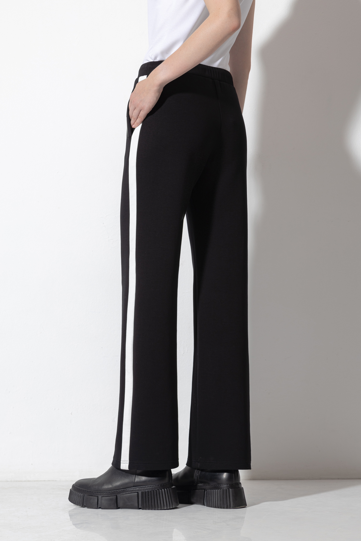 Базовые трикотажные брюки из смесовой ткани с добавлением хлопка. Модель прямого кроя со средней посадкой дополнена широкими контрастными лампасами, боковыми карманами, отрезным эластичным поясом со шнурком, застежкой на молнию и пуговицу.