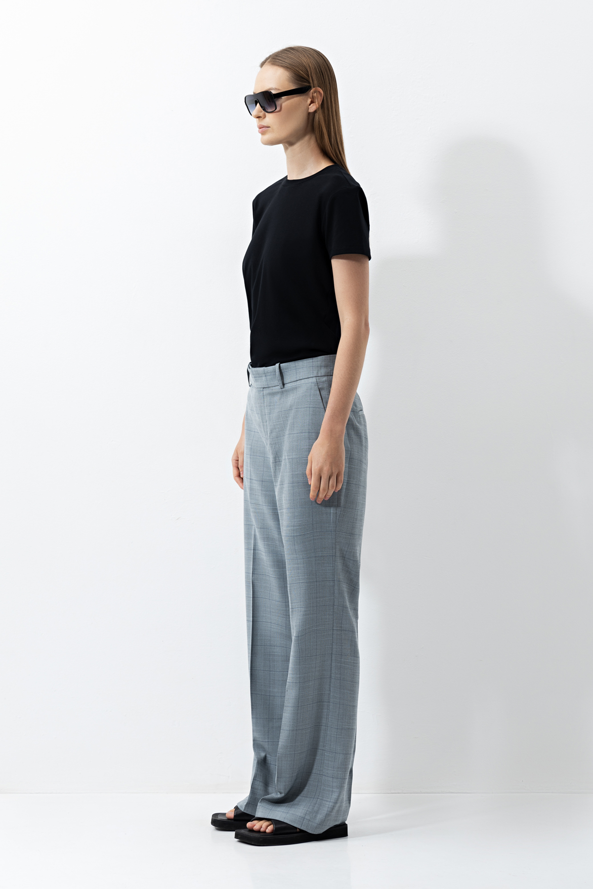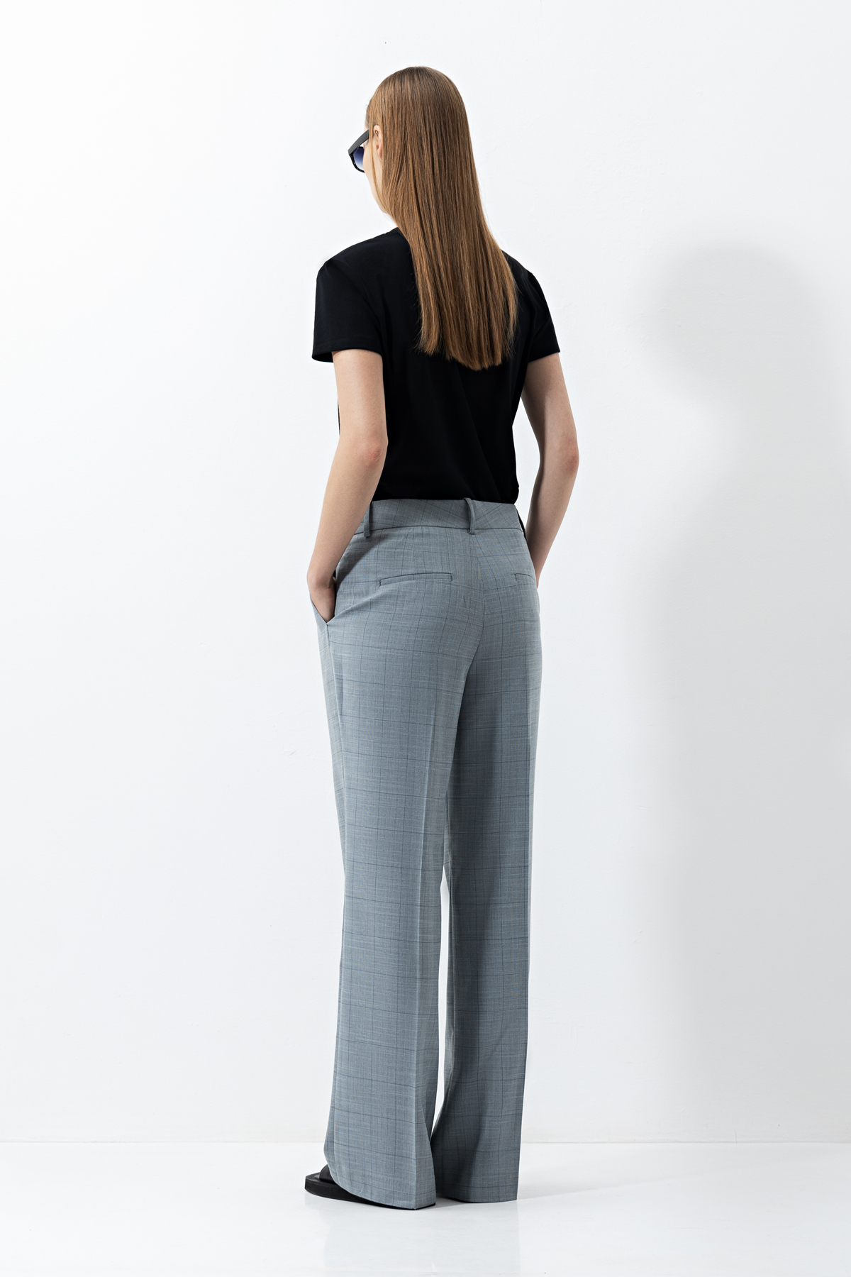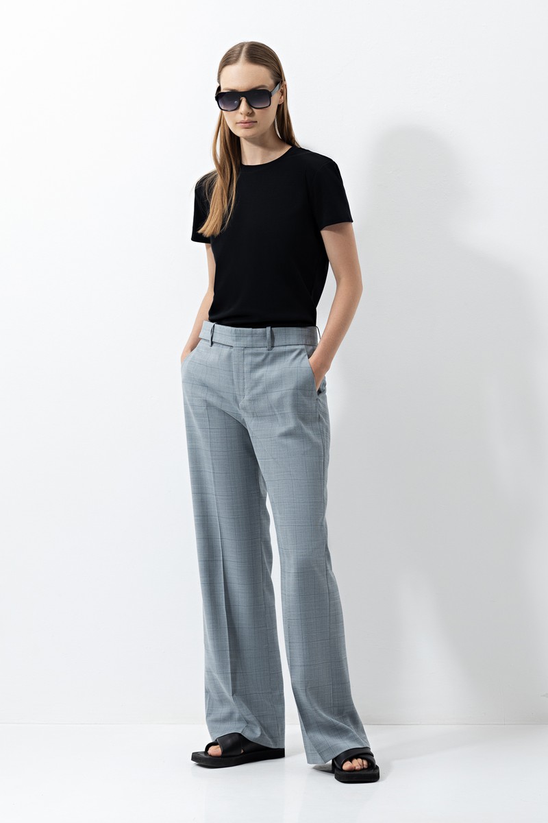 Серые брюки свободного кроя из костюмной ткани в клетку. Пояс со шлевками позволяет дополнить образ ремнем. Сочетайте брюки с топами, лаконичными футболками и рубашками. Или впишите в комплект с жакетом в тон, чтобы сформировать удобный деловой костюм.