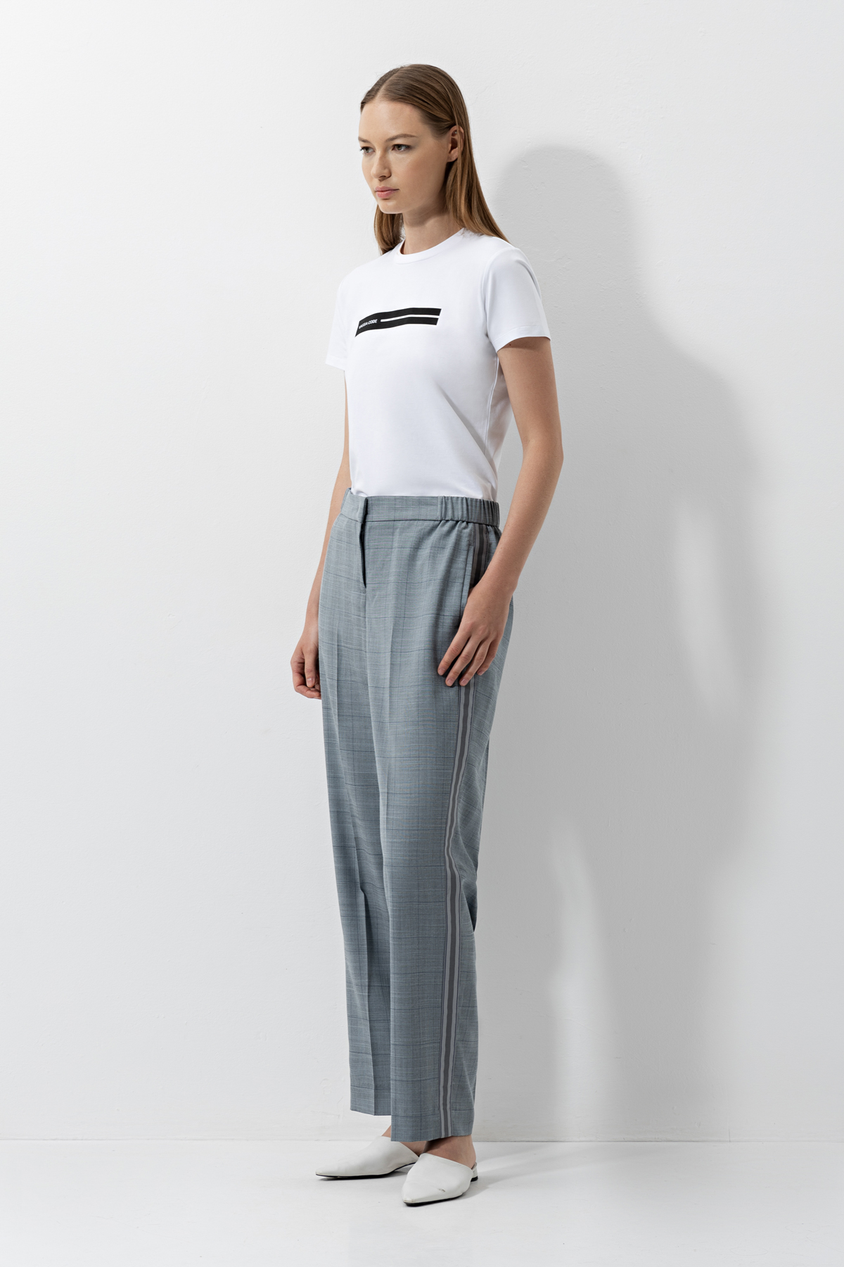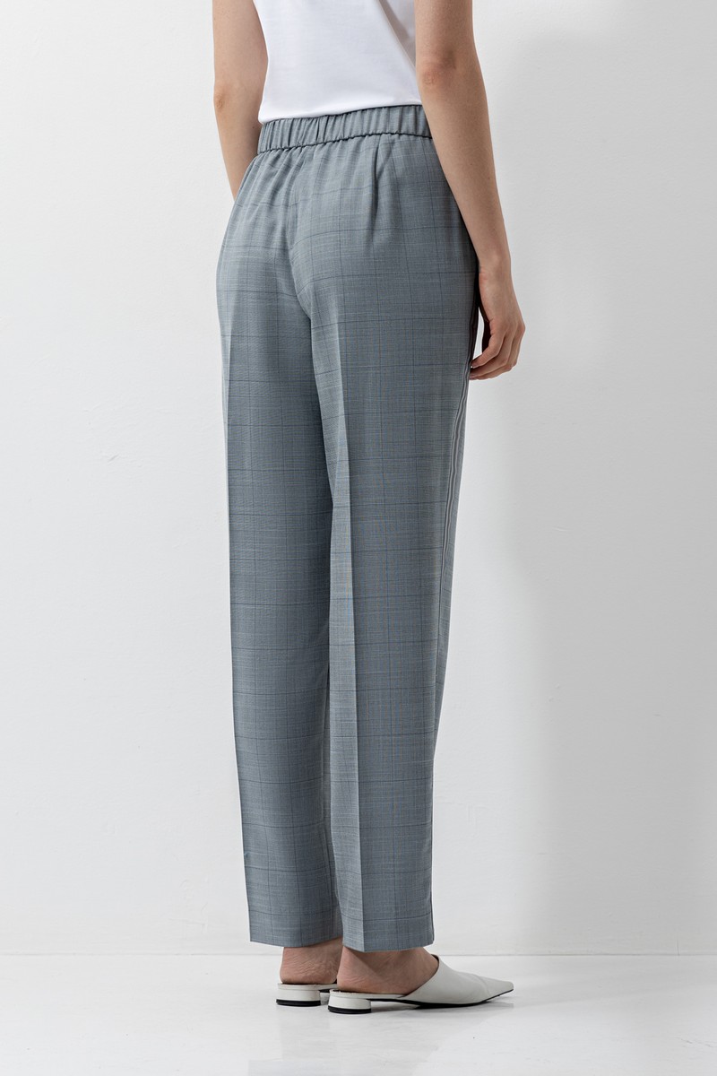 Брюки свободного кроя из костюмной ткани в клетку. Часть пояса выполнена из эластичной резинки, которая обеспечивает комфортную посадку на талии. Изделие отлично впишется в образы с футболками, рубашками и джемперами. Акцентная тесьма сбоку паре с жакетом образует идеальный деловой сет.