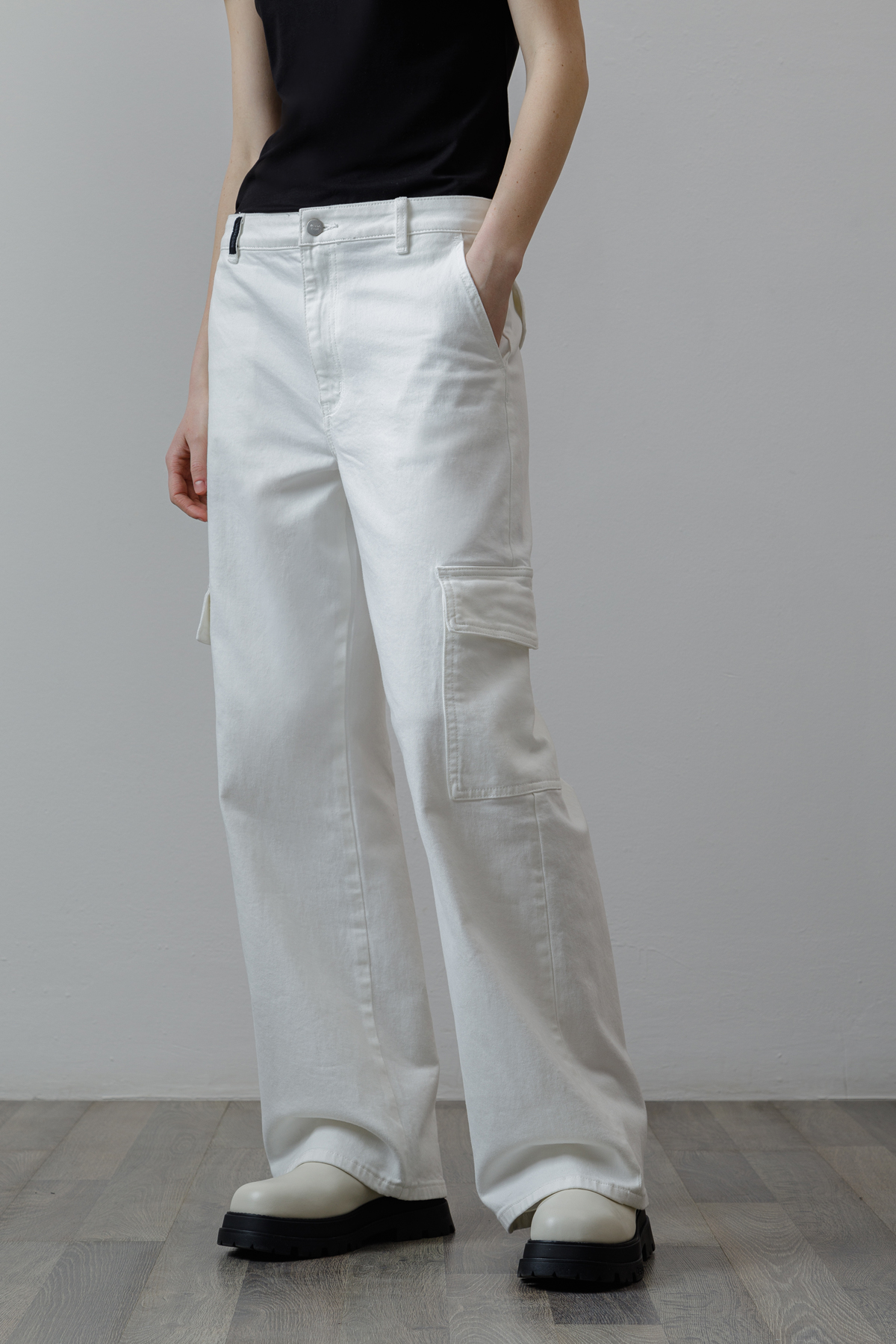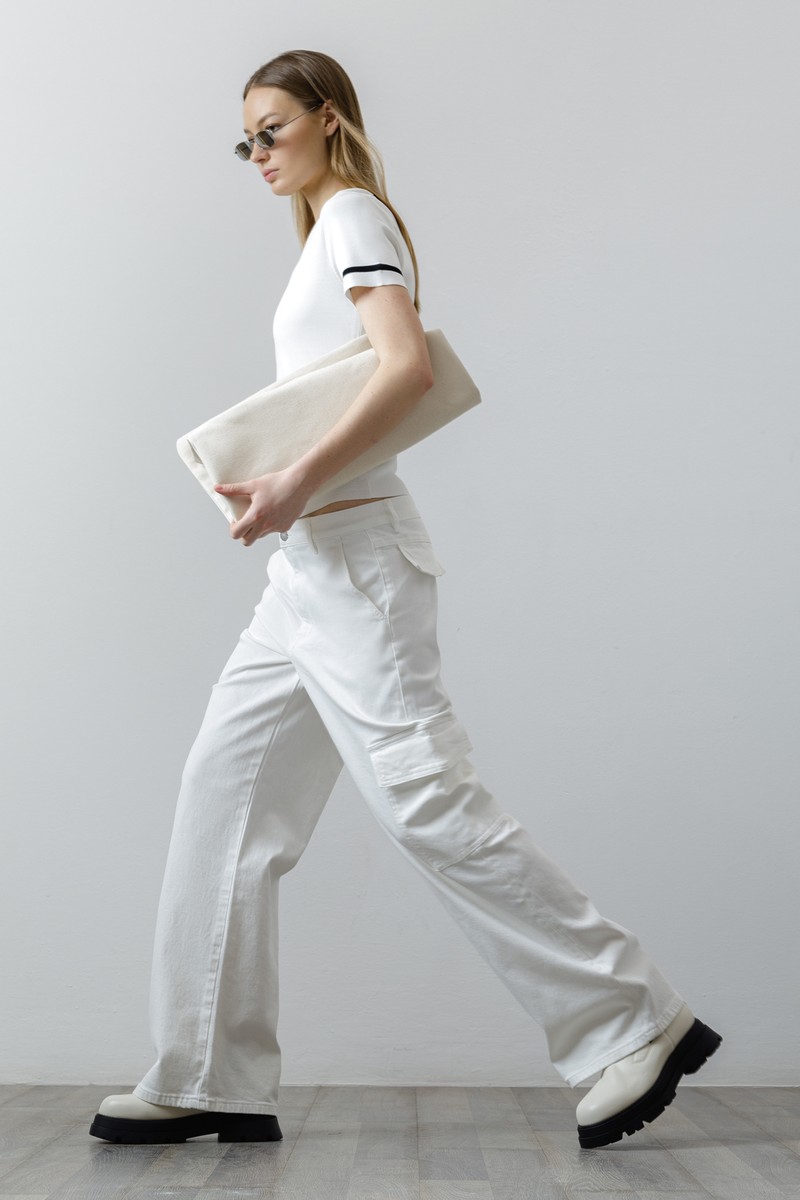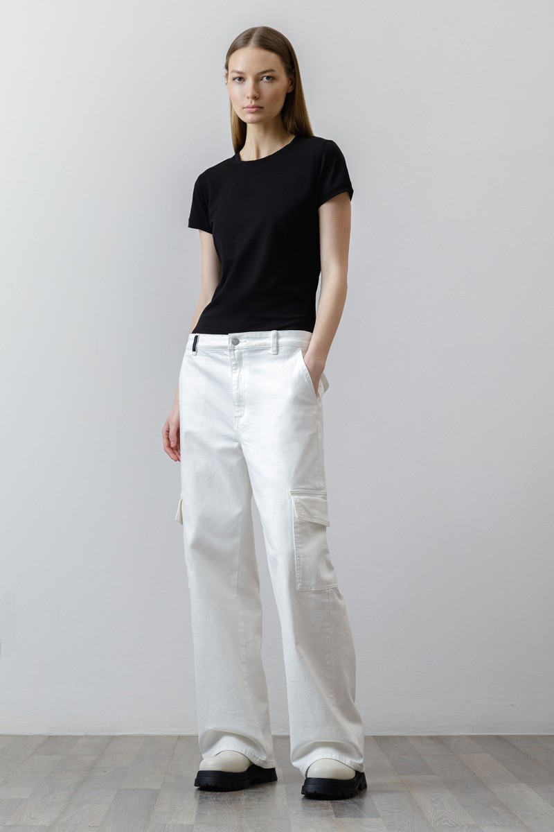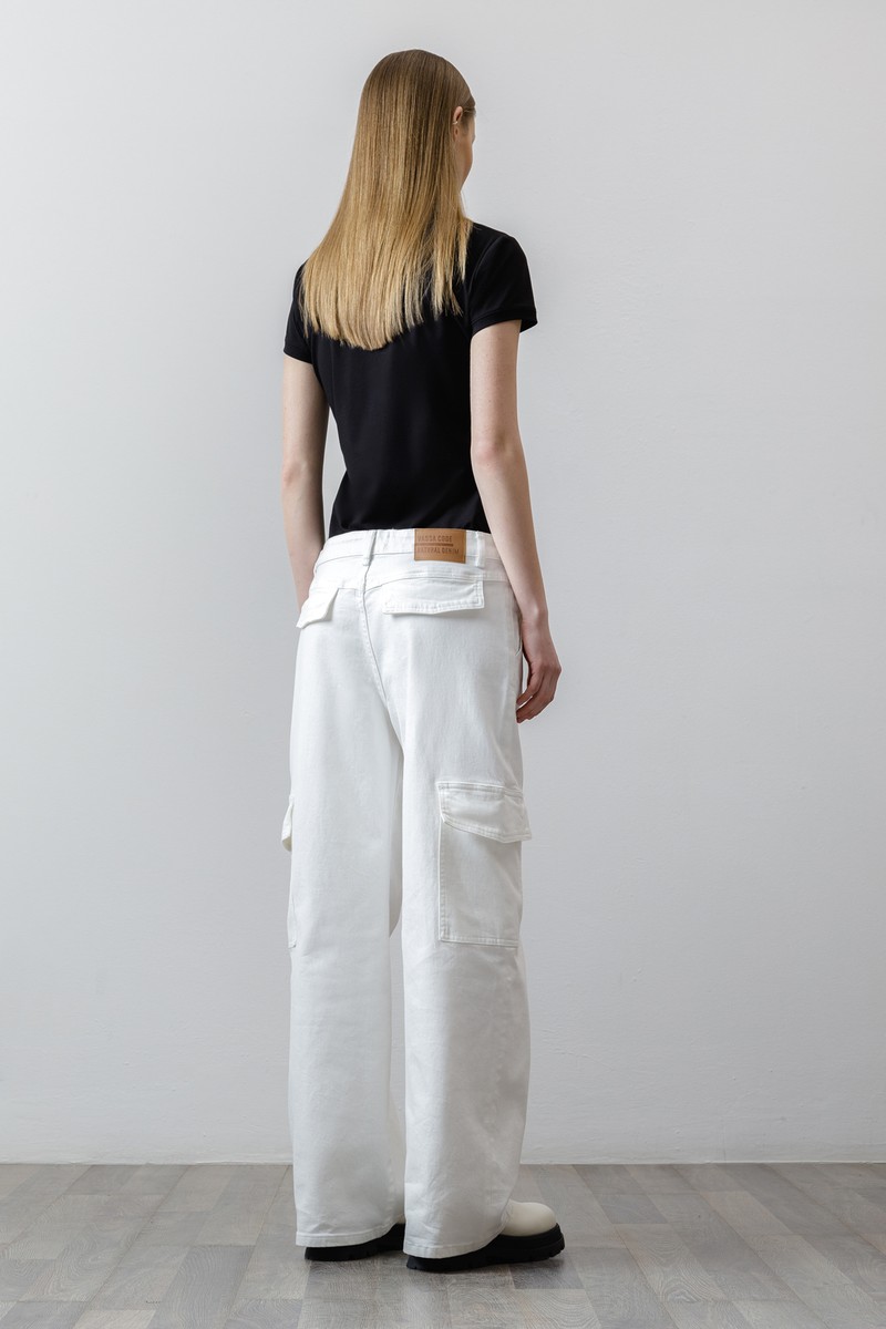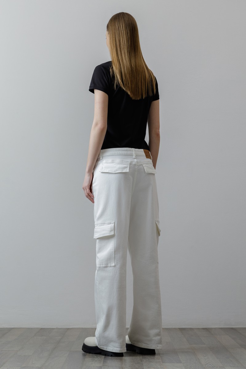 Трендовые джинсы-карго с заниженной талией. Выполнены из плотного хлопка, который отличается прочностью и хорошо держит форму. Небольшой процент эластана в составе делает полотно более пластичным и обеспечивает комфортную посадку изделия. Мягкий пояс со шлевками позволяет носить джинсы с ремнем или без него. Модель широкого кроя не стесняет движений. Джинсы-карго дополнены четырьмя практичными карманами. Идеальной парой изделия станет облегающий топ, минималистичная футболка или объемная рубашка.