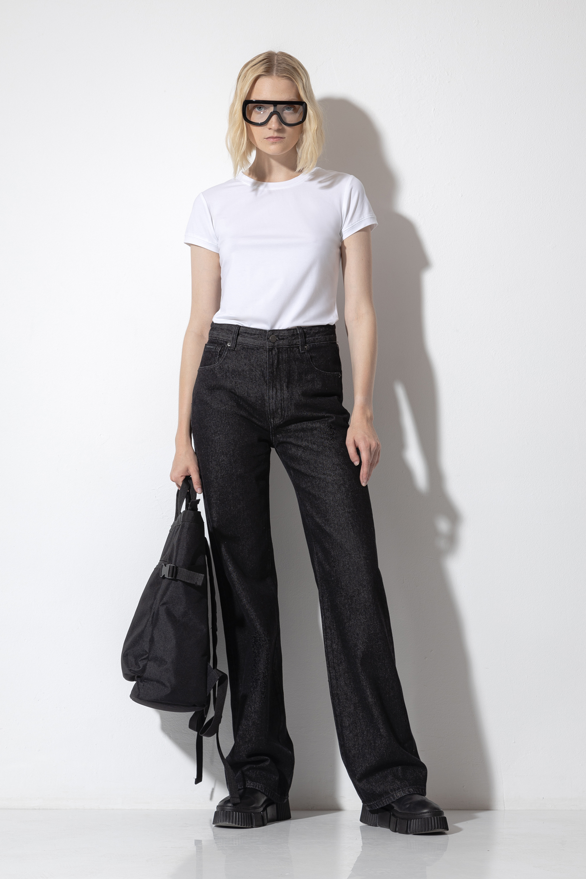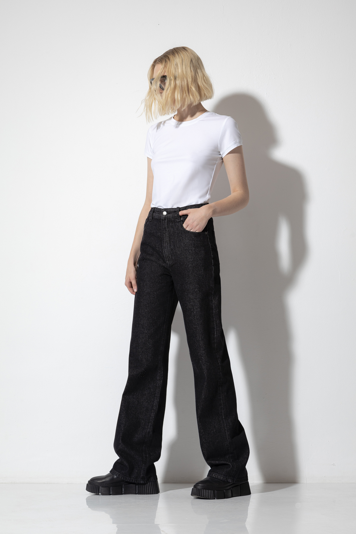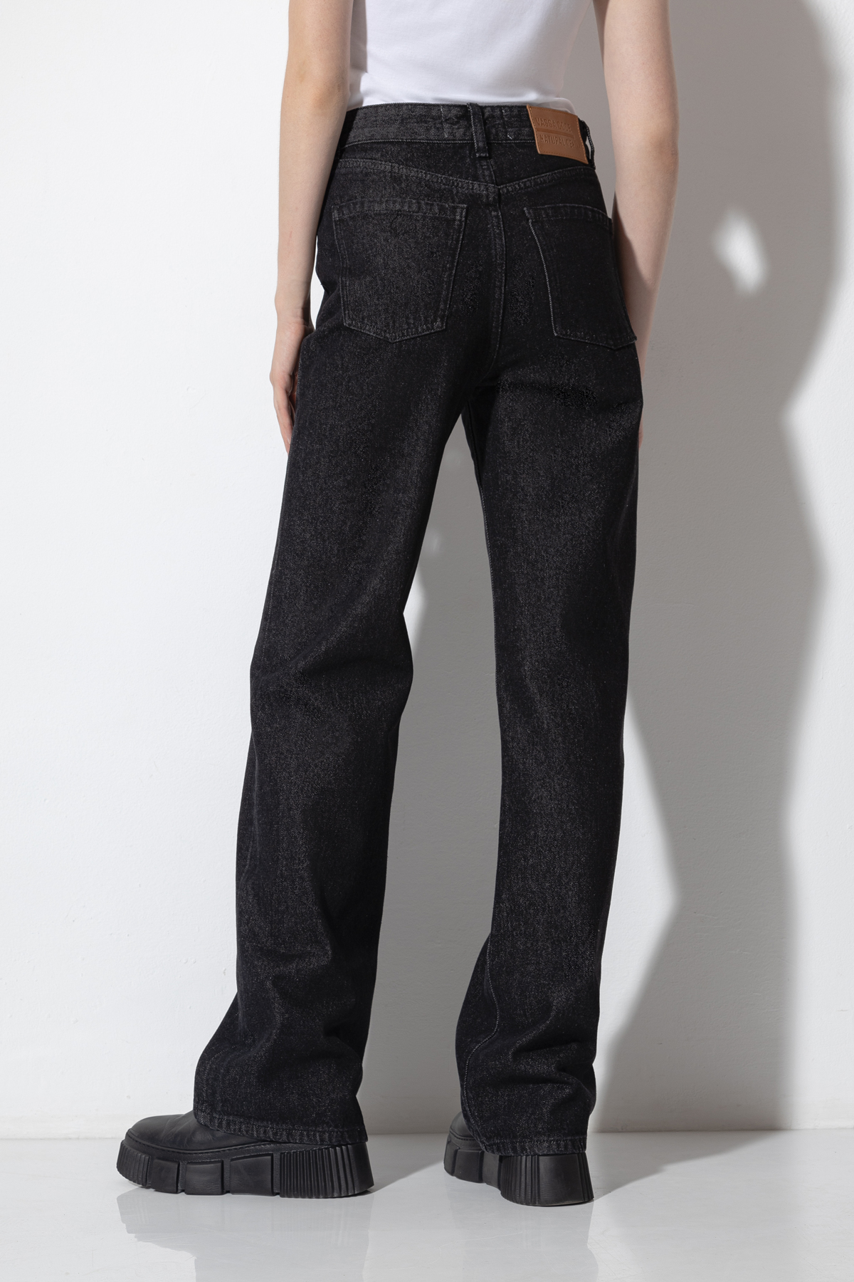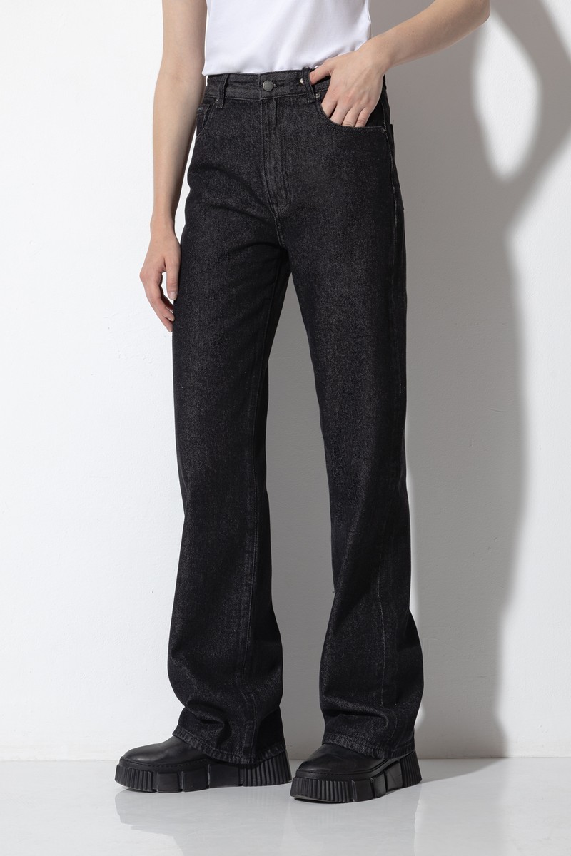 Базовые джинсы из плотного денима. Модель расширенного кроя с высокой посадкой. Джинсы дополнены практичными карманами, застежкой на молнию и пуговицу и мягким поясом со шлевками, который позволяет носить брюки с ремнем или без него.