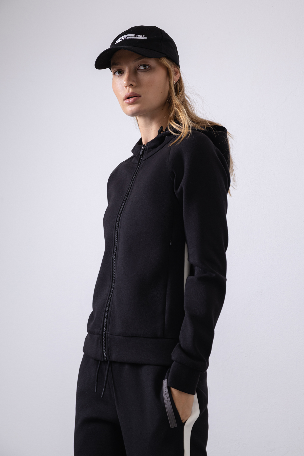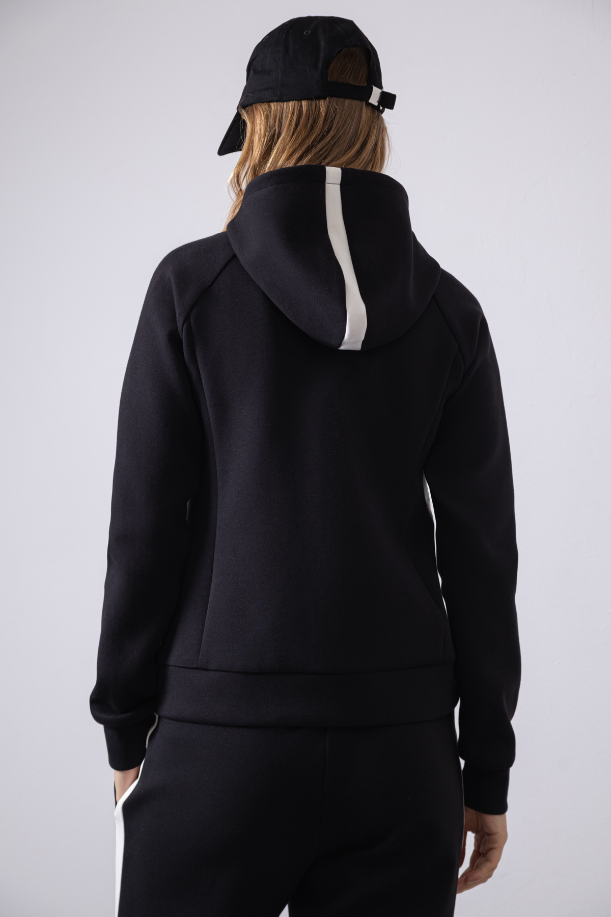 Худи на молнии в черном цвете - базовая вещь в гардеробе. Модель дополнена котрастной вставкой на капюшоне.