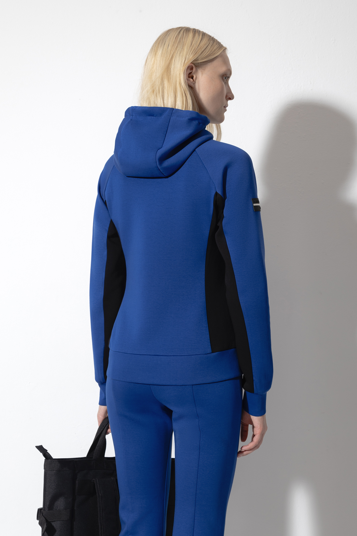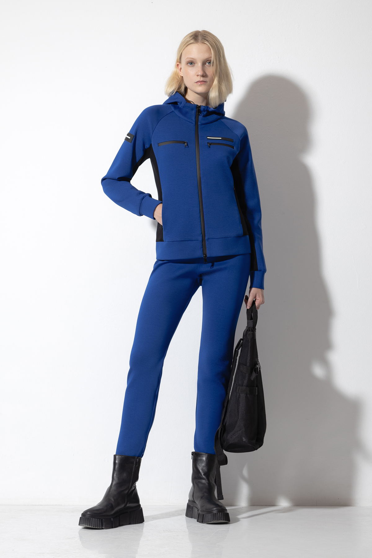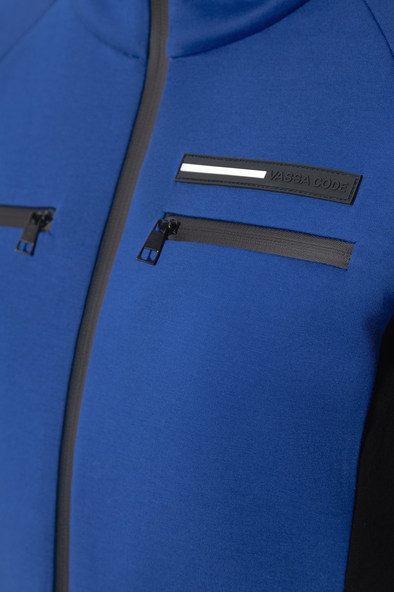 Худи на молнии из смесовой ткани с добавлением хлопка. Модель полуприлегающего кроя дополнена боковыми прорезными карманам, нагрудными карманами на молнии, капюшоном с логотипом, эластичной резинкой на рукавах и по низу изделия.
