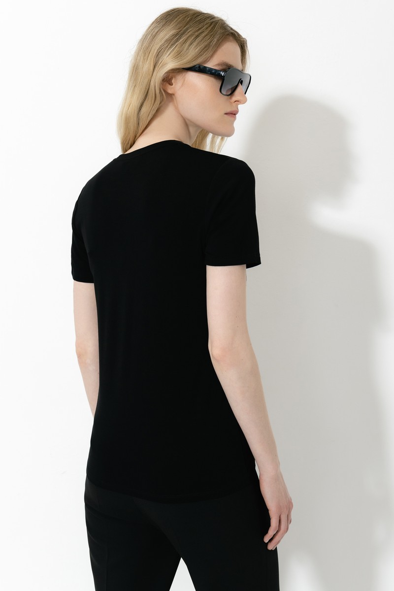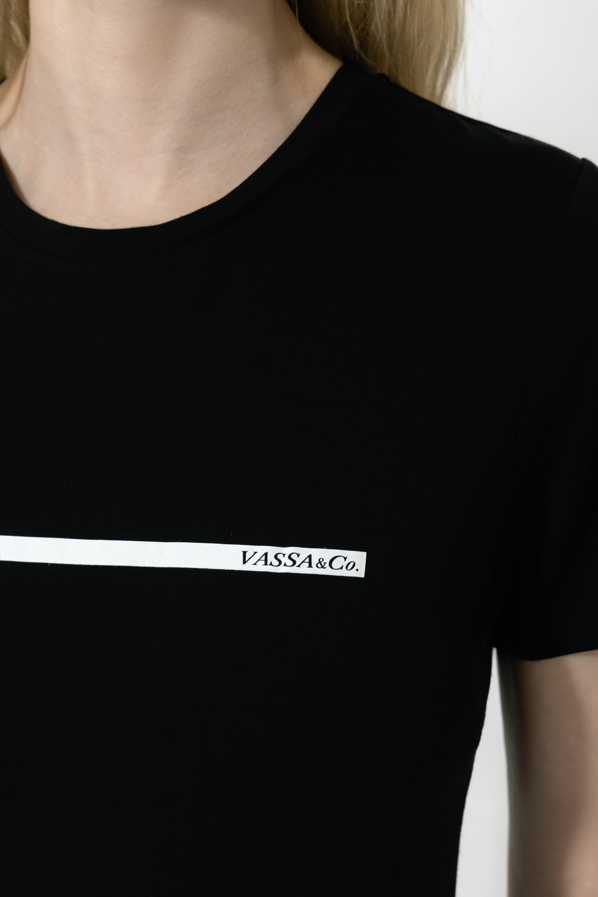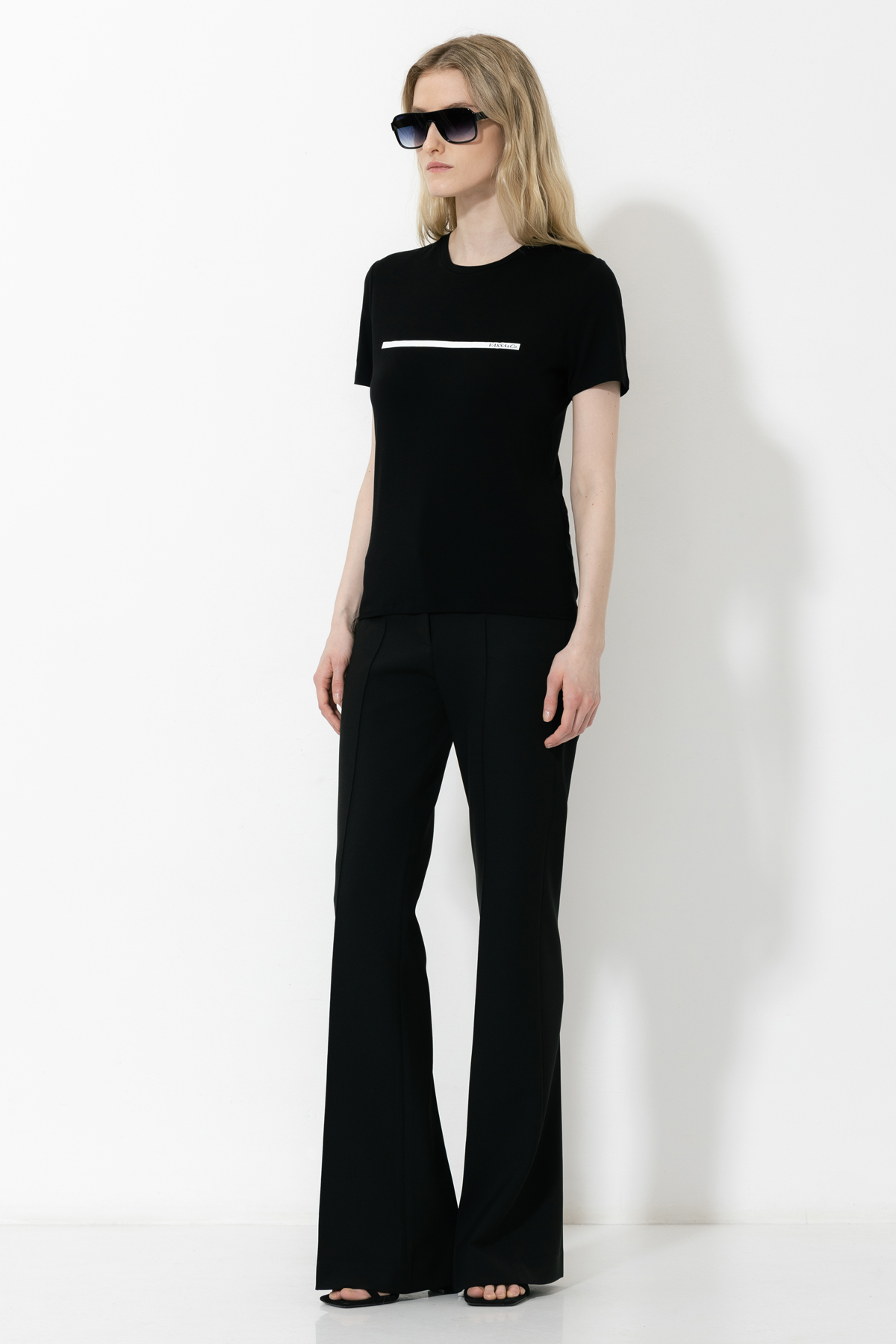 Черная футболка приталенного кроя. Модель дополнена контрастной горизонтальной полоской с логотипом. В составе ткани 95% вискоза. Универсальная модель подходит для строгих деловых комплектов и для неформальных образов.