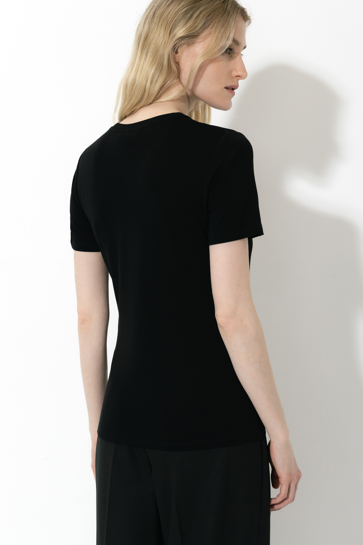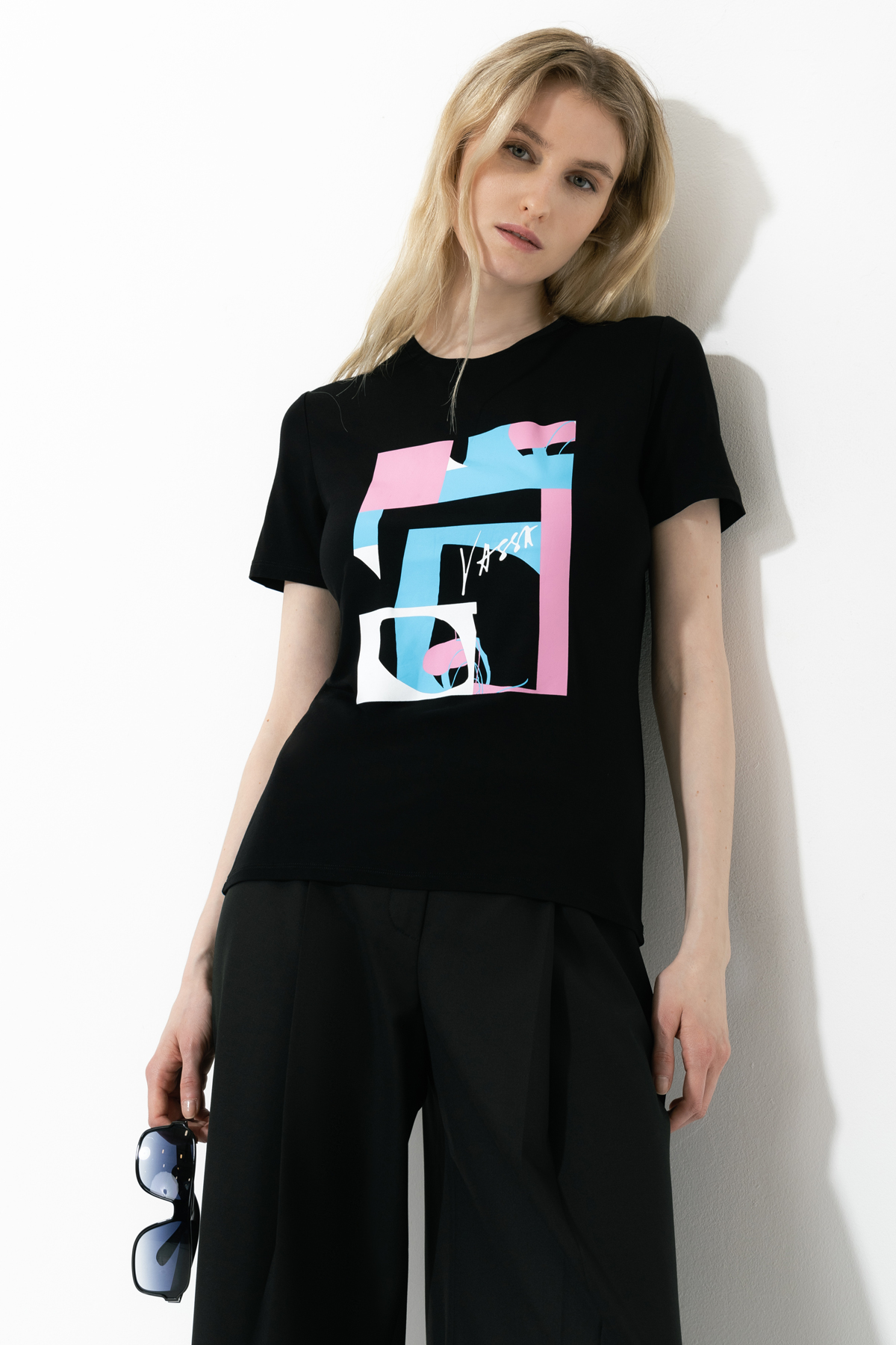 Черная футболка приталенного кроя из вискозы. Детали: прямая линия плеча, круглый вырез горловины, пастельный ассиметричный принт и белая надпись-логотип. Футболка станет стильным акцентом в повседневном образе или дополнит летний casual-образ.
