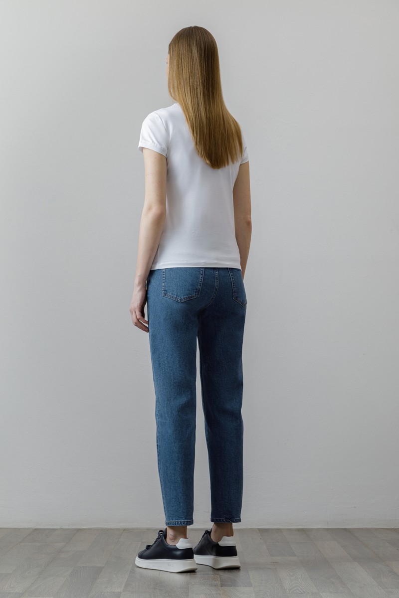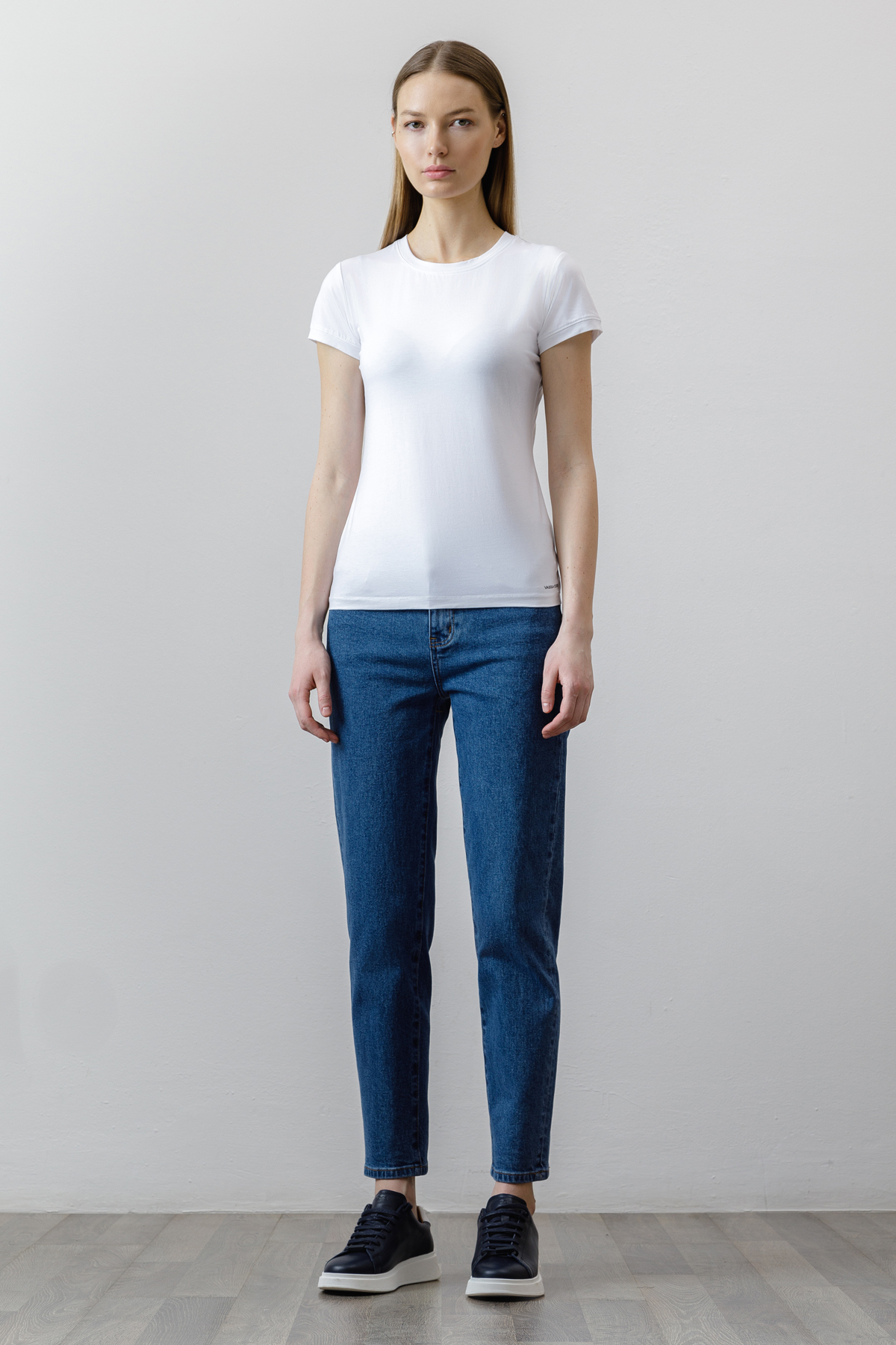 Минималистичная женская футболка с круглым вырезом из смесового хлопка. Волокна вискозы в составе обеспечивают мягкую фактуру изделия, хлопок отвечает за хорошую воздухопроницаемость. Эластан делает полотно более пластичным. Модель приталенного кроя с коротким рукавом дополнена небольшим логотипом в нижней части изделия. Футболка отлично дополнит образы с джинсами, брюками и юбками, а также хорошо впишется в многослойные комплекты с жакетами и кардиганами.