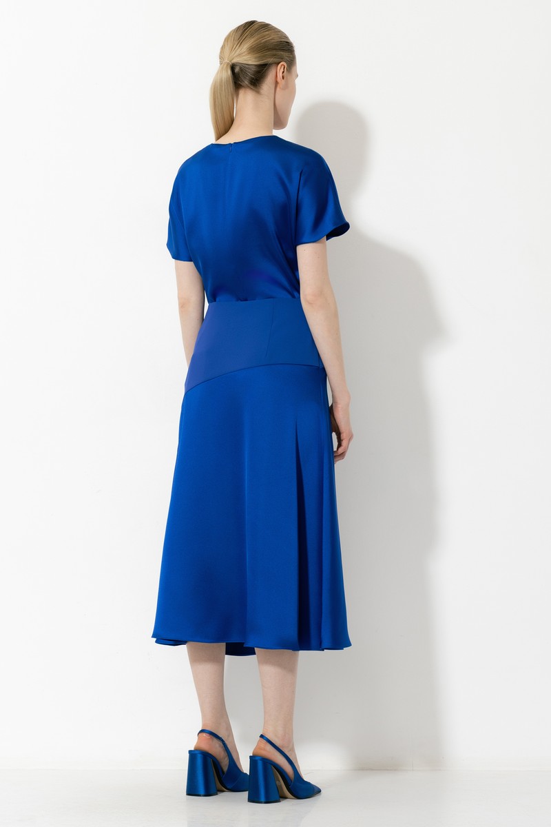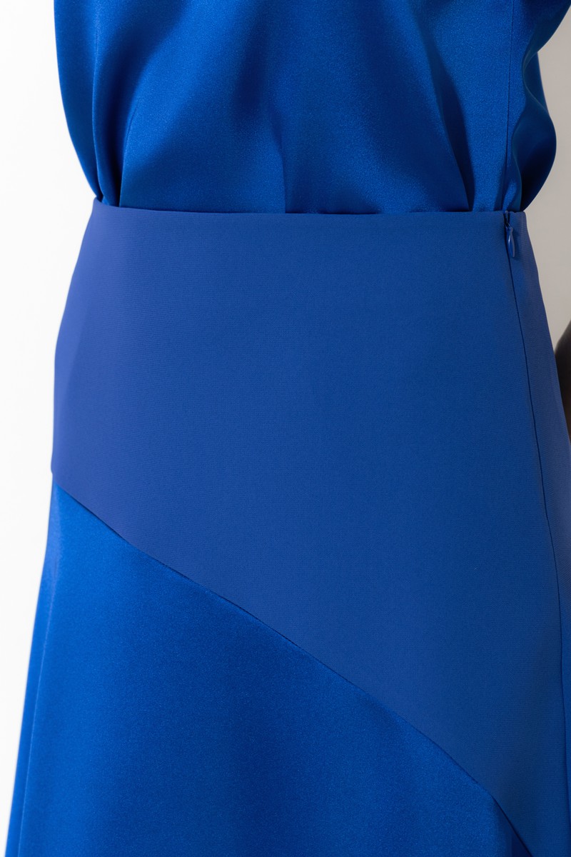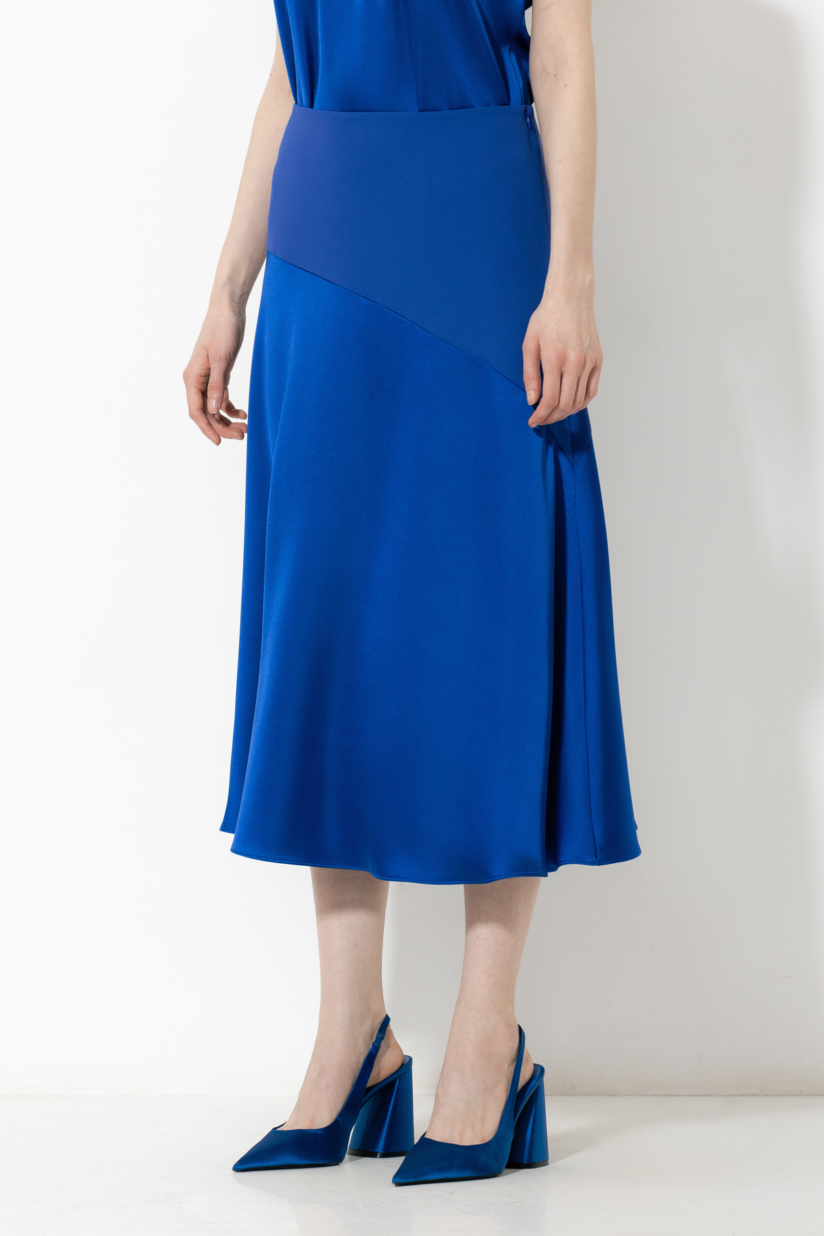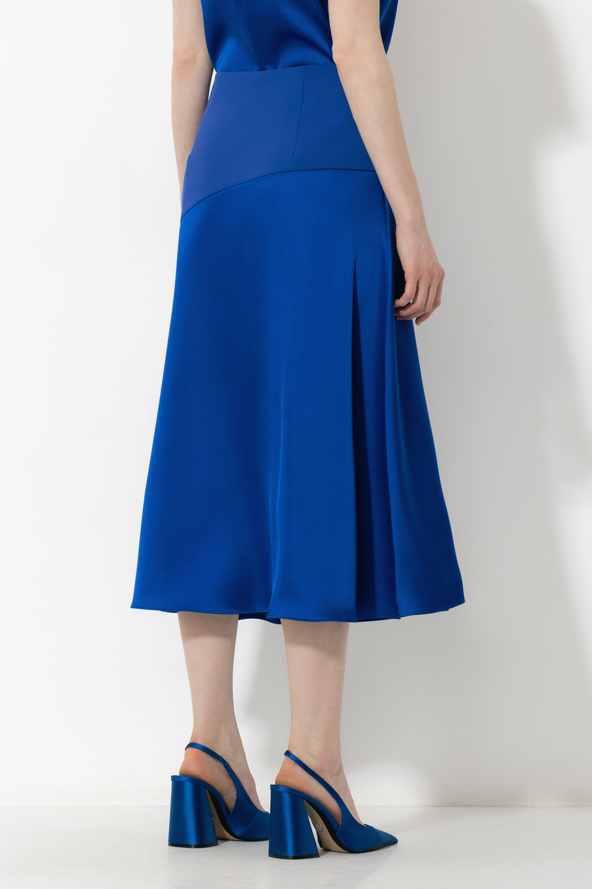 Акцентная юбка-миди из струящейся ткани с легким блеском. Модель А-силуэта дополнена асимметричной вставкой на бедрах и застежкой на потайную молнию. Для создания монохромного образа сочетайте юбку с блузкой в тон, так же представленной в коллекции. Изделие доступно в двух оттенках.