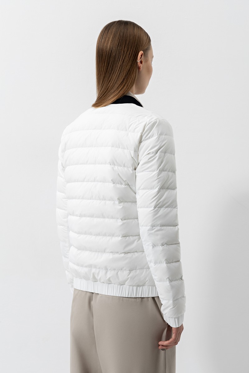 Утепленный бомбер в спортивном стиле из прочного влагостойкого нейлона с наполнителем из натурального пуха и пера. Модель прямого кроя дополнена карманами, застежкой на молнию, эластичными манжетами и воротником-стойкой из трикотажной резинки.