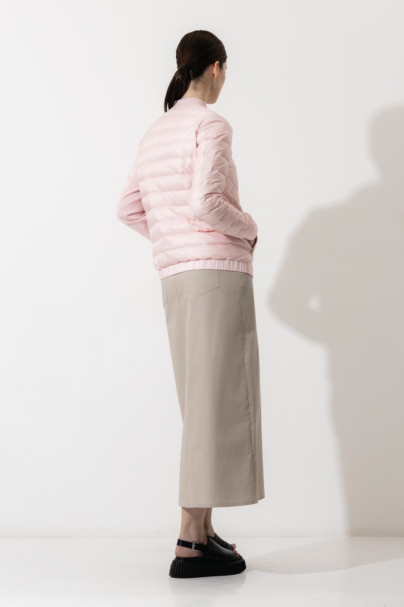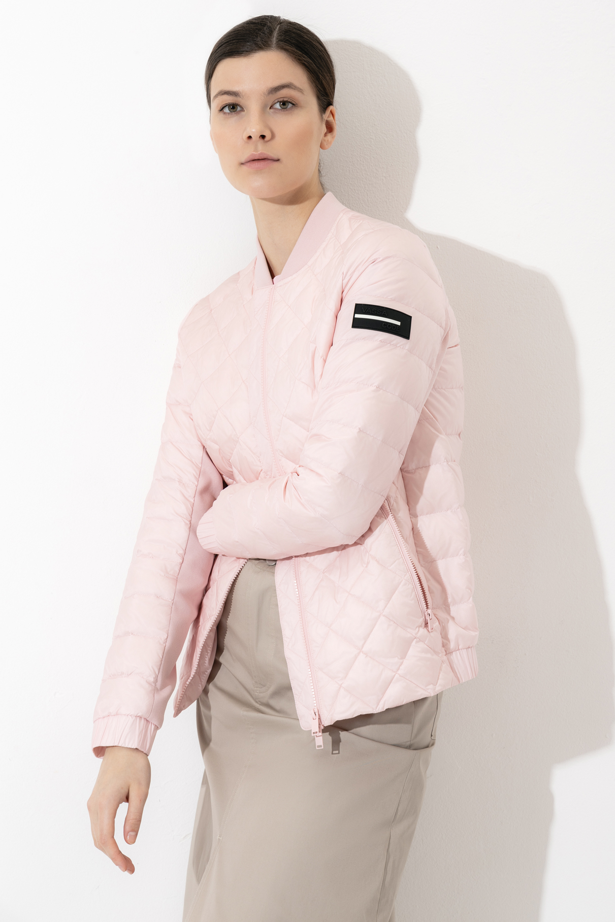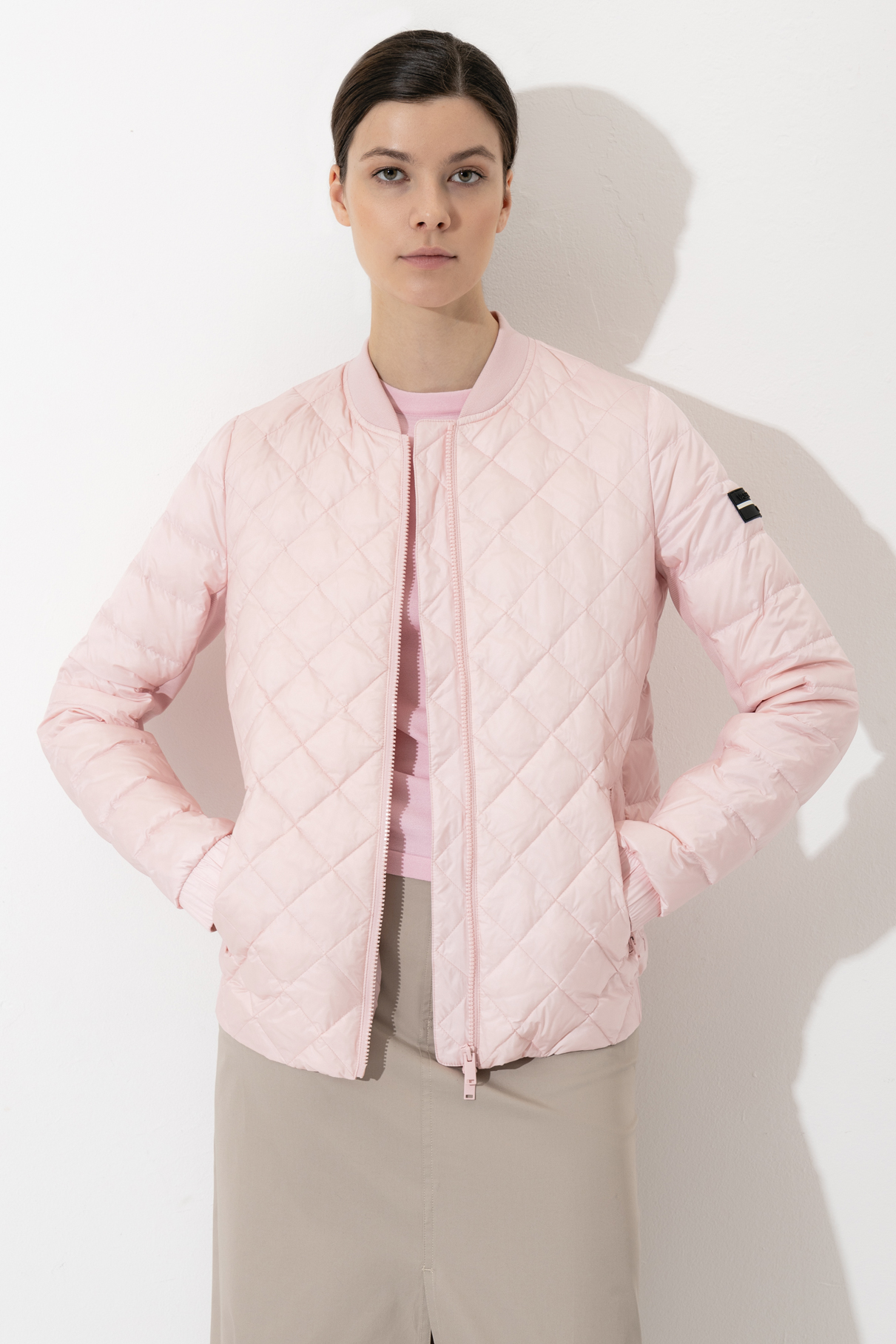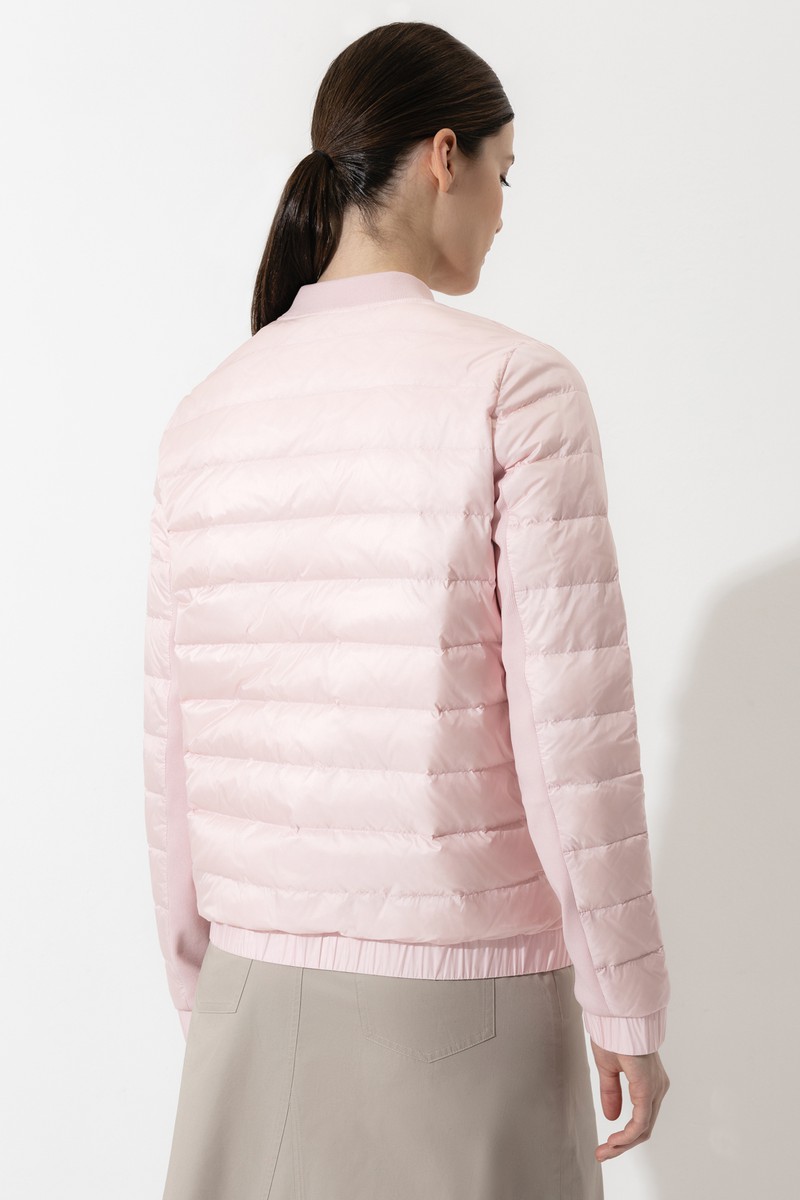 Утепленный бомбер в спортивном стиле из прочного влагостойкого нейлона с наполнителем из натурального пуха и пера. Модель прямого кроя дополнена карманами, застежкой на молнию, эластичными манжетами и воротником-стойкой из трикотажной резинки.