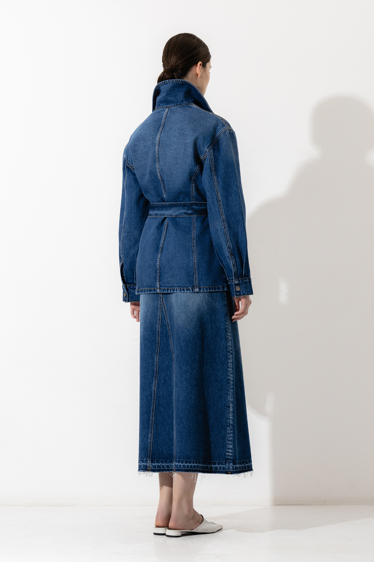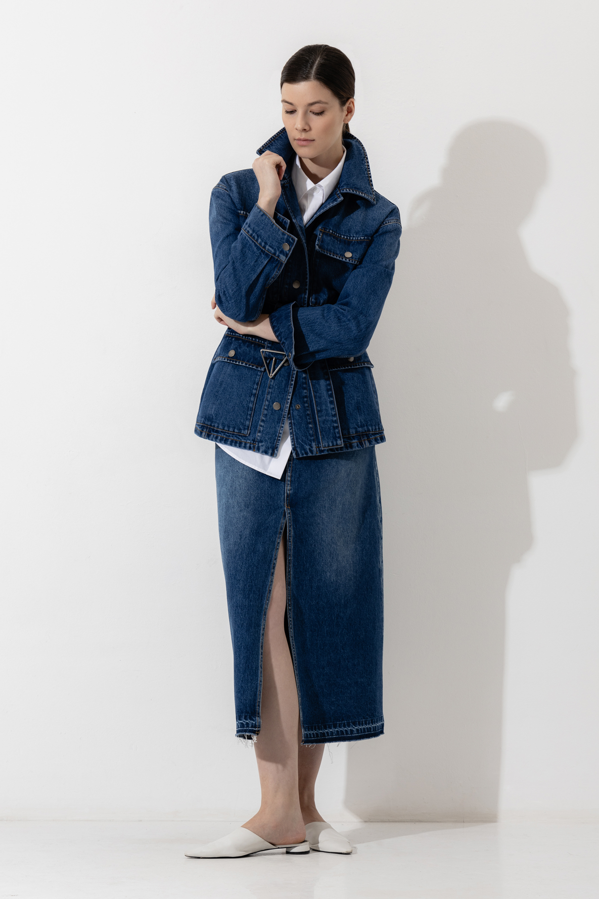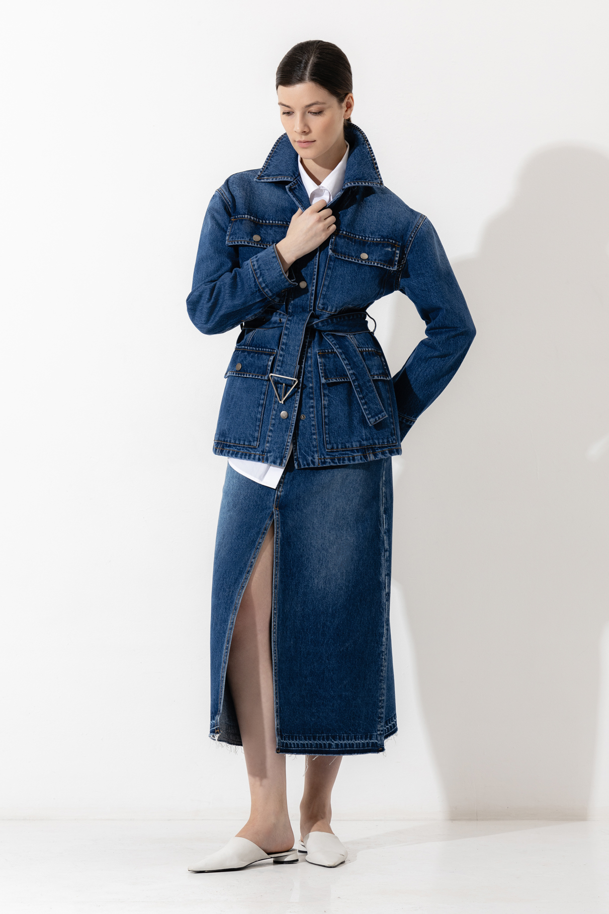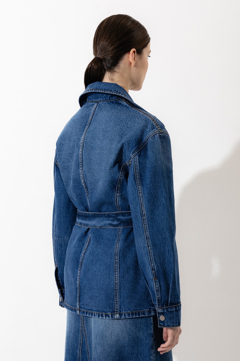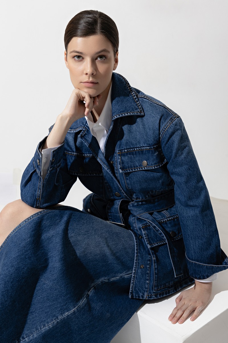 Удлиненная джинсовая куртка приталенного силуэта. Изделие выполнено из плотного натурального хлопка. Детали: стойка воротник, мягкий пояс и крупные накладные карманы. Дополните образ total denim юбкой миди с разрезом.