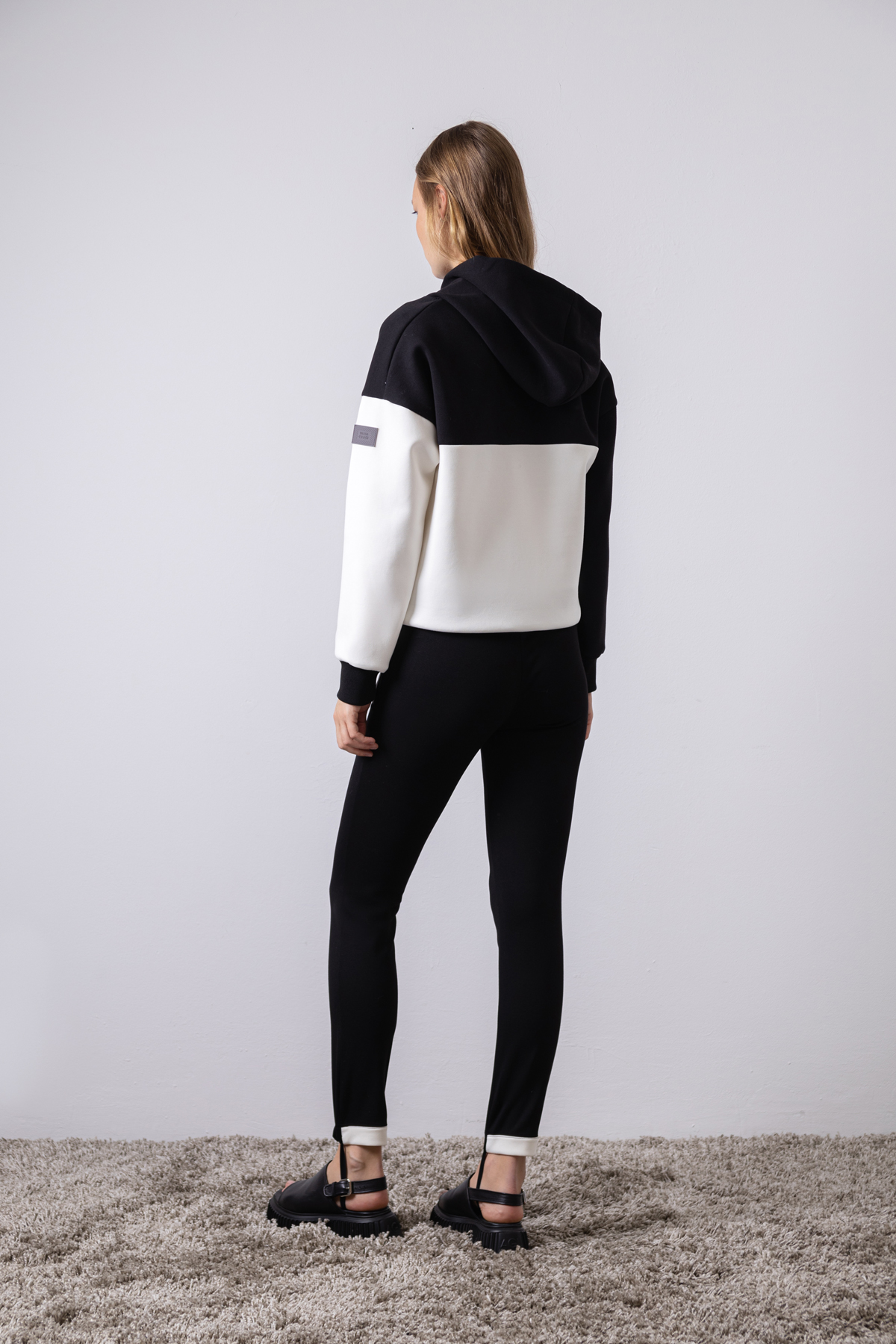 Брюки - леггинсы в черном цвете. Трендовая модель прилегающего силуэта с контрастной деталью.