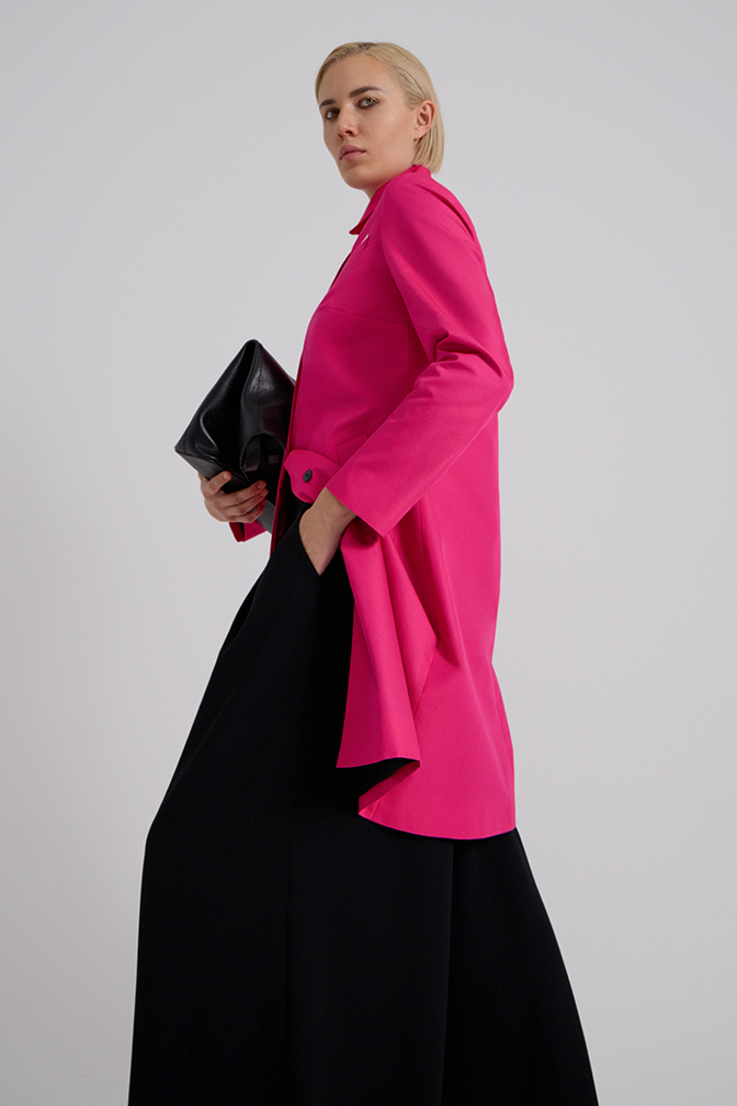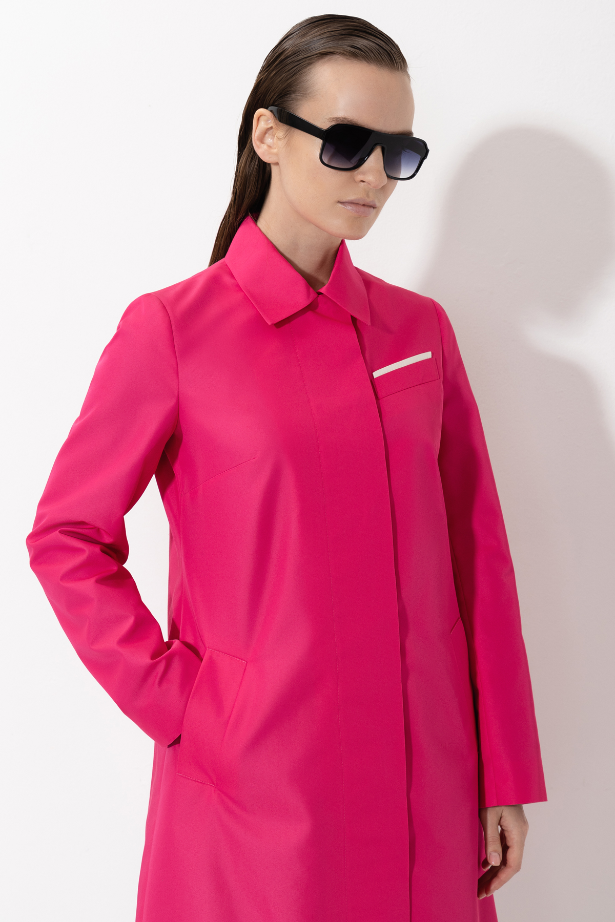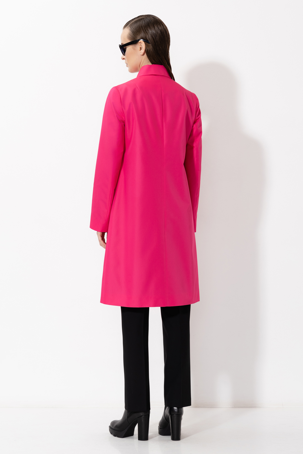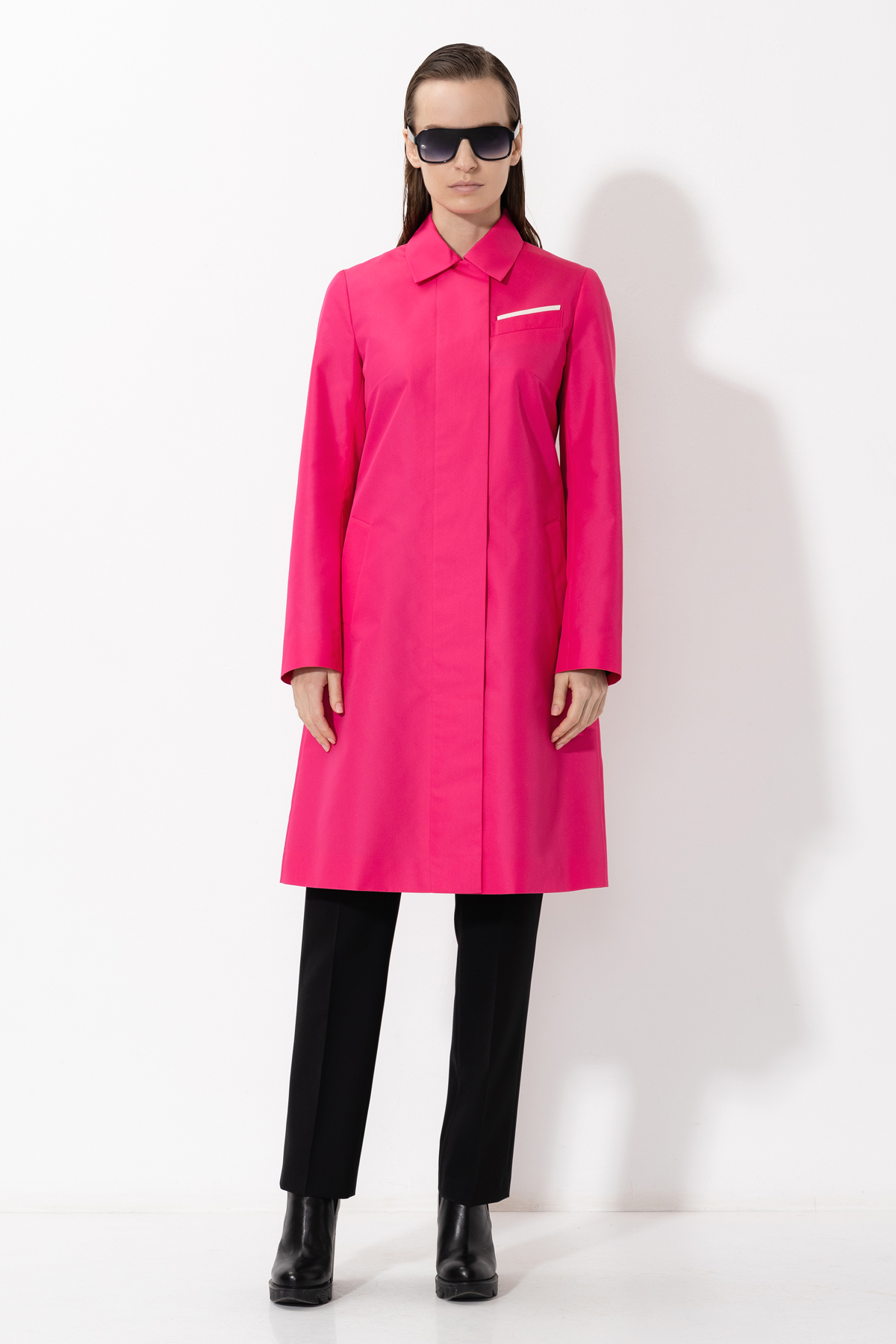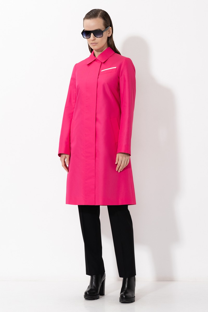 Плащ прямого кроя в розовом цвете выполнен из хлопка. Застежка на пуговицы скрыта под планкой. Модель дополняют стойка-воротник и нагрудный карман с контрастной отделкой. Изделие станет акцентной деталью в повседневном гардеробе.