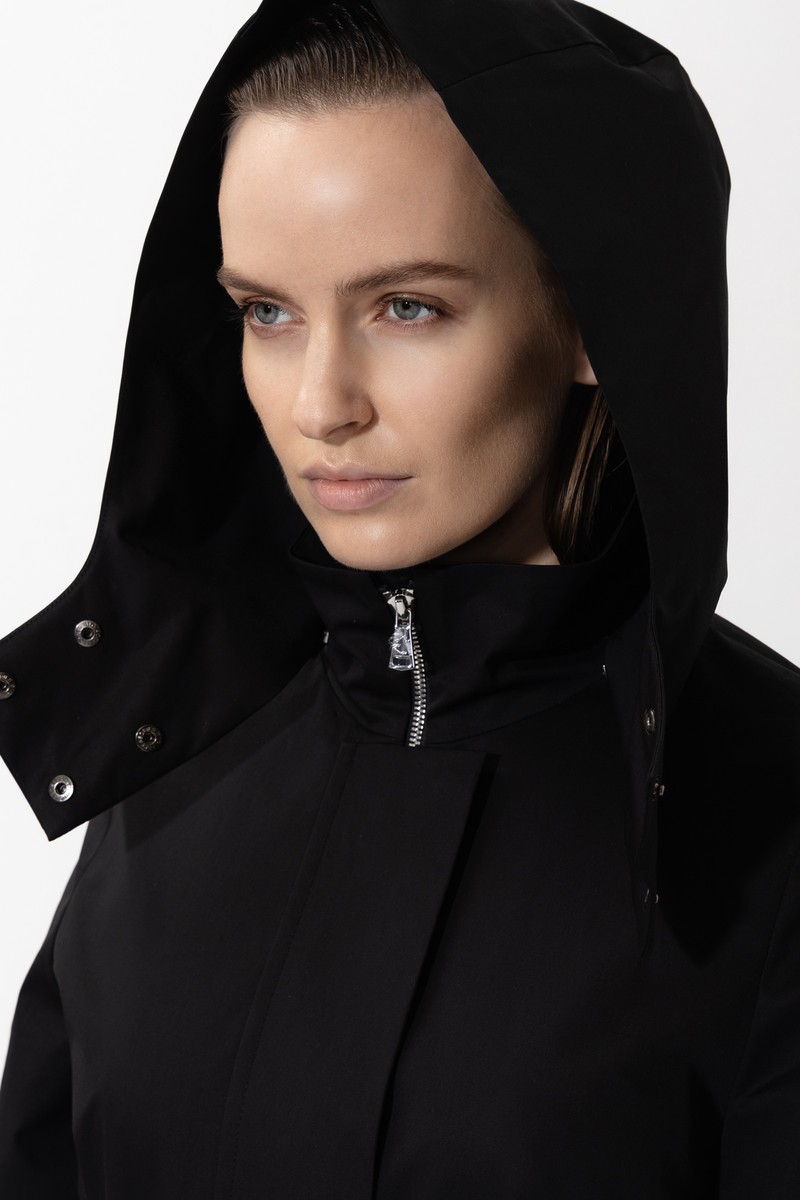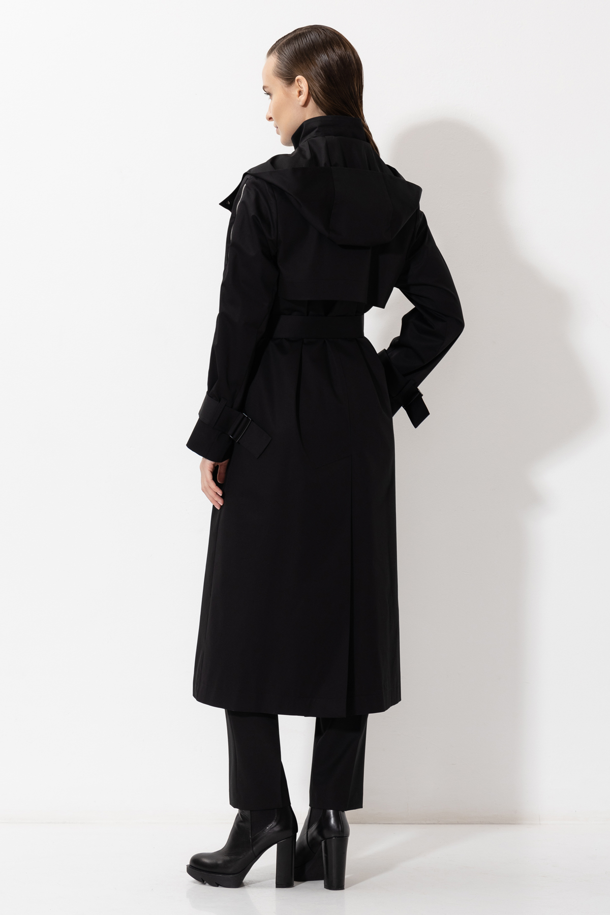 Дизайнерская модель плаща в классическом в черном цвете. Выполнена из 100% хлопка. Паты и молния от плеча до манжета регулируют ширину рукава. Отстегивающийся капюшон защищает от ветра и холода, а так же позволяет менять настроение образа. Мягкий пояс в комплекте красиво подчеркивает линию талии. Также рекомендуем дополнить изделие двойным кожаным поясом, так же представленным на сайте.