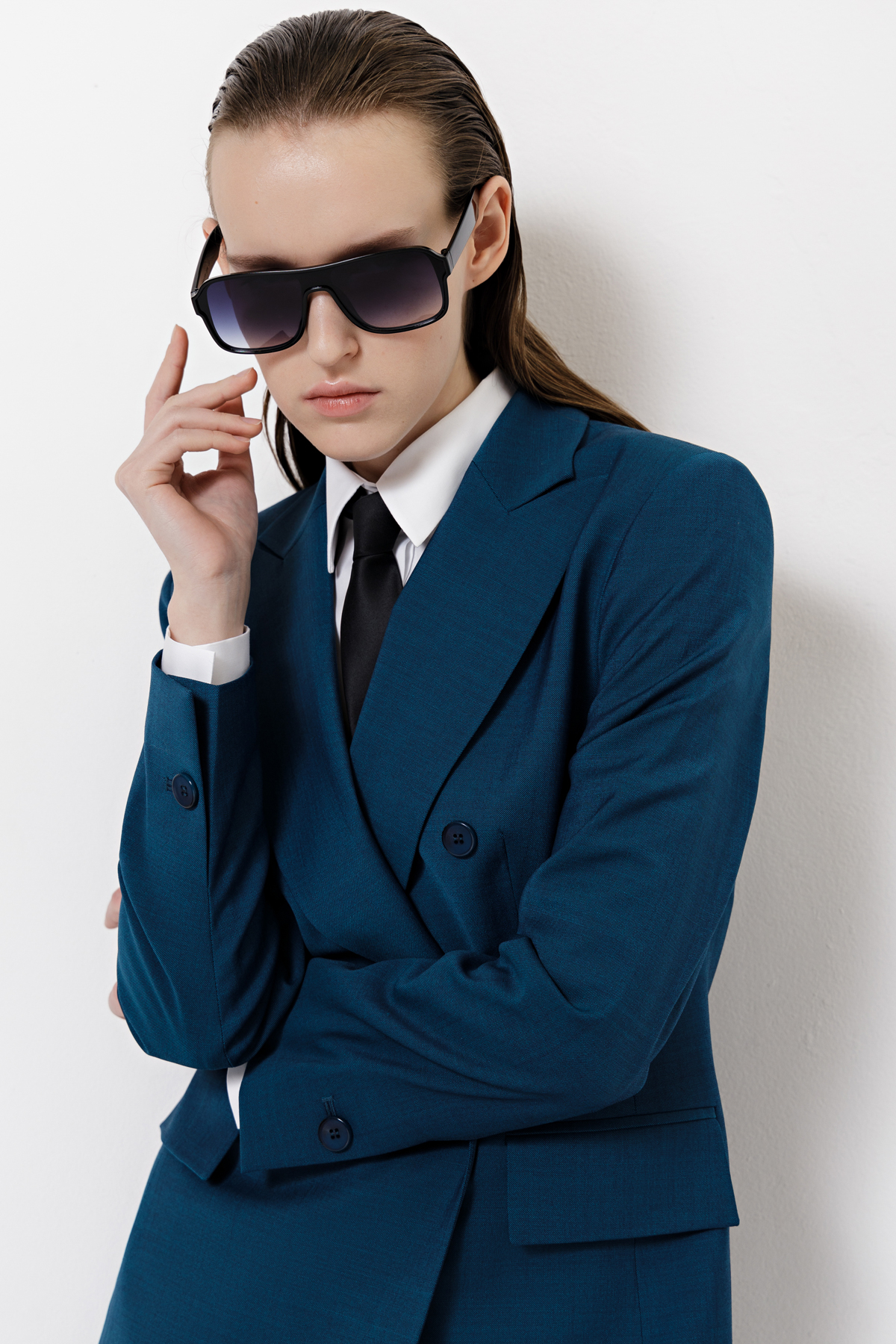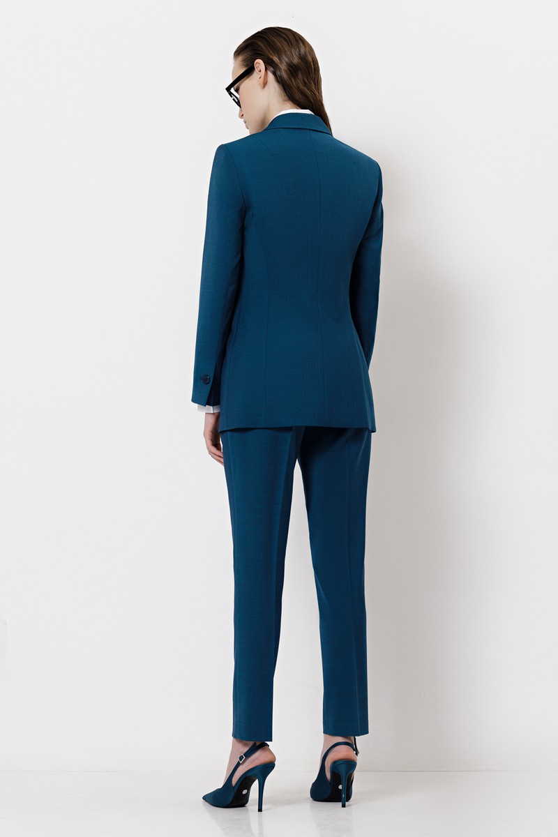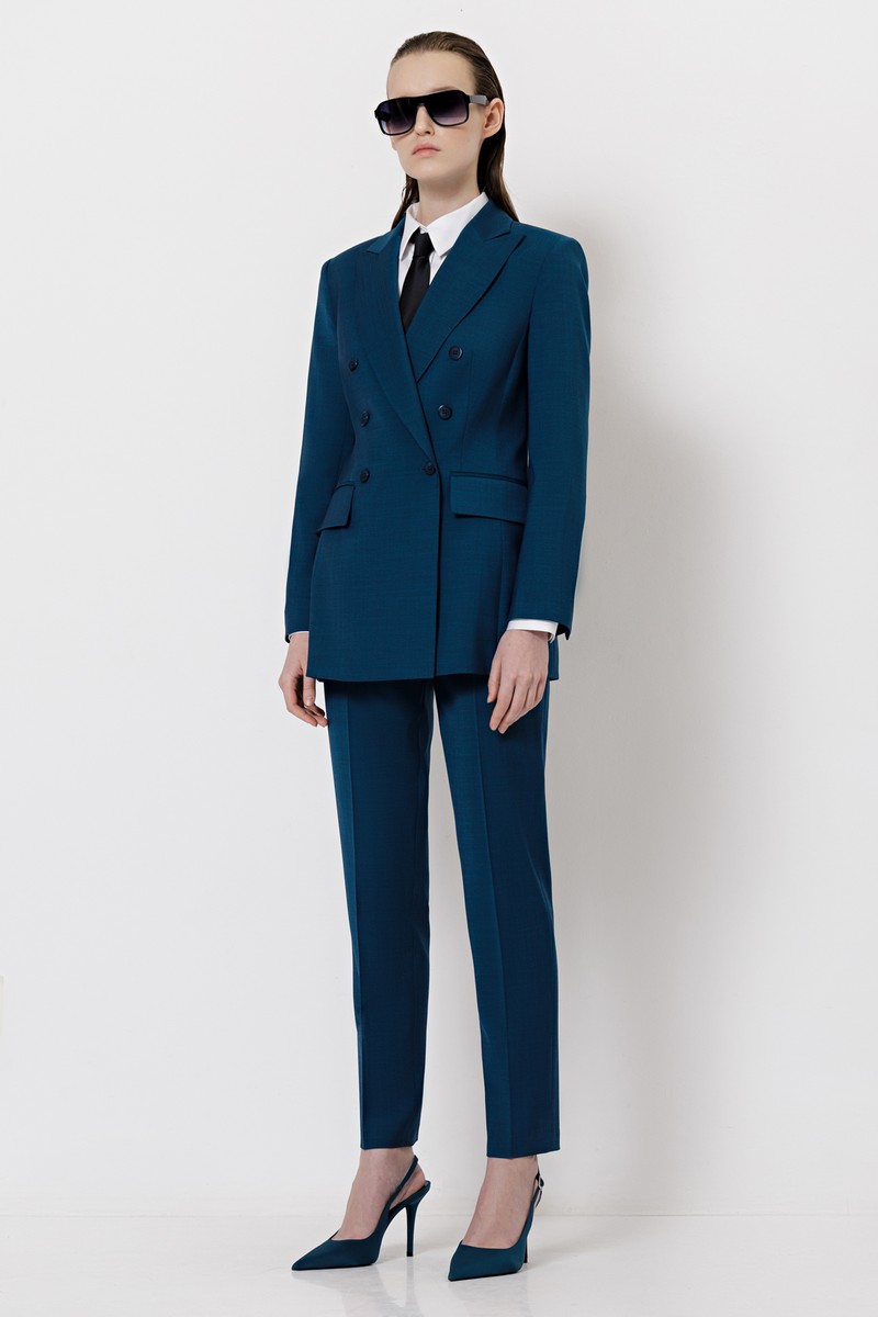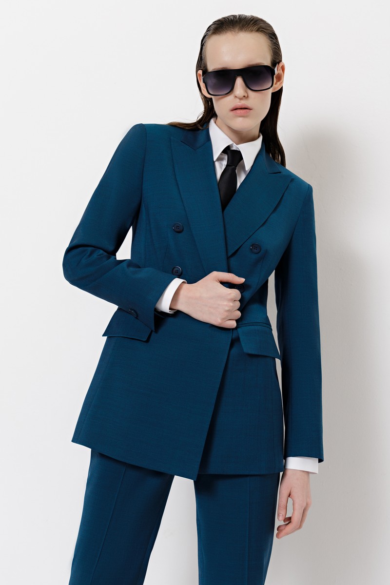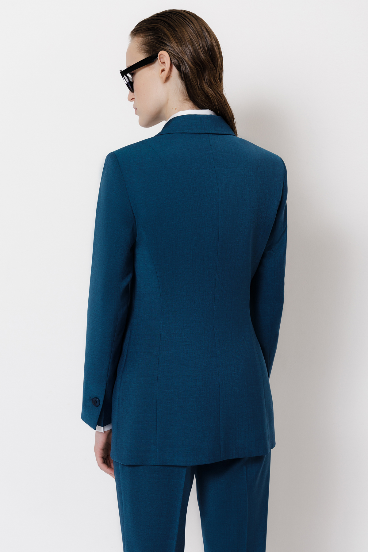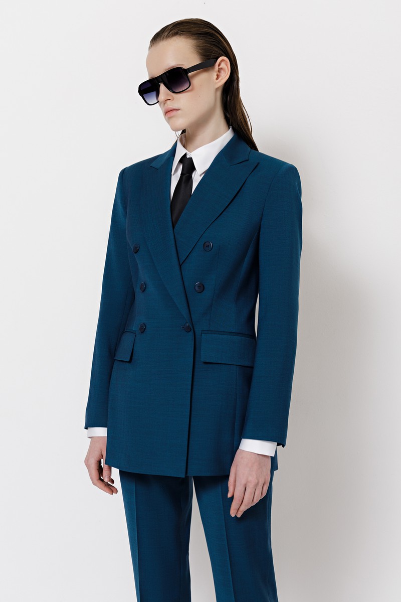 Двубортный жакет темно-синего цвета. Модель дополнена широкими лацканами, пуговицами и карманами с клапанами. Боковые вытачки формируют приталенный силуэт. Плотная костюмная ткань хорошо держит форму и не деформируется. Создайте классический сет, дополнив жакет брюками из нашей коллекции.