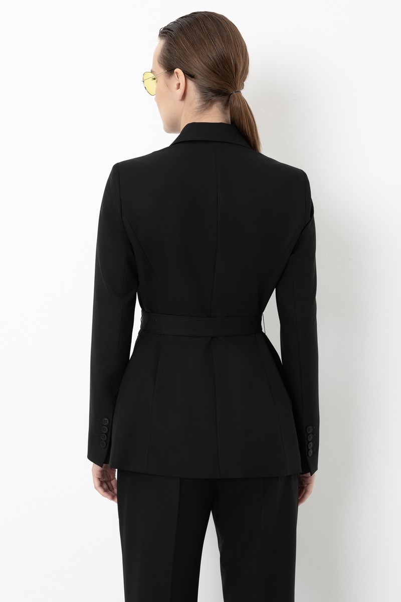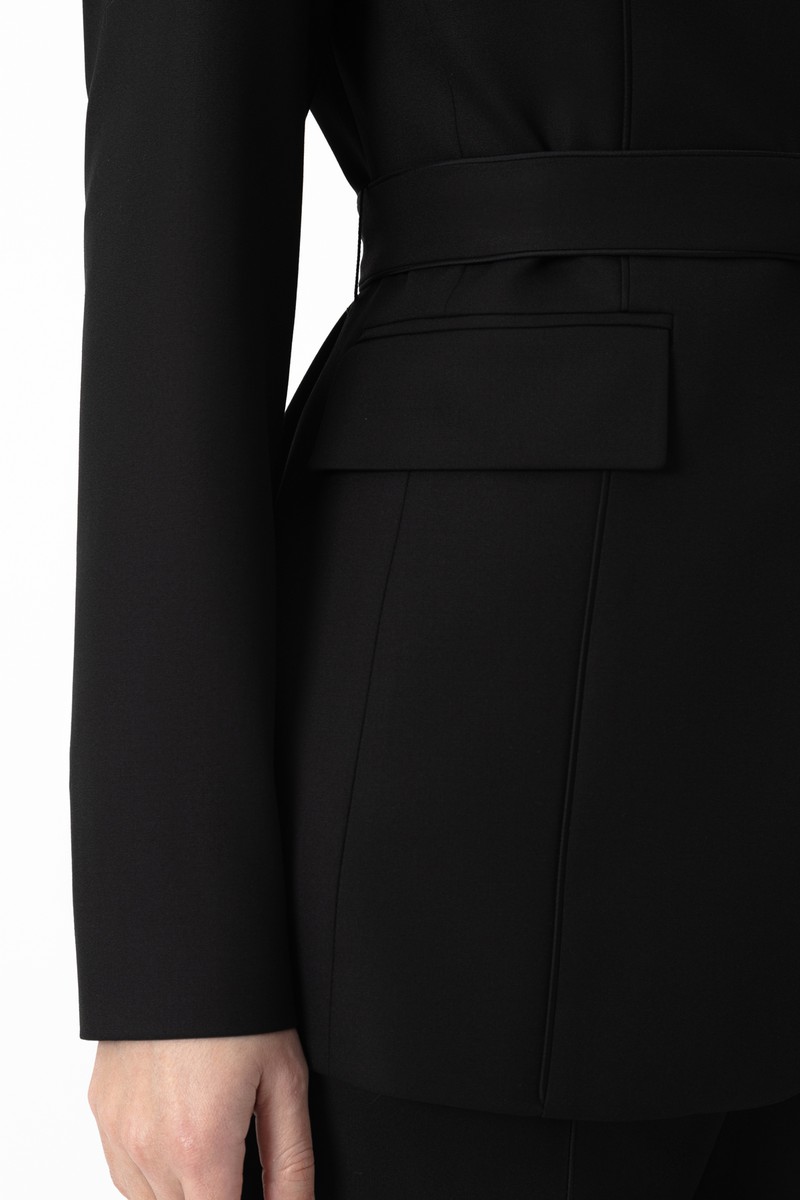 Однобортный жакет приталенного кроя из смесовой ткани с добавлением вискозы. Детали: пояс из основной ткани, графичные лацканы, застежка на пуговицу и карманы с клапанами. Модель дополнена объемными вытачками.