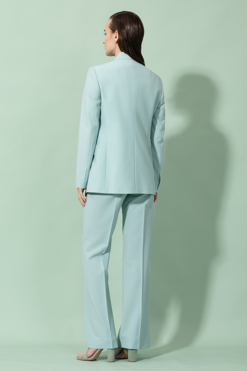 Двубортный жакет с контрастными пуговицами из смесовой костюмной ткани с добавлением шерсти. Модель прямого кроя дополнена графичными лацканами и нагрудным карманом. В комплекте с брюками в тон изделие образует деловой сет. Жакет доступен в трех цветах.