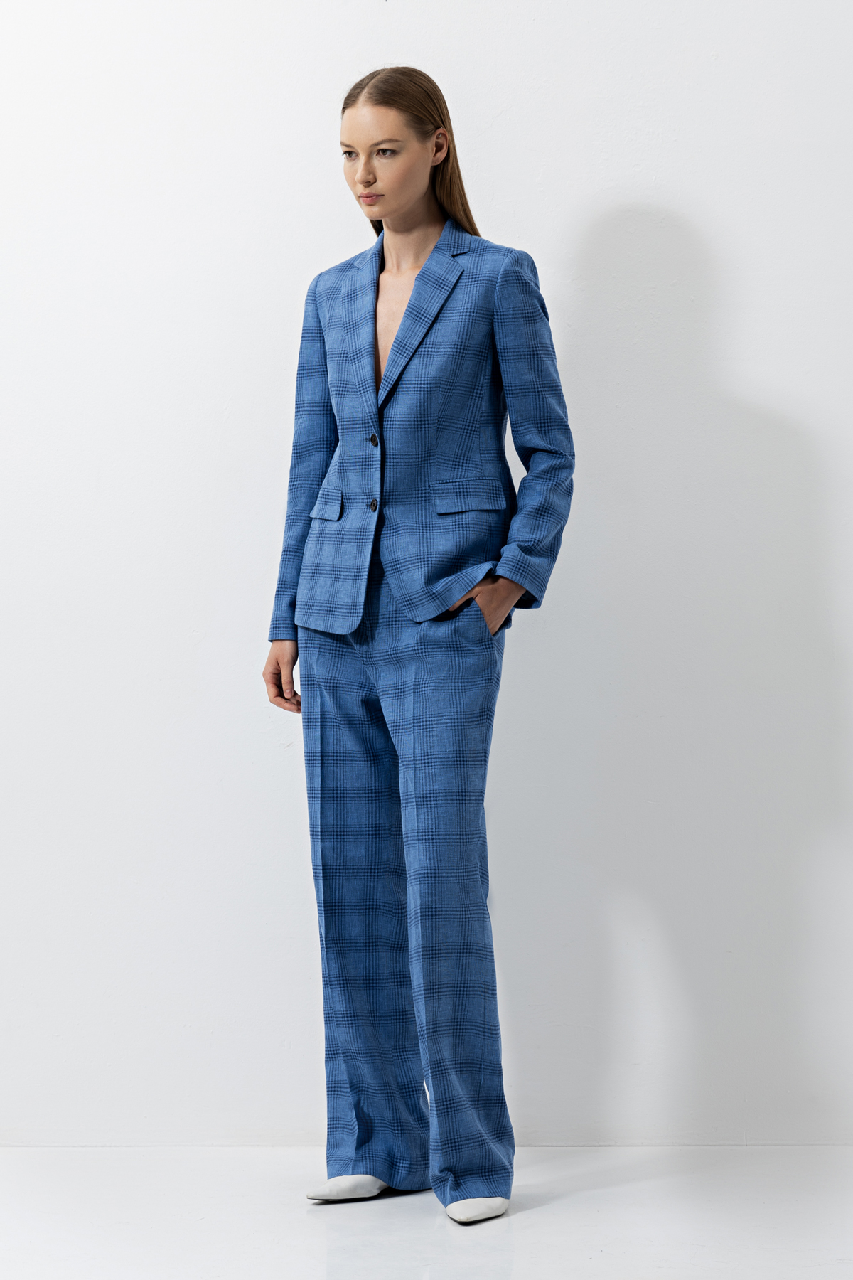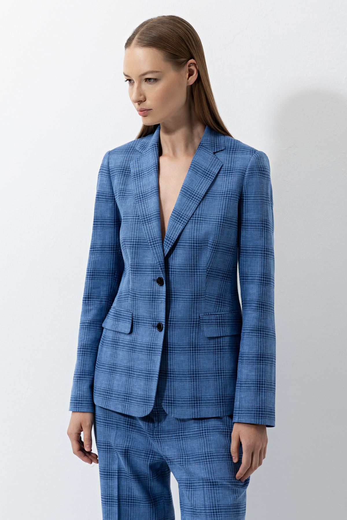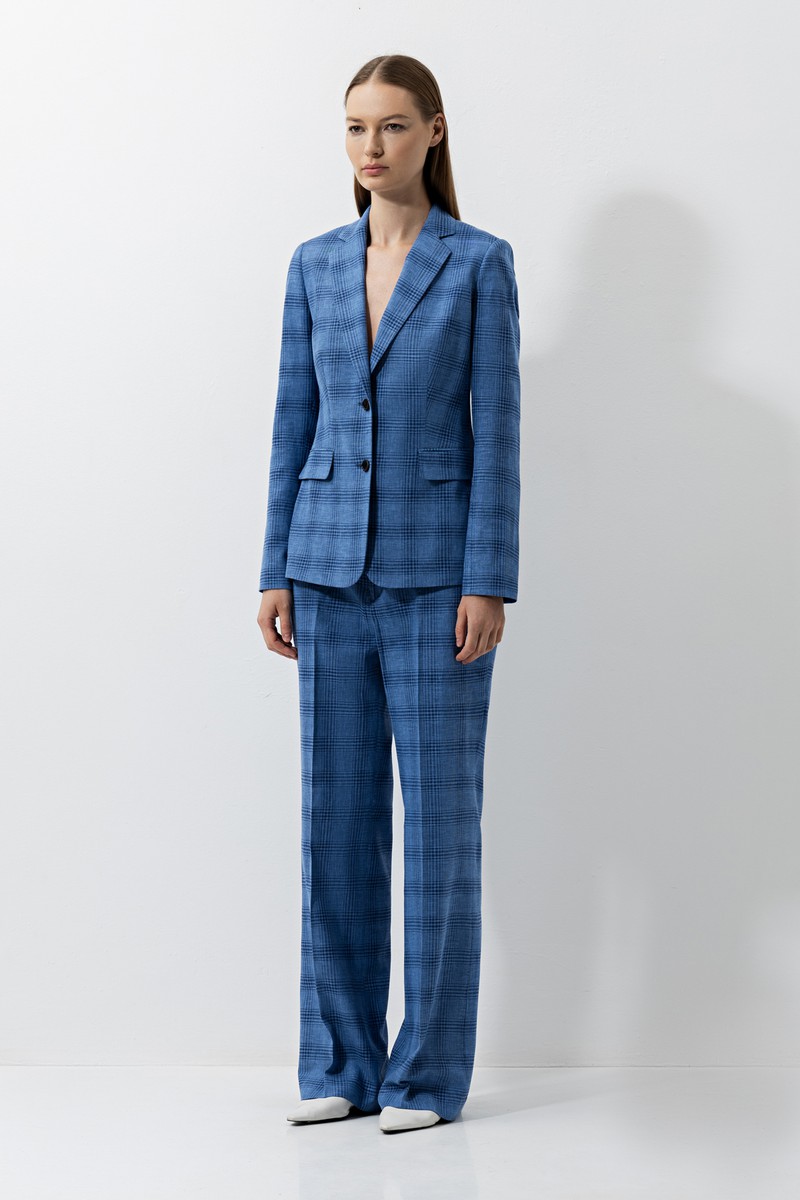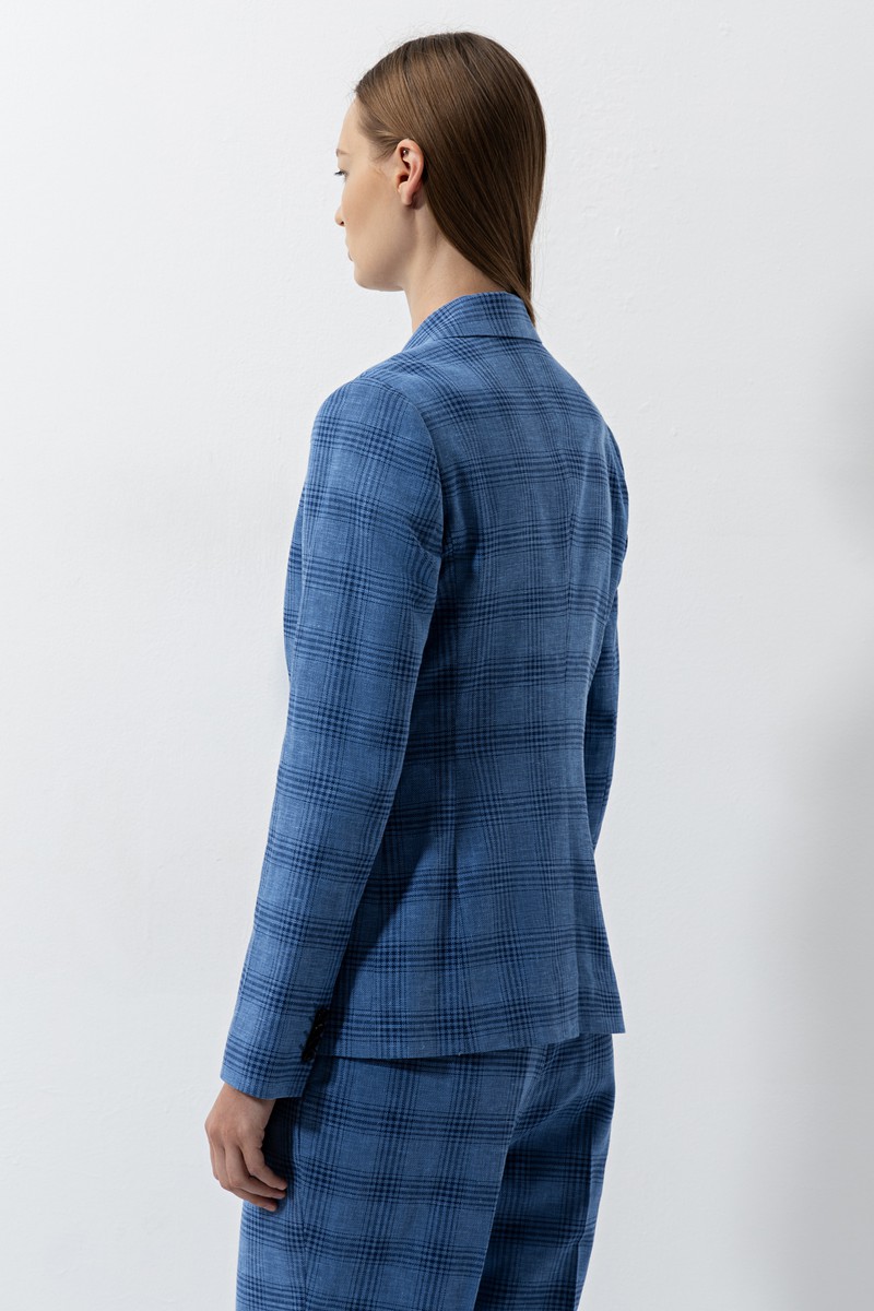 Приталенный жакет в клетку. Выполнен из микса льна и хлопка. Детали: лацканы, пуговицы в тон, имитация карманов и плотный подклад. Сочетайте жакет с брюками в тон из коллекции, чтобы сформировать лаконичный комплект.