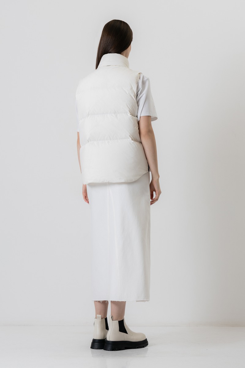 Утепленный жилет в спортивном стиле из прочного влагостойкого нейлона с наполнителем из натурального пуха и пера. Модель прямого кроя дополнена боковыми карманами, застежкой на молнию и воротником-стойкой. Боковые молнии позволяют менять фасов изделия, делая его более свободным.
