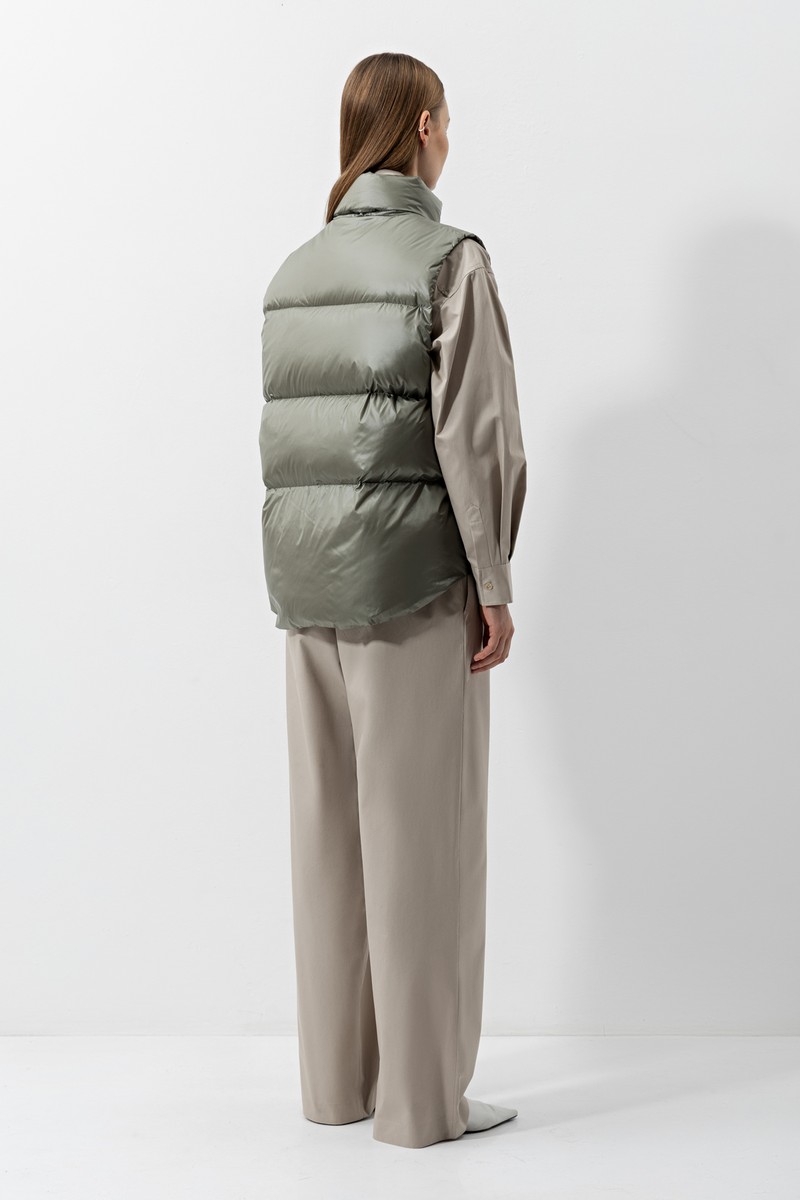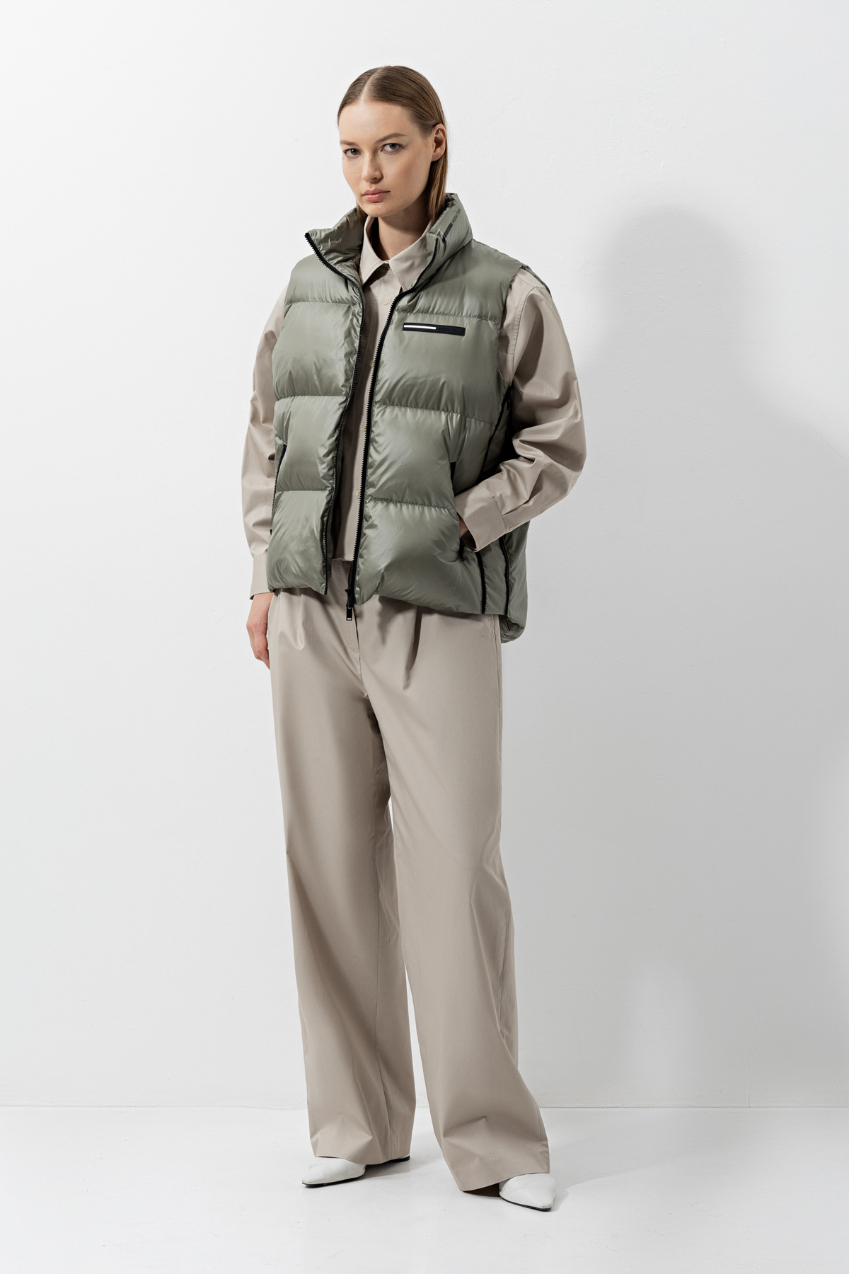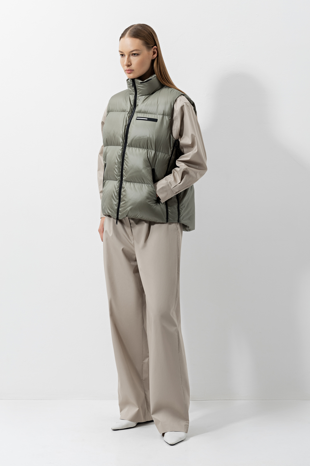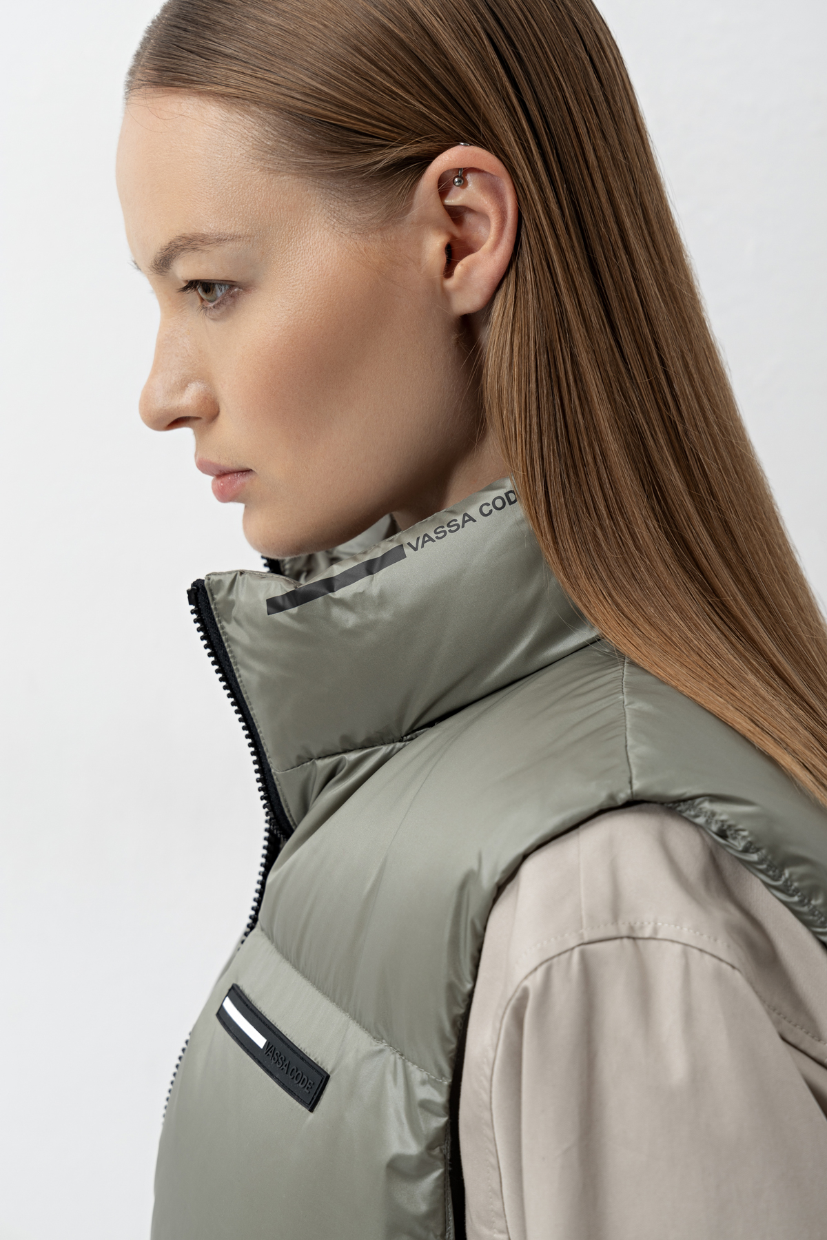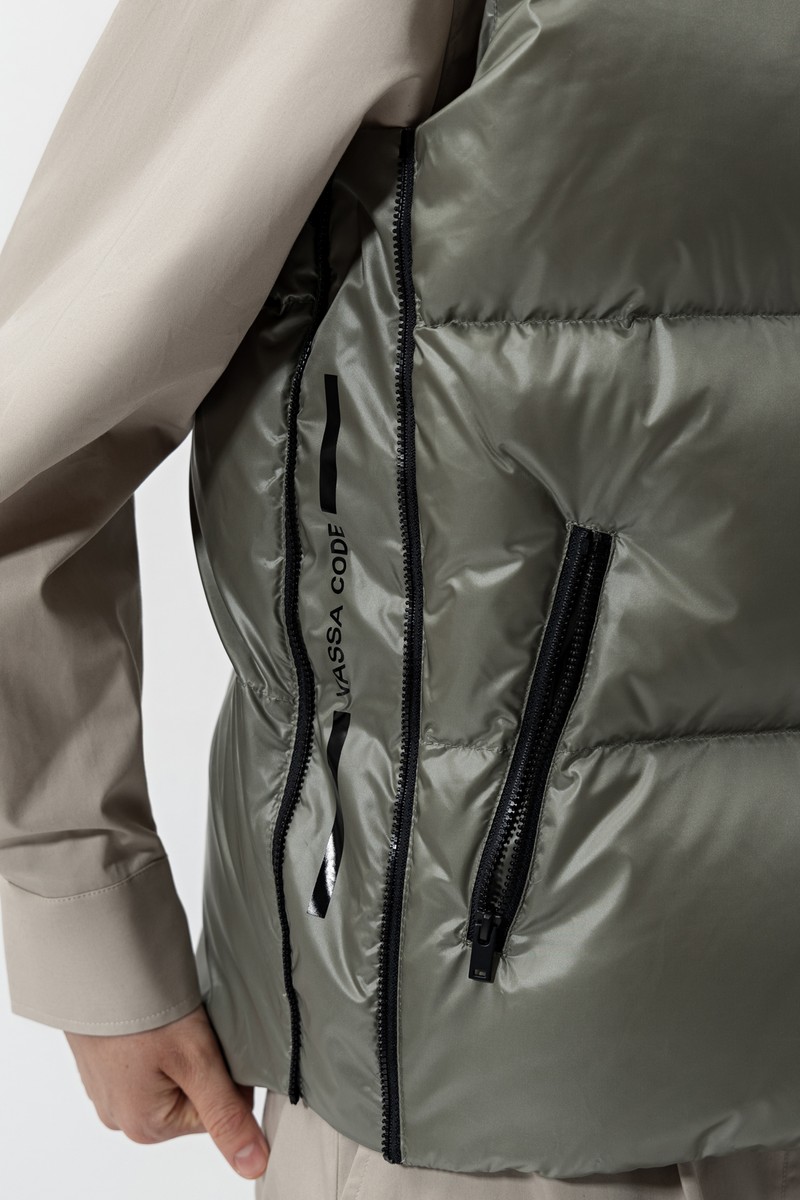 Утепленный жилет в спортивном стиле из прочного влагостойкого нейлона с наполнителем из натурального пуха и пера. Модель прямого кроя дополнена боковыми карманами, застежкой на молнию и воротником-стойкой. Боковые молнии позволяют менять фасов изделия, делая его более свободным.