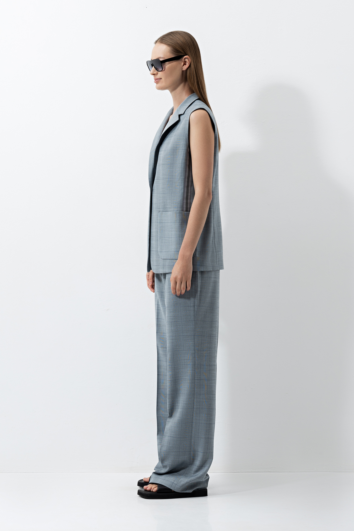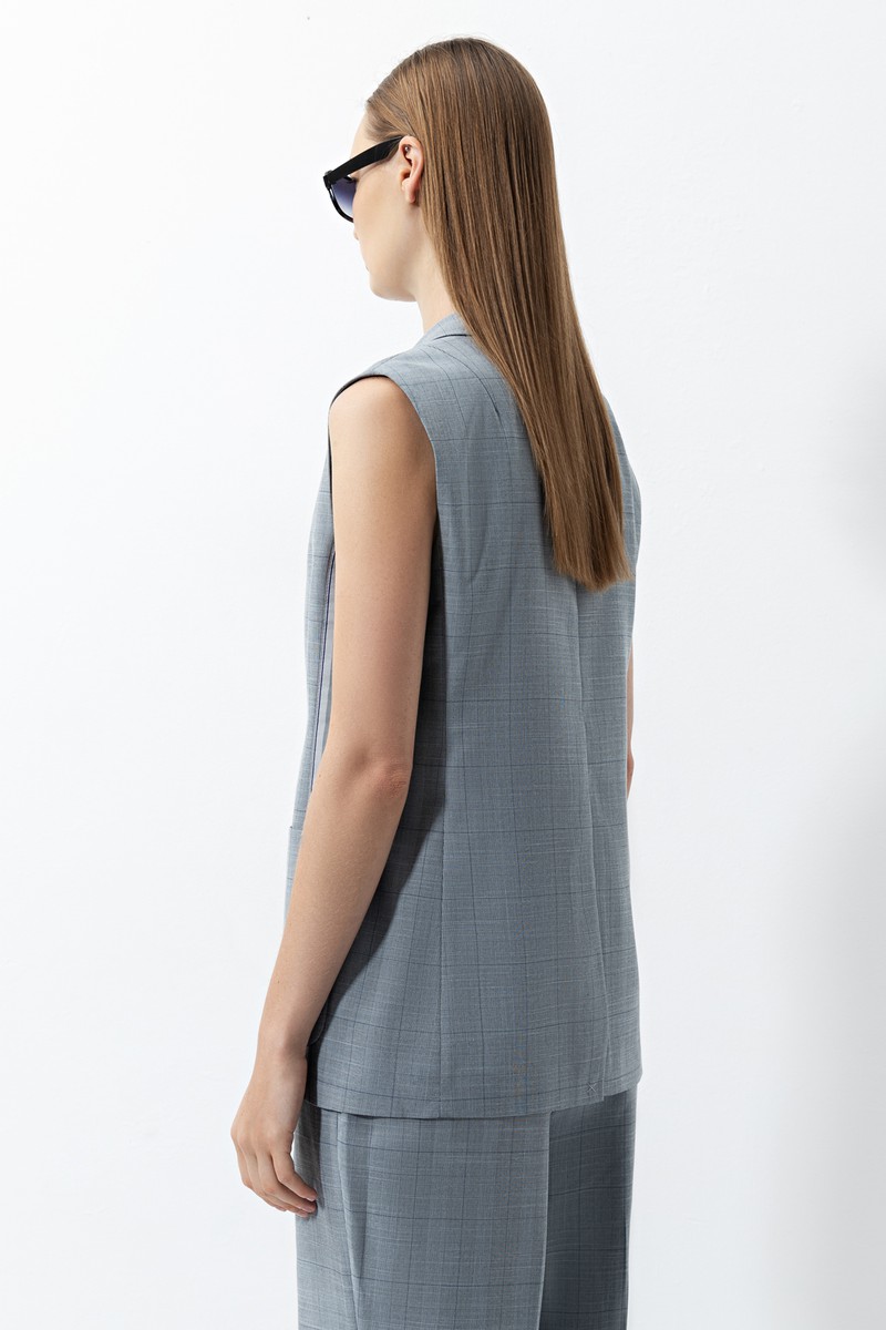 Серый жилет в клетку из смесовой ткани с добавлением вискозы. Модель свободного кроя. Детали: застежка на пуговицах, накладные карманы и тесьма сбоку. Свободная посадка не стесняет движений и позволяет создавать многослойные образы. В паре с брюками в тон жилет формирует универсальный костюм в клетку.