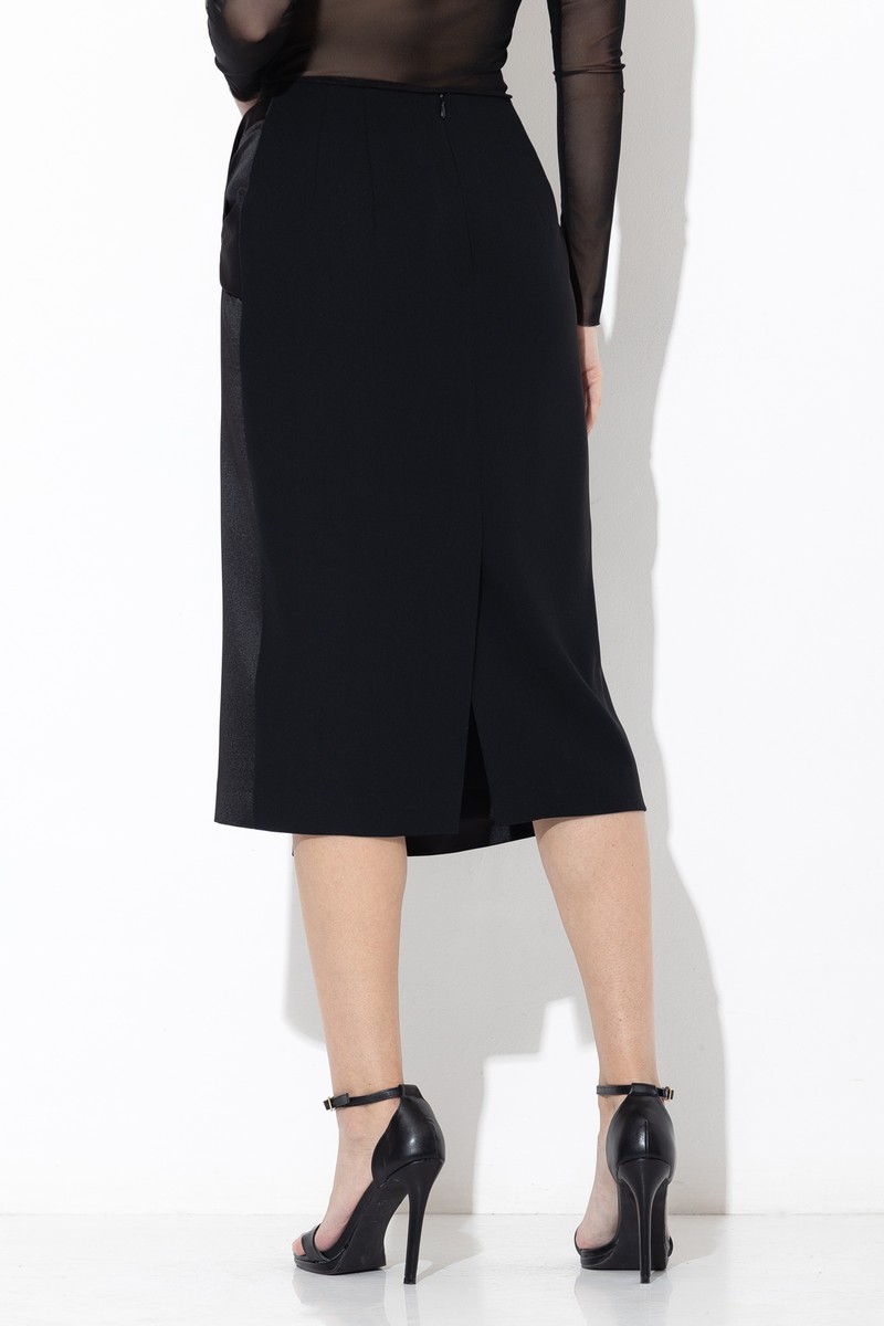 - юбки с лампасами, завышенной талией, деталями из экокожи и других материалов.